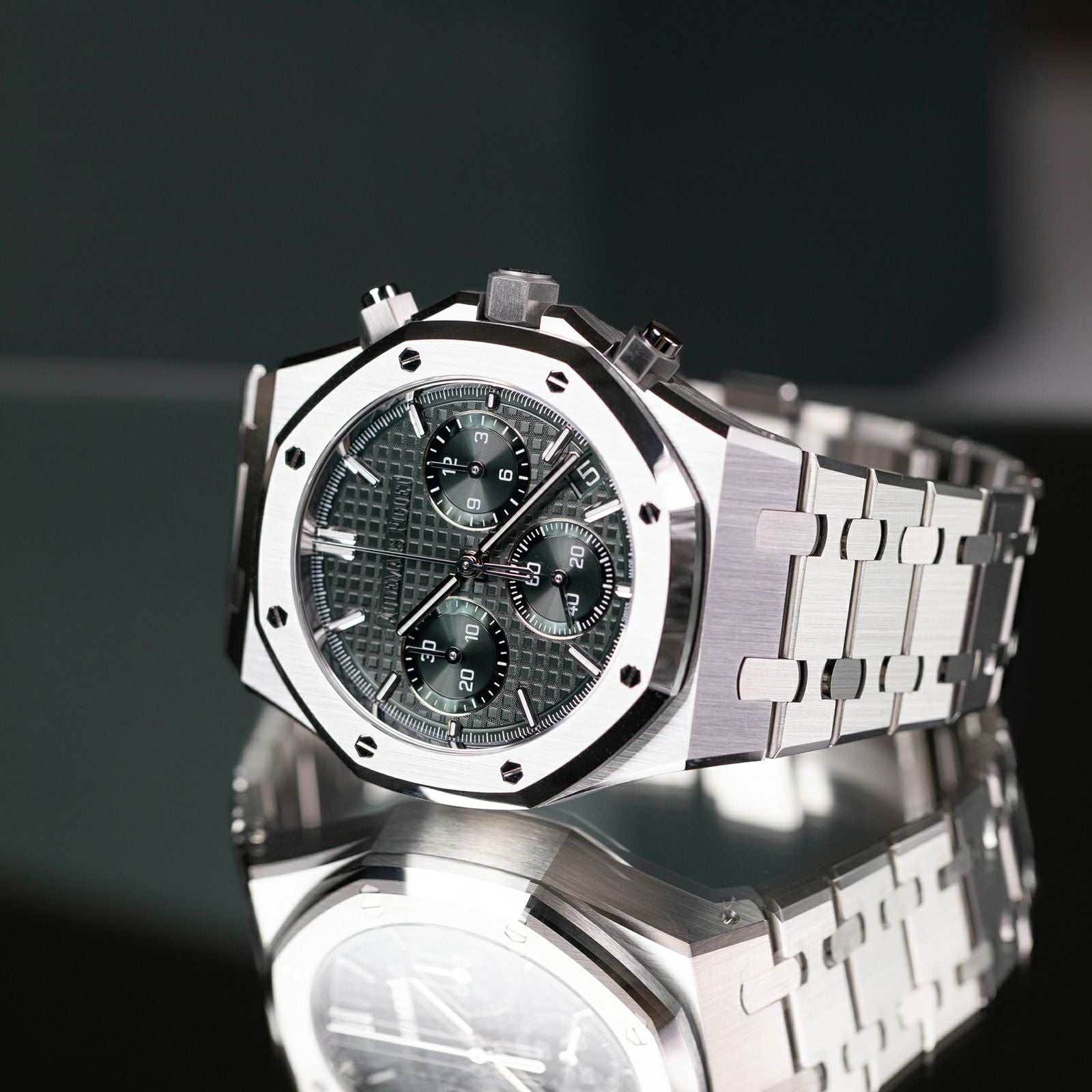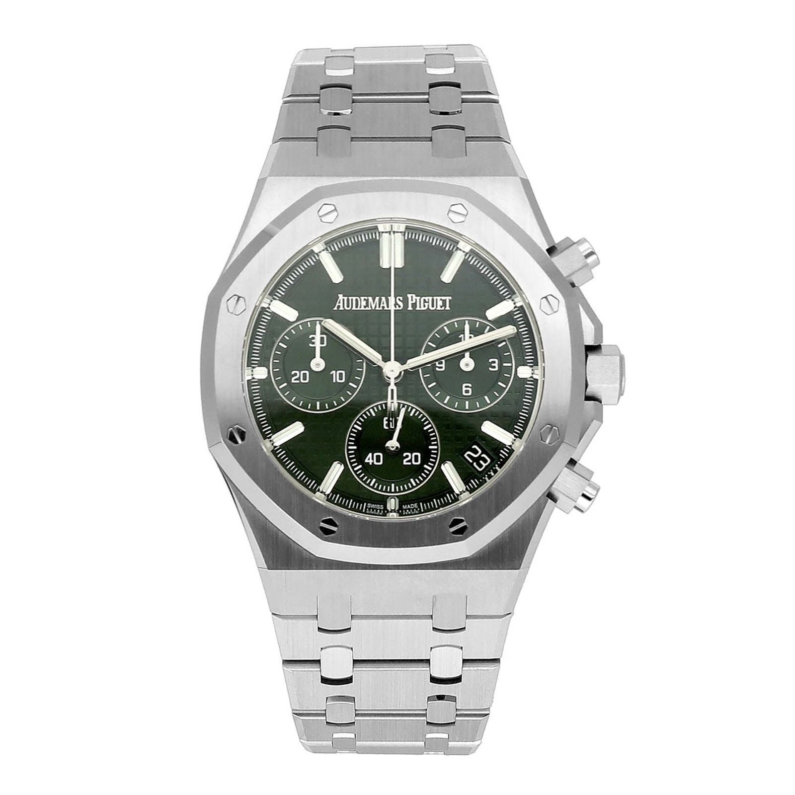 カーキグリーンの『グランドタペストリー』ダイヤルと、ケース&ブレスレットが一体となったデザインが特徴です。 流れるような曲線と、ヘアラインとポリッシュ仕上げのコントラストが際立ち、洗練された輝きを放っています。 41mmの自動巻クロノグラフは、最新のロイヤル オークデザインの進化を取り入れ、スタイルと機能性を両立しています。 完全自社製ムーブメントのCal.4401を搭載し、70時間のパワーリザーブを誇ります。 Audemars Piguetの技術と美が凝縮されています。