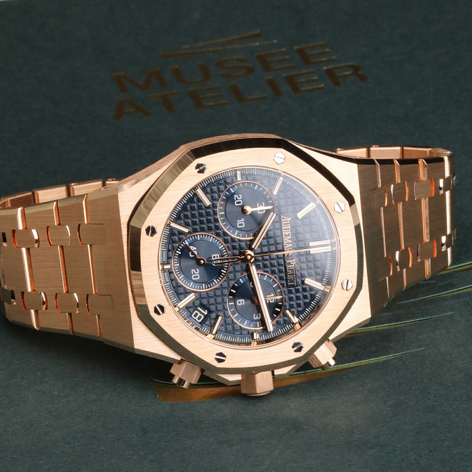 ロイヤルオークのアイコン性はそのままに、18KピンクゴールドדBleu Nuit, Nuage 50(ナイトブルー)”のグランド・タペストリー文字盤で、ラグジュアリー感を一段引き上げた1本です。41mmの王道サイズで、ピンクゴールドの艶とヘアライン仕上げがしっかり効くので、腕に乗せると“質感で勝負してる感”が一発で伝わります。