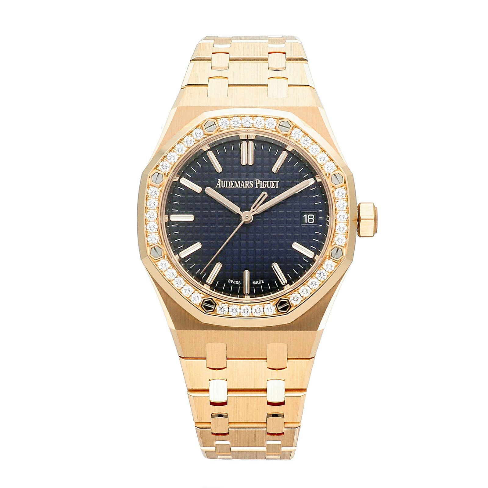 ピンクゴールドのケースには贅沢にダイヤモンドがあしらわれ、ベゼルには美しいブルーサファイアがセッティングされており、まばゆい輝きを放ちます。文字盤には鮮やかなライトブルーの「グランドタペストリー」模様が施され、同色のアリゲーターストラップとの絶妙なコーディネートで、統一感のある上品なデザインが特徴です。 さらに、APフォールディングバックルにもダイヤモンドがセットされ、細部に至るまで輝きが増しています。37mmというやや大きめのケースサイズながら、女性の手首にエレガントで華やかな印象をもたらす、洗練された一本です。