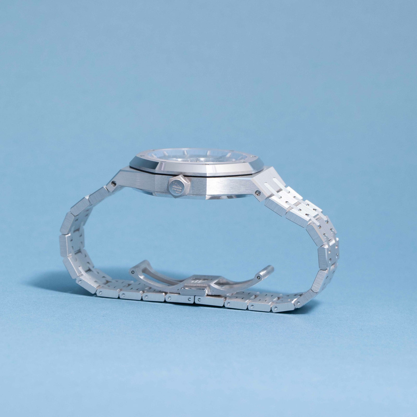 全体を同系色でまとめながら、ライトブルーのインナーベゼルが繊細な彩りを添え、エレガントかつモダンな印象を演出。上品さと力強さを兼ね備えたタイムピースです。