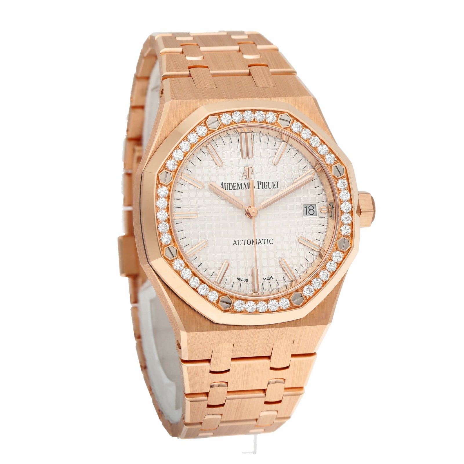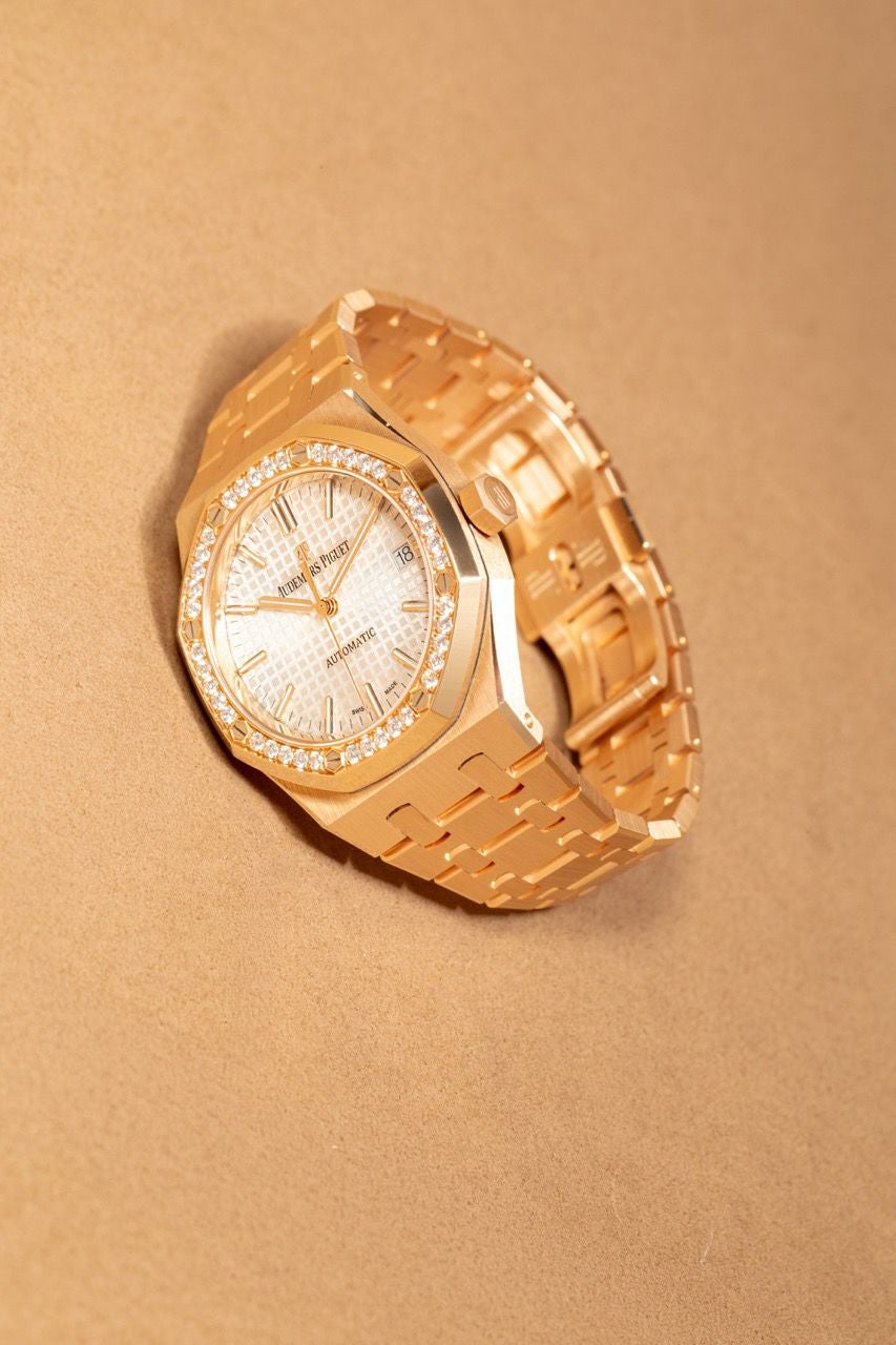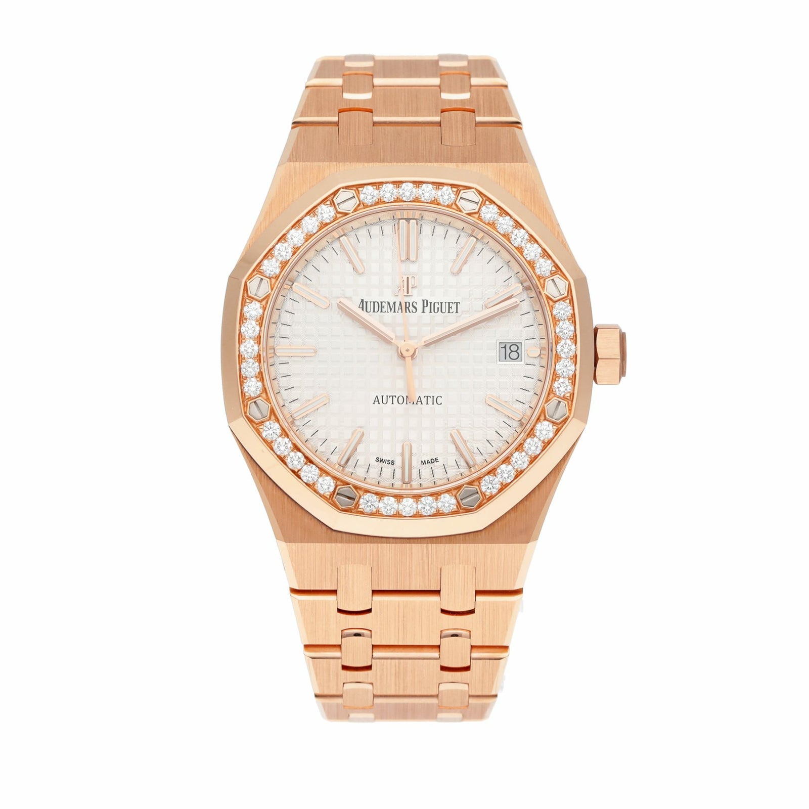 ロイヤルオークのアイコン性はそのままに、ピンクゴールド×ダイヤベゼルで“上品に華やぐ”雰囲気を作った37mmモデルです。ケース&ブレスは18Kピンクゴールドで、ロイヤルオーク特有のヘアラインと面取りがしっかり効くので、ジュエリー感がありつつも甘くなりすぎません。