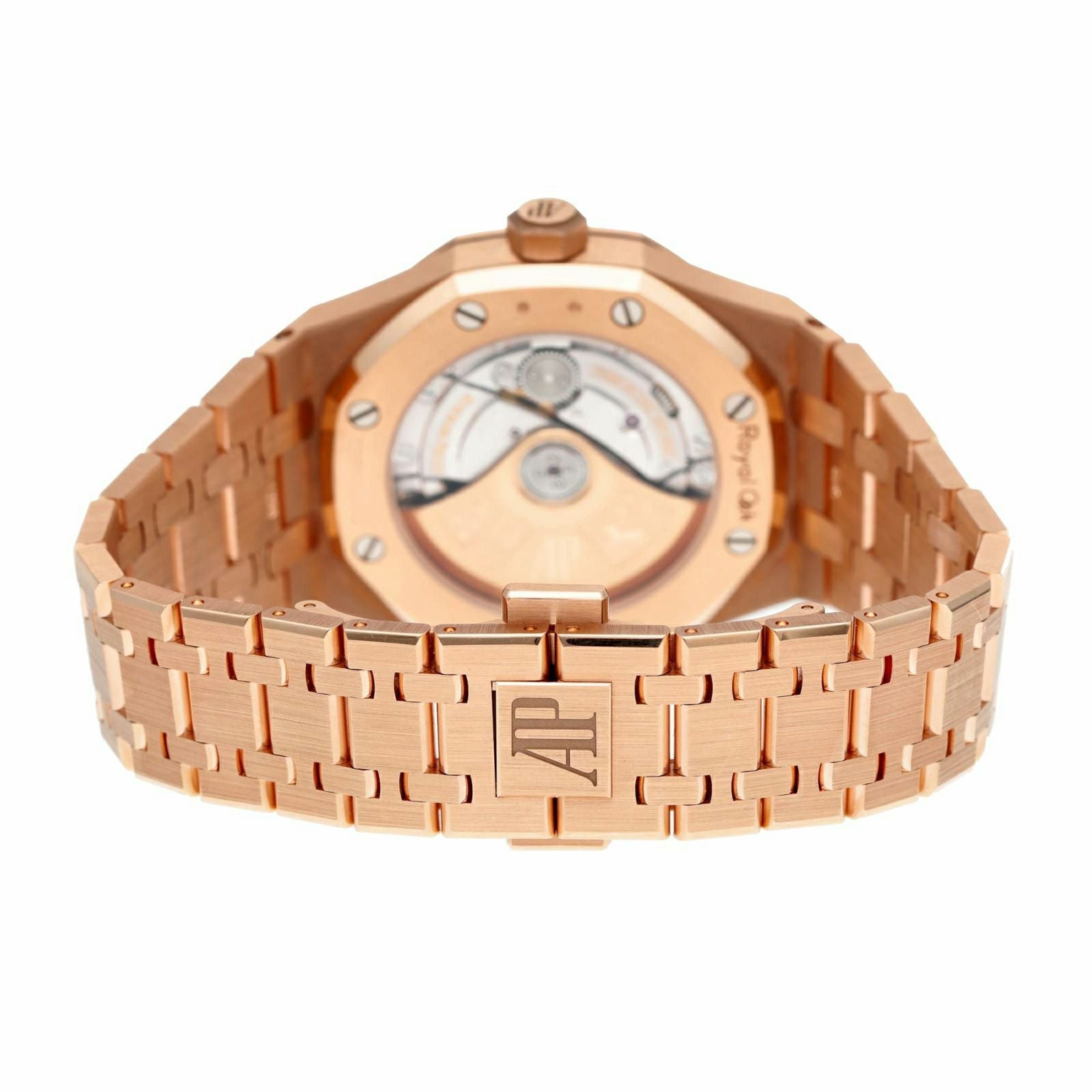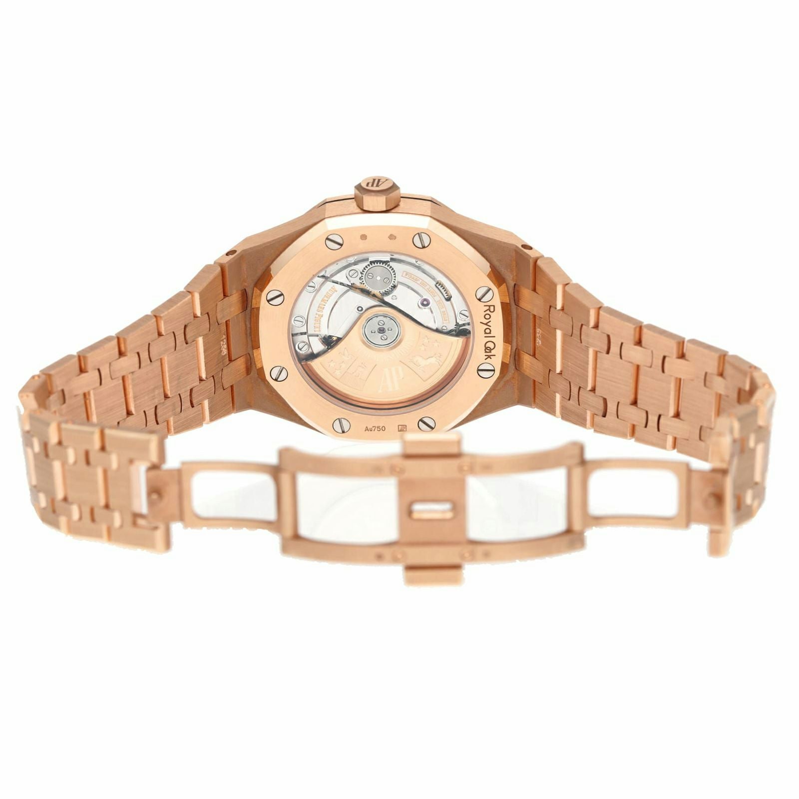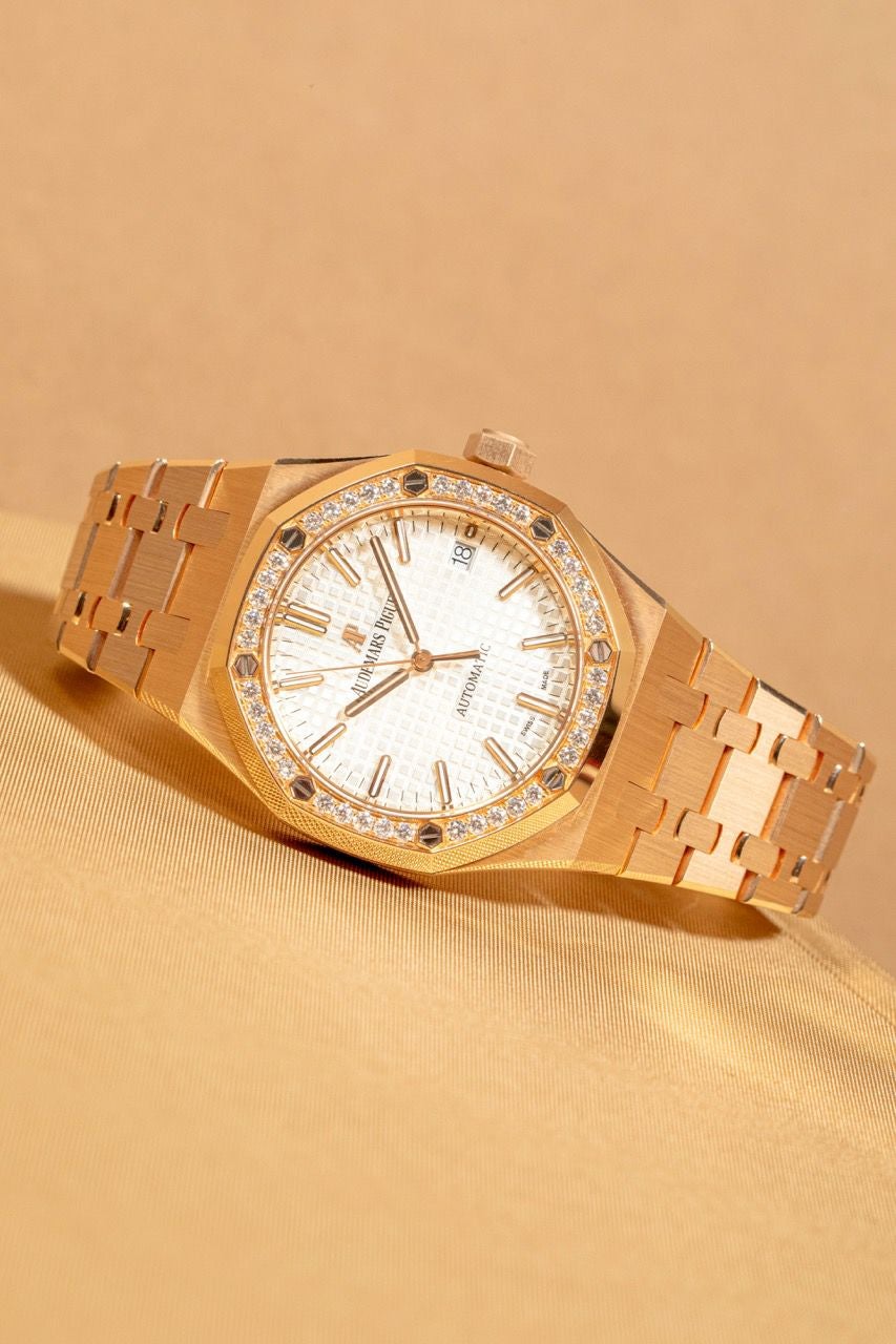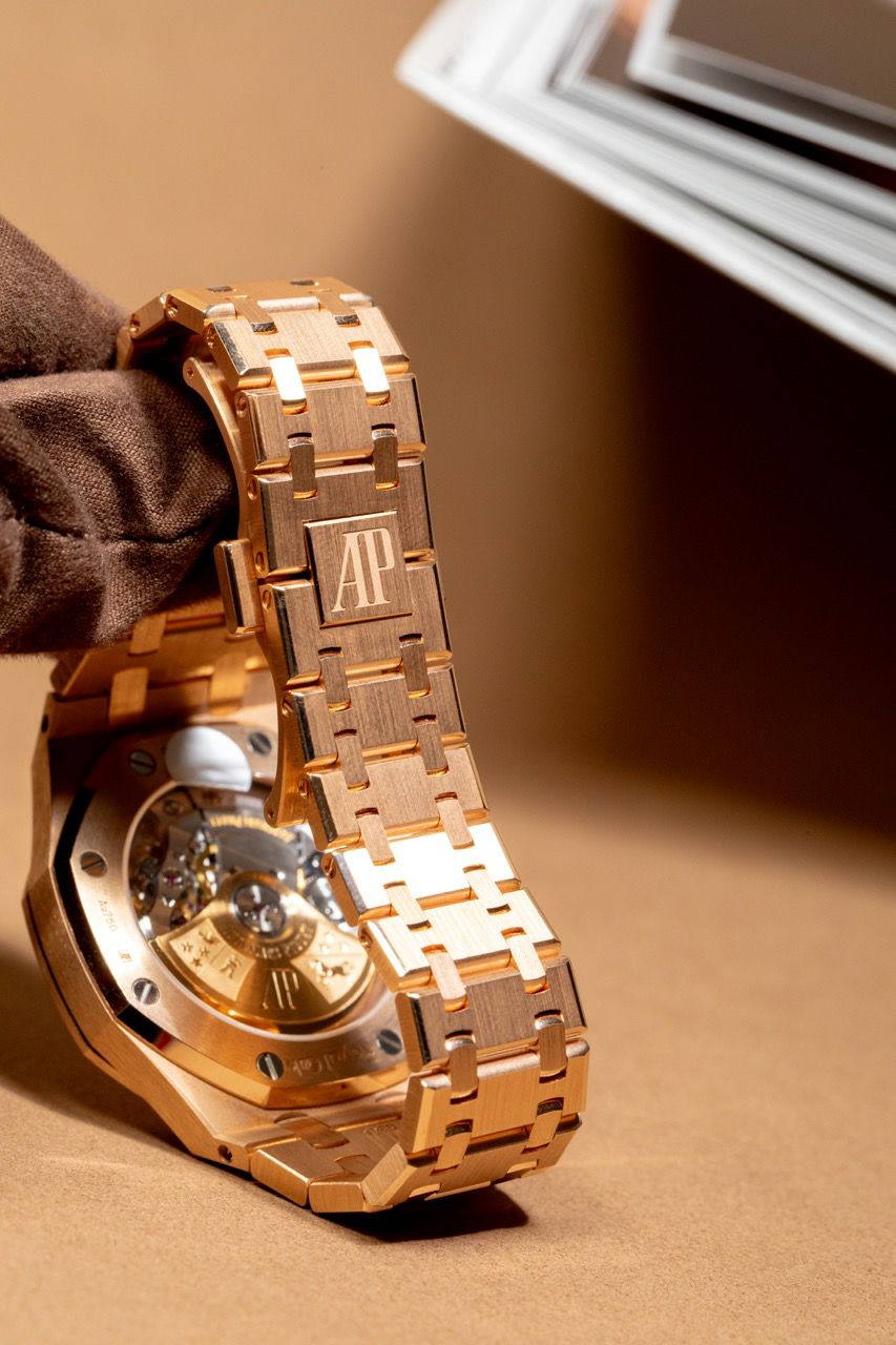 ロイヤルオークのアイコン性はそのままに、ピンクゴールド×ダイヤベゼルで“上品に華やぐ”雰囲気を作った37mmモデルです。ケース&ブレスは18Kピンクゴールドで、ロイヤルオーク特有のヘアラインと面取りがしっかり効くので、ジュエリー感がありつつも甘くなりすぎません。