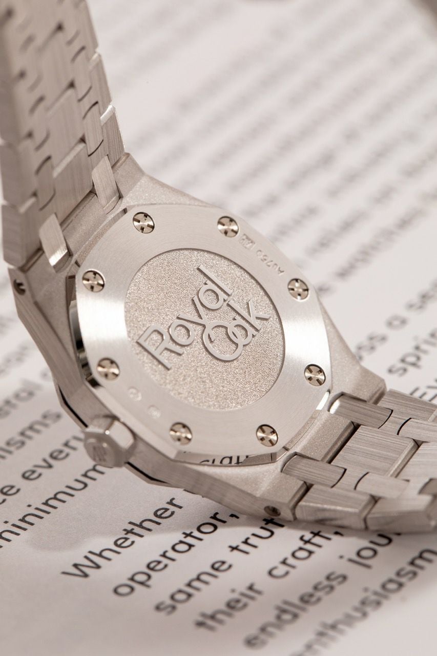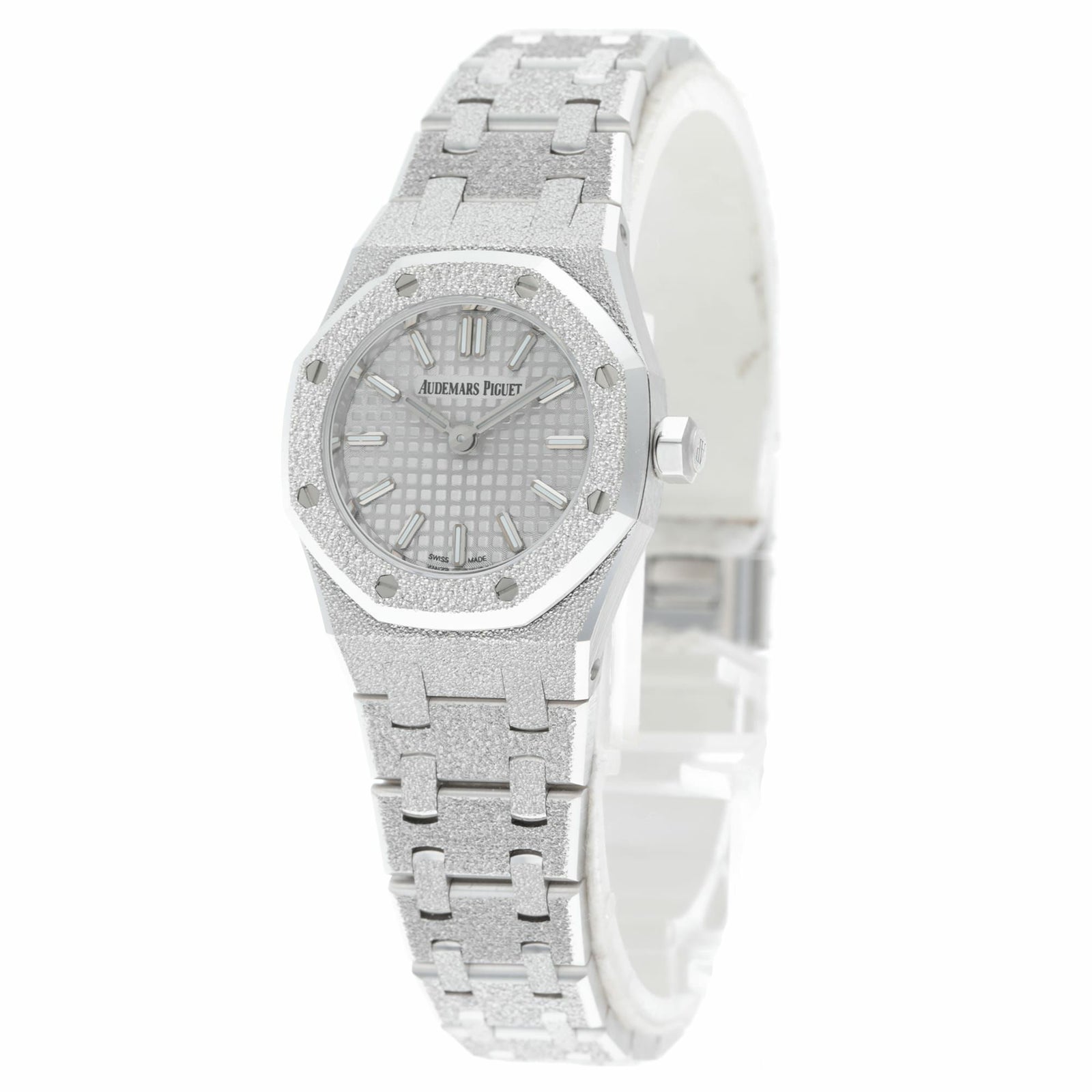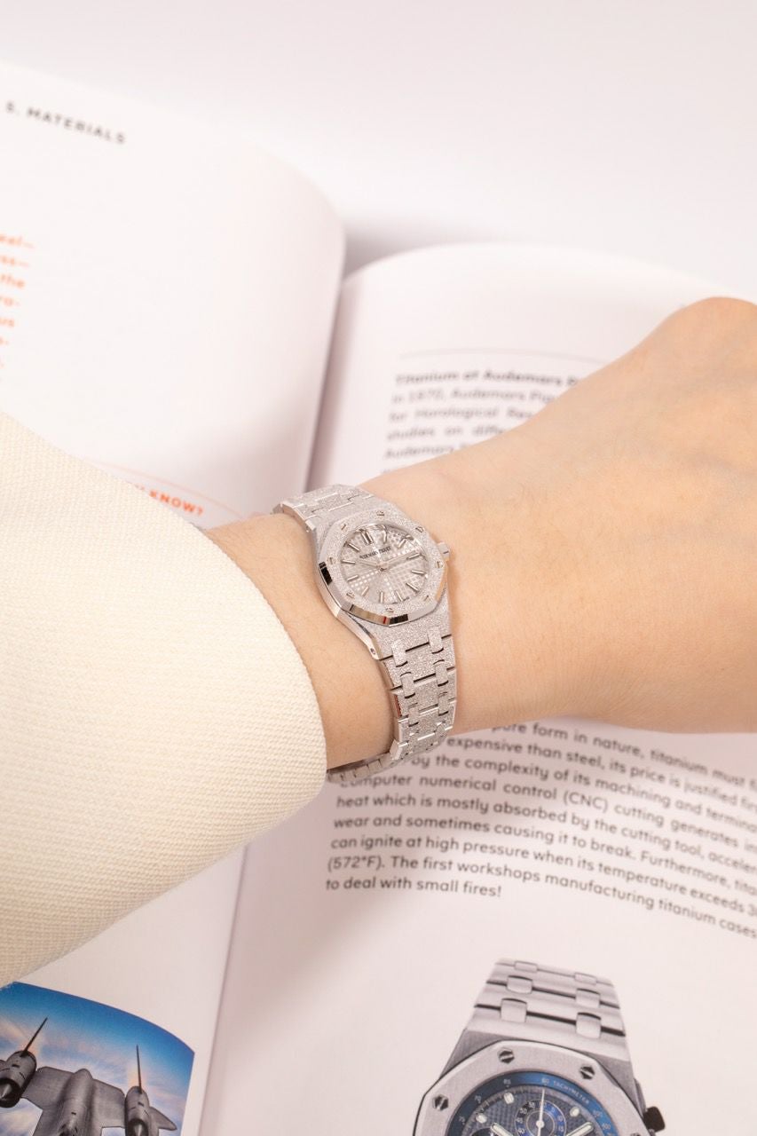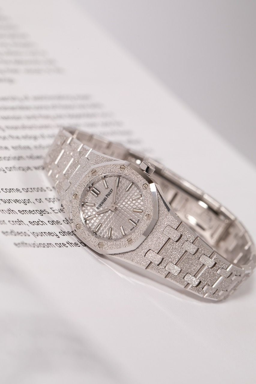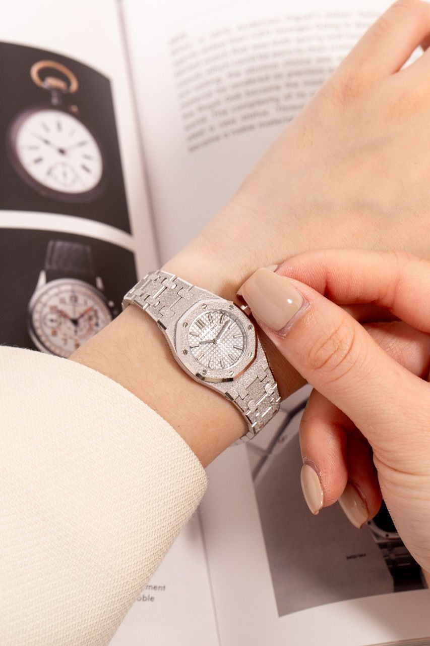 ロイヤルオークのアイコンデザインを23mmのミニサイズに凝縮しつつ、全面に施されたフロステッド(鍛金加工のような煌めき)で“ジュエリー感”を一気に引き上げた一本です。厚さも6.6mmと薄く、ホワイトゴールドの上品さと軽快な着け心地が両立します。