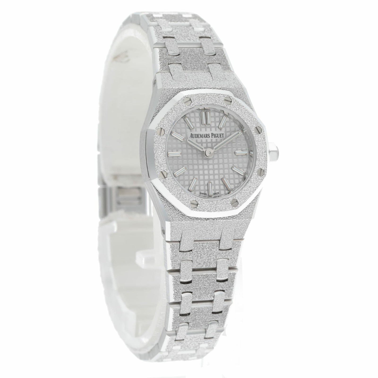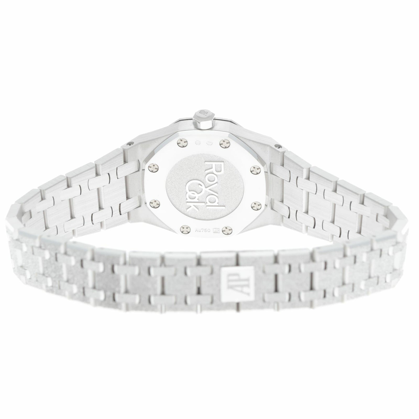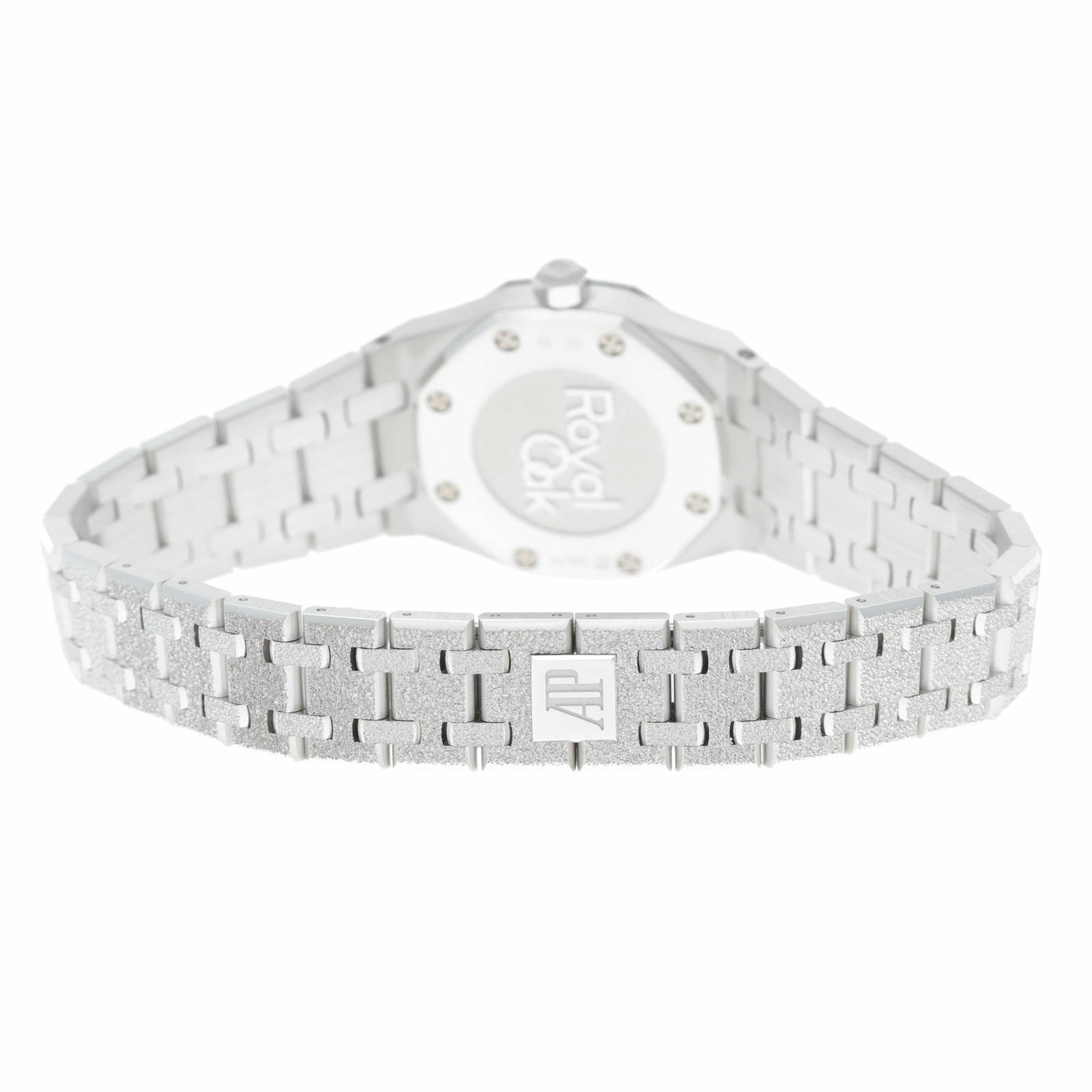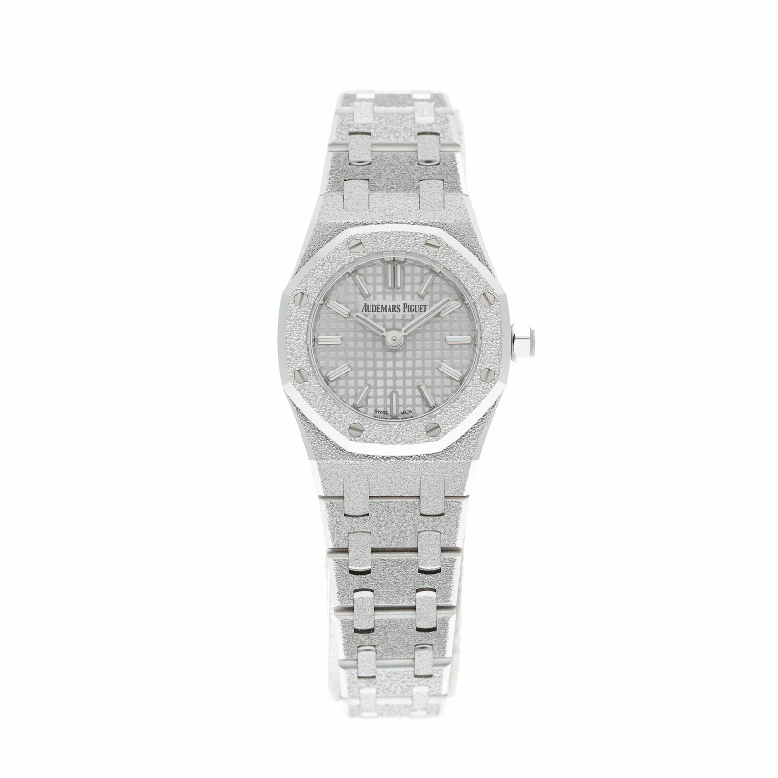 ロイヤルオークのアイコンデザインを23mmのミニサイズに凝縮しつつ、全面に施されたフロステッド(鍛金加工のような煌めき)で“ジュエリー感”を一気に引き上げた一本です。厚さも6.6mmと薄く、ホワイトゴールドの上品さと軽快な着け心地が両立します。