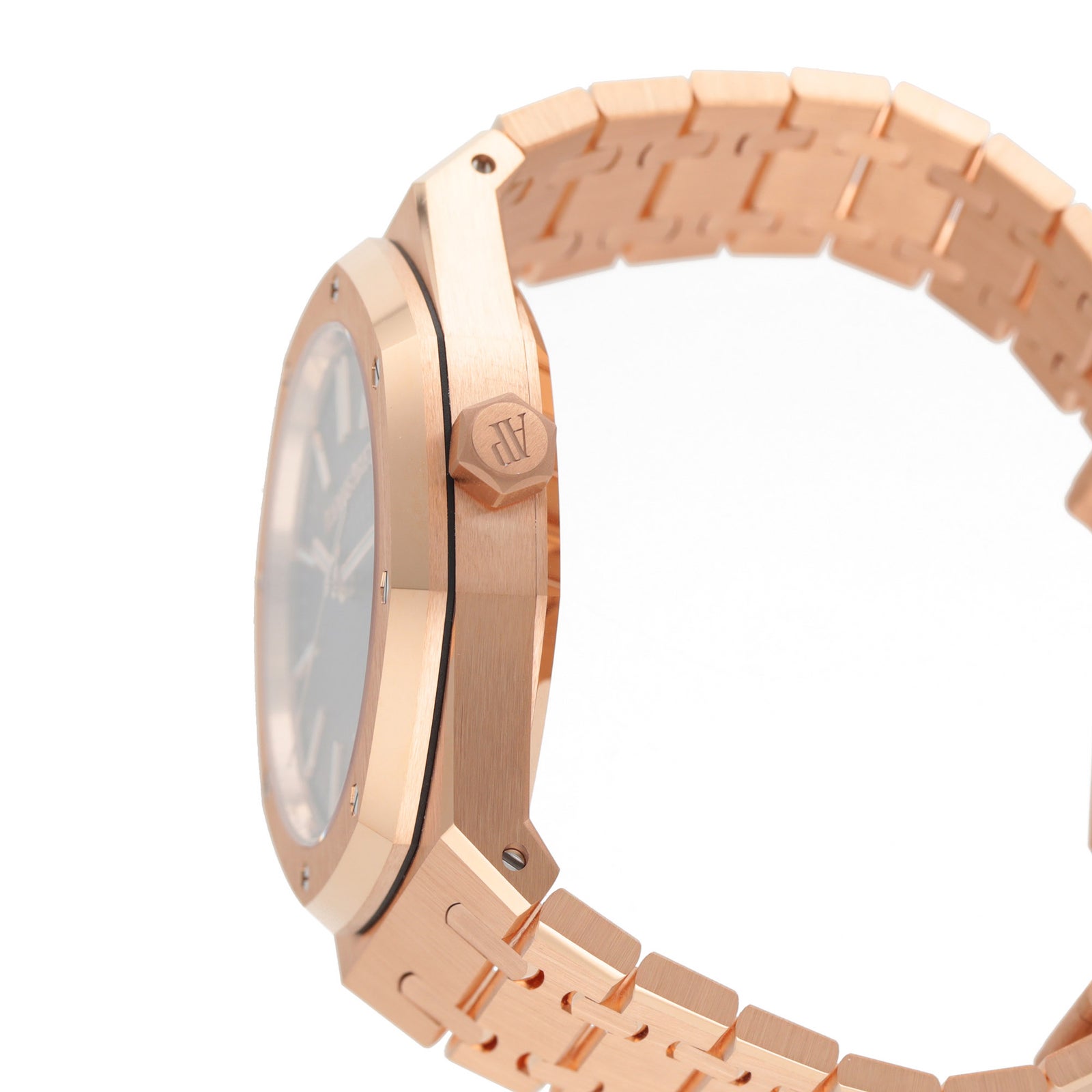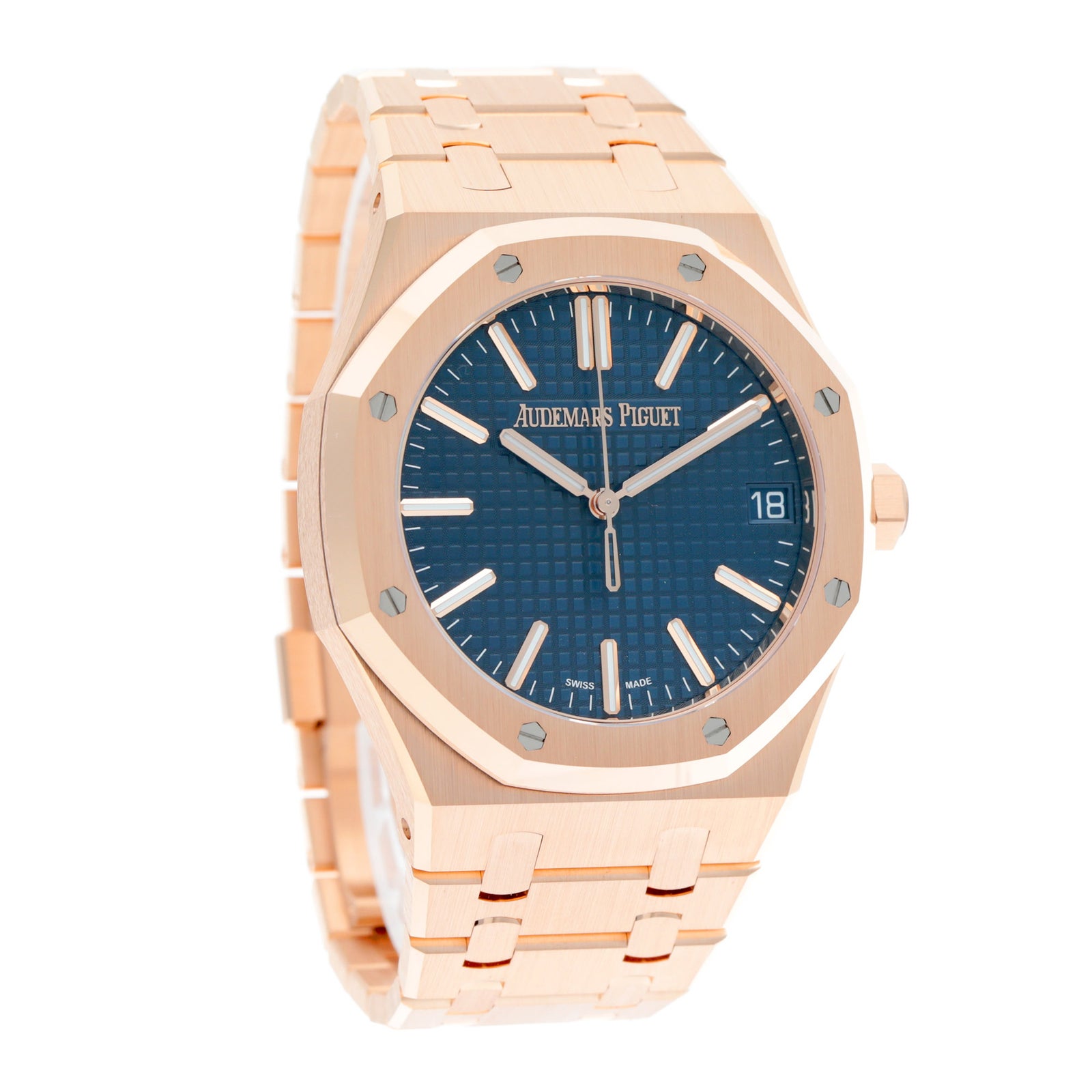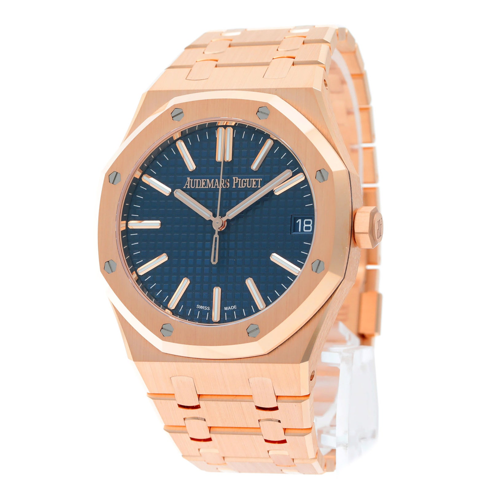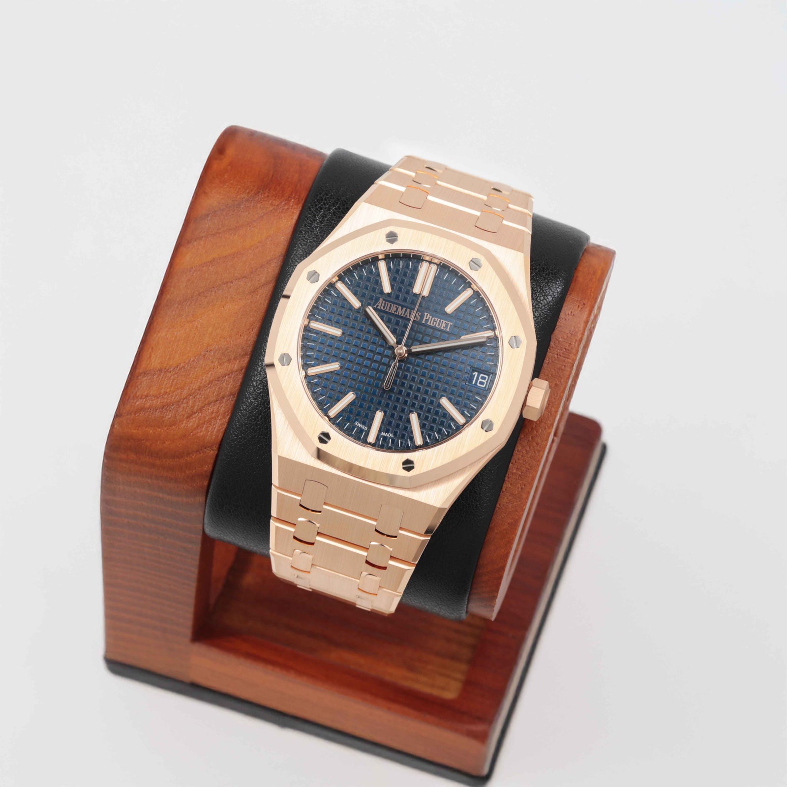 18Kピンクゴールドの華やかさに、“Bleu Nuit, Nuage 50”のグランド・タペストリー文字盤を合わせた、王道かつ非常に完成度の高い一本です。41mmケースで存在感はしっかりありながら、ロイヤルオーク特有のヘアラインと面取りのコントラストが美しく、派手というより“質感で魅せる”高級感が際立ちます。