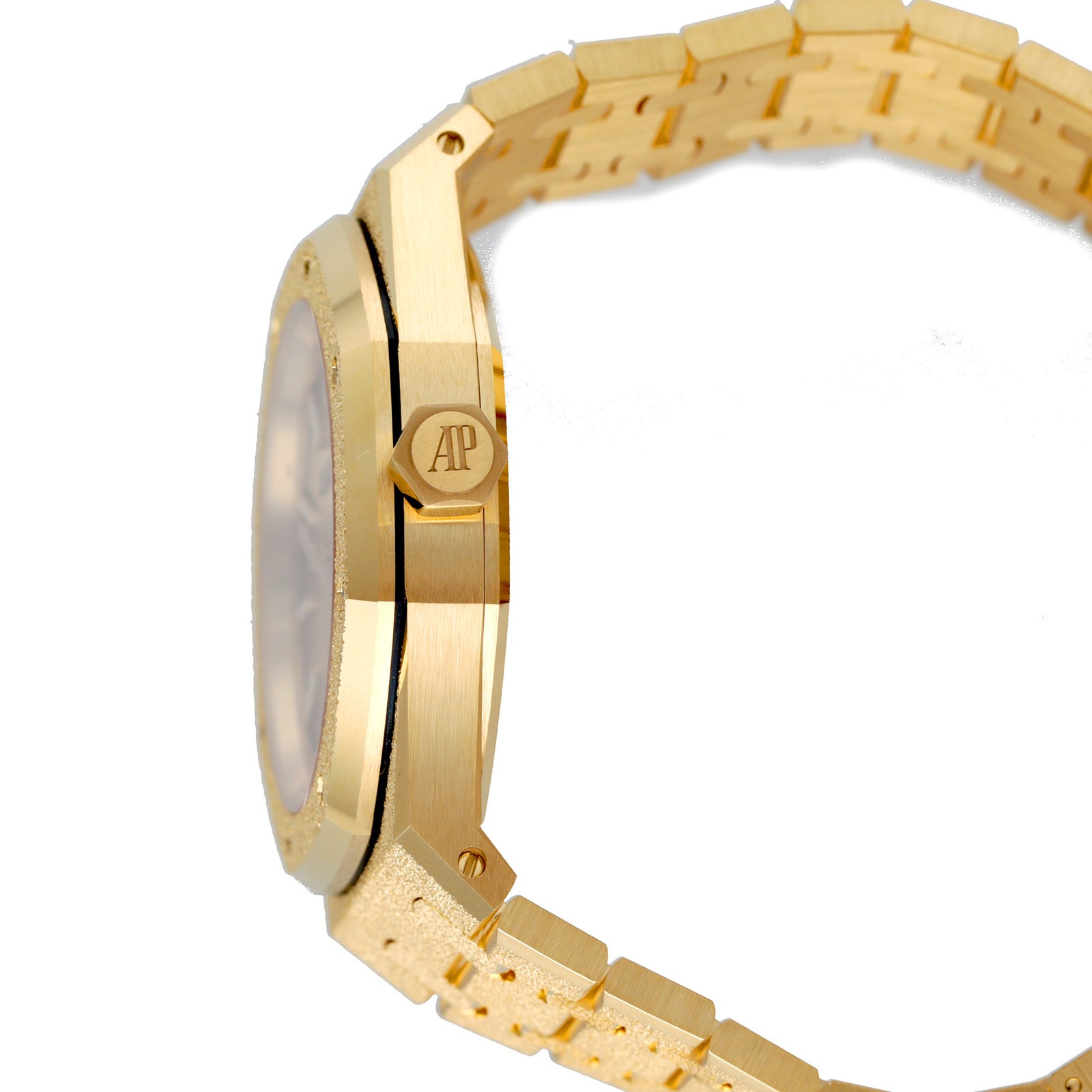 オーデマ ピゲとカローリン・ヴィットマーが生み出した奇跡のコラボレーション、ロイヤル オーク フロステッドゴールド。15550BA.GG.1356BA.01は、古代フィレンツェの金細工師の技法「ハンマリング」をケースとブレスレット全面に施し、無数のダイヤモンドダストが舞うかのような幻想的な煌めきを実現した、唯一無二の傑作です。イエローゴールドの温かみある輝きが、フロスト加工によって全く新たな表情へと昇華し、光の角度によって刻々と変化する神秘的な輝きは、見る者を魅了してやみません。ロイヤル オークが誇る八角形ベゼルの普遍的なデザインと、精緻な自動巻きムーブメントの確かな実力を礎に、宝飾芸術の極致へと到達した本作は、真のコレクターにのみ許された、孤高の至宝です。