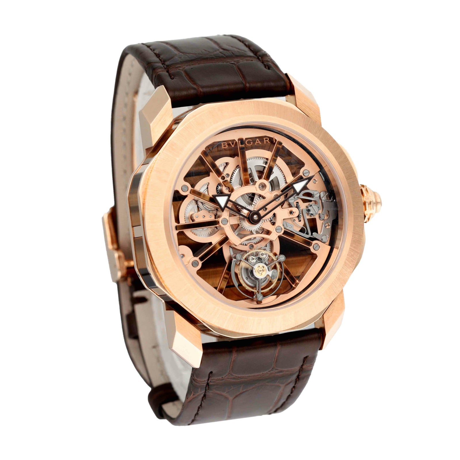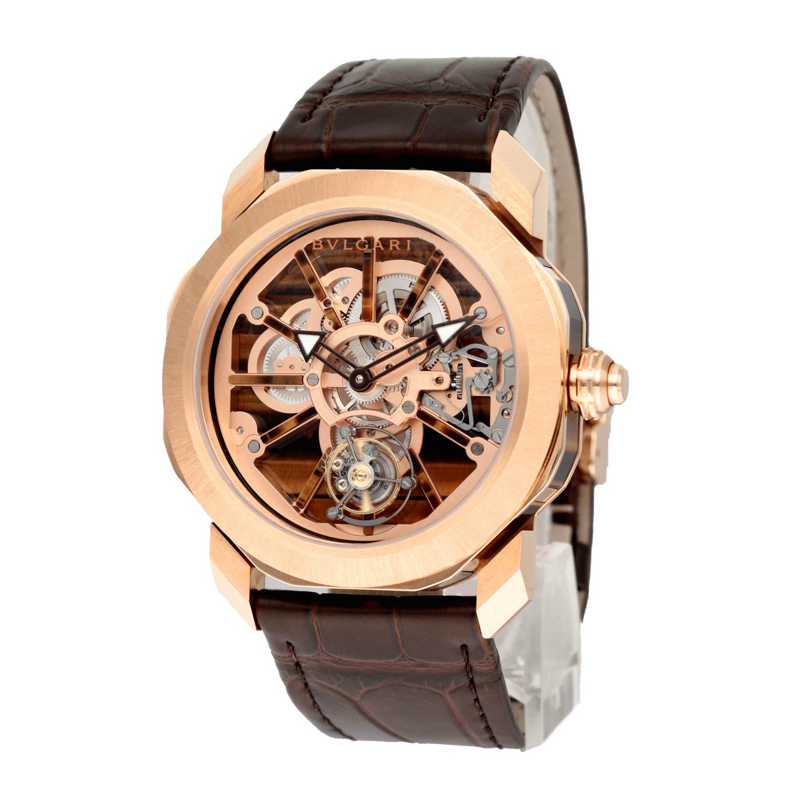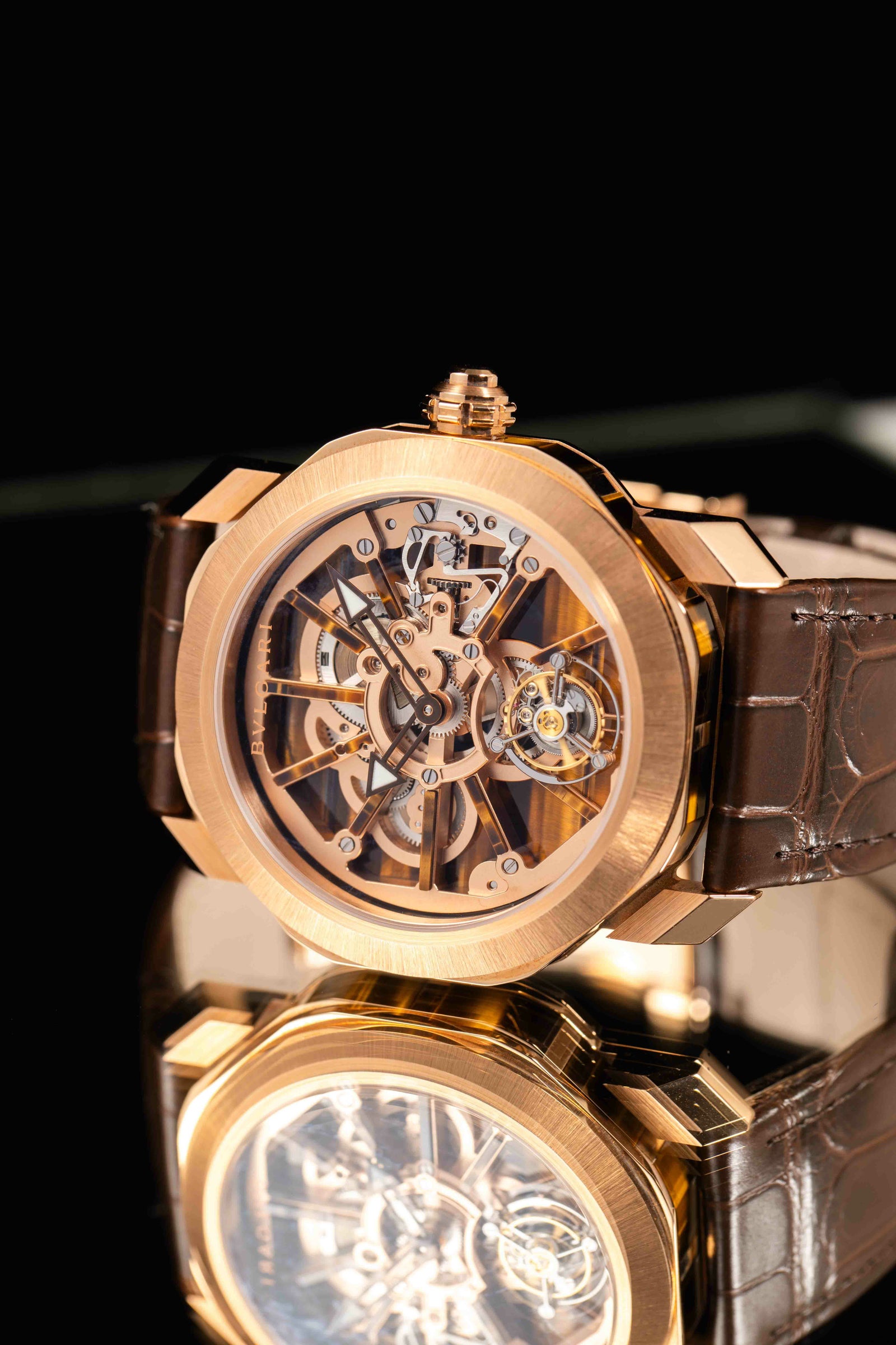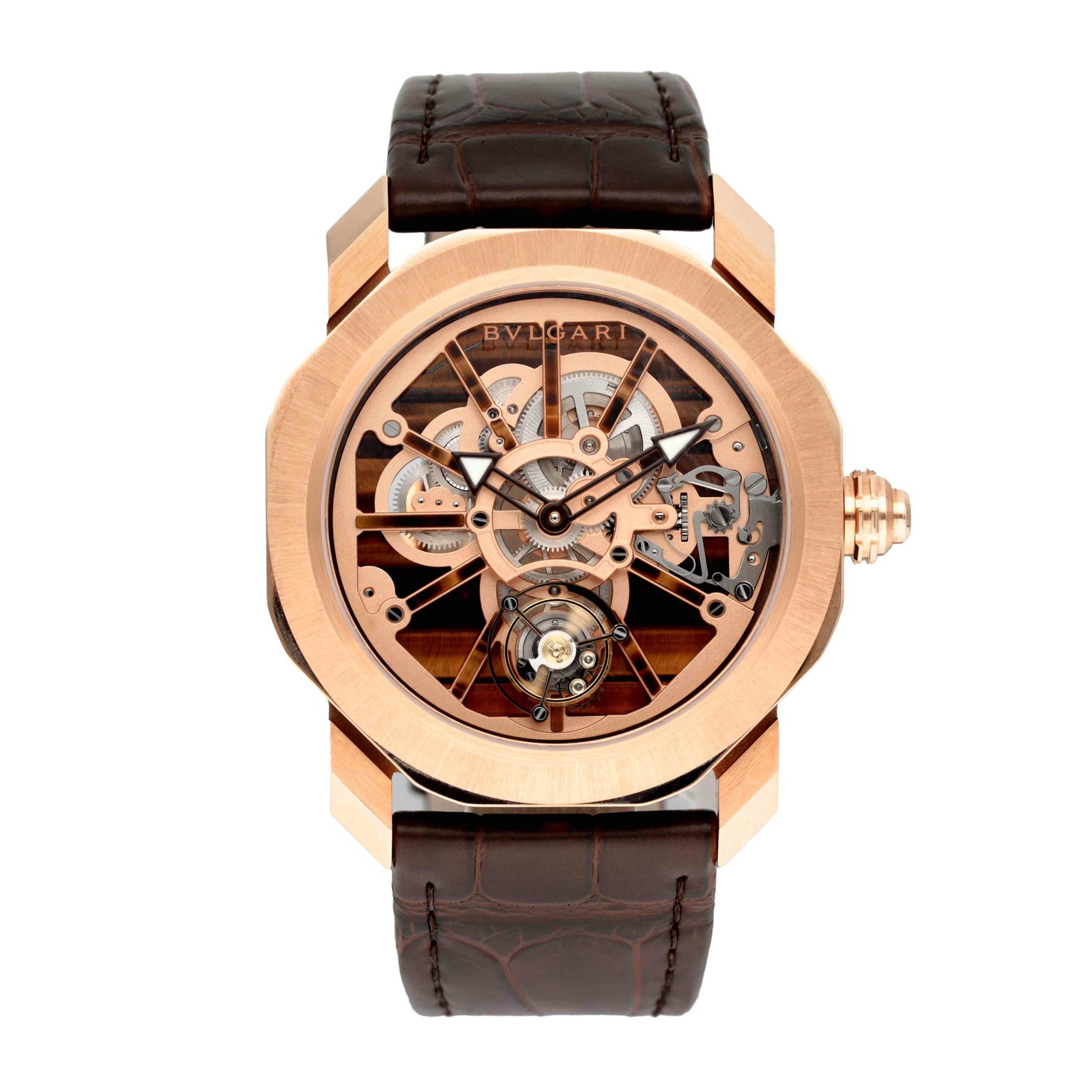 ブルガリ オクト ローマ プレシャス ナチュラリア(Ref.103675)は、八角形のオクト ローマに18Kピンクゴールドとタイガーズアイ(天然石)を大胆に組み合わせた、ひと目で特別感が伝わるハイエンドピースです。タイガーズアイはインサートやインデックスにも使われ、石ならではの表情があるので“同じ顔がない”唯一無二感が魅力。 文字盤側はスケルトンで、中心に向かって奥行きのある造形を楽しめ、6時位置のフライングトゥールビヨンがしっかり主役として映えます。 ムーブメントは手巻きの自社キャリバーBVL206、パワーリザーブ約64時間。ケースは**44mm(厚さ11.35mm)**で存在感がありつつ、仕上げの上質さで品よくまとまります。 ブラウンのアリゲーターストラップ+ピンクゴールド製フォールディングバックル、50m防水で、“眺めて楽しい”だけじゃなく実用も意識できる一本です。