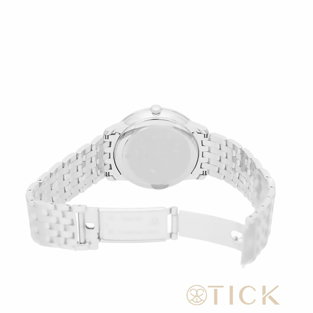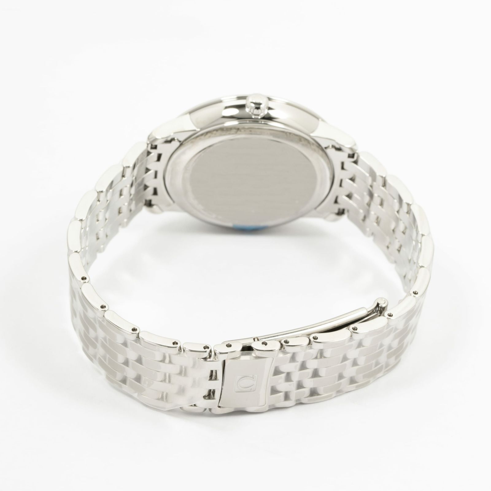 オメガ デ・ヴィル プレステージはオメガを代表するドレスウォッチです。丸みのあるやや小ぶりな37mmのケース径に約10mmの薄いデザインで、シンプルで洗練されたクラシカルな雰囲気を持っています。 文字盤は落ち着いた光沢のあるブラックとなっており、シルバーのローマ数字のインデックスを引き立て高級感を醸し出します。柔らかな着け心地の7連ブレスが腕元に沿いスマートな着け心地となります。 「デ・ヴィル」とはフランス語で「街」や「都会」を意味します。その名に相応しい洗練されたデザインで個性を引き立ててくれる腕時計です。