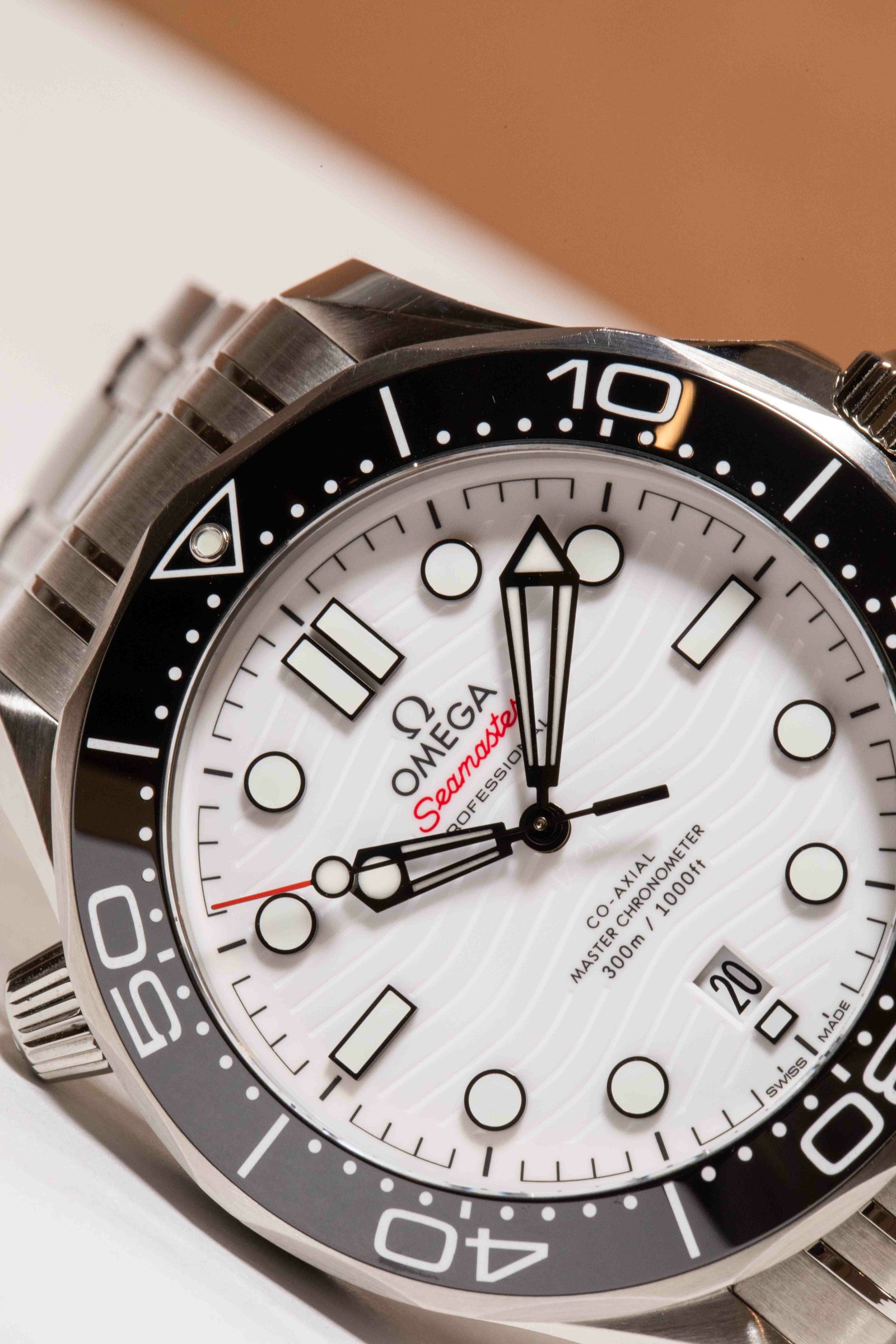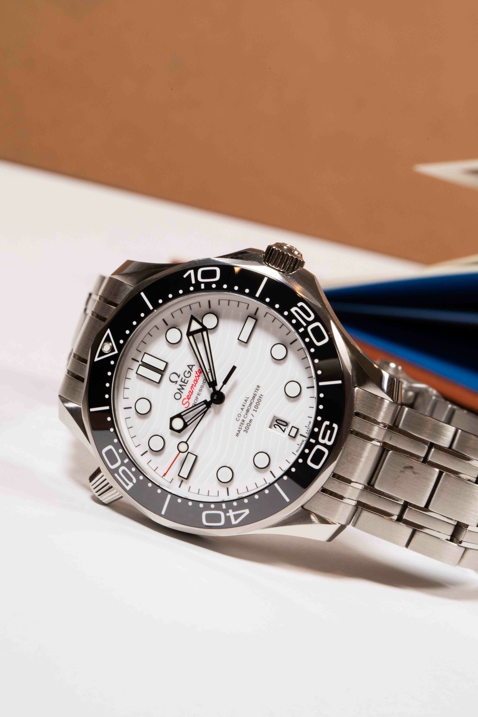 定番ダイバーの安心感に「白×黒のモノトーン」で都会的な清潔感を足した、使いやすさ抜群の1本です。艶のあるホワイトセラミック文字盤にレーザーの波模様、ブラックのセラミックベゼル(白のエナメル目盛り)が効いていて、スポーツなのに上品にまとまります。赤い“Seamaster”ロゴと秒針先端が程よいアクセントで、写真より実物の質感がかなり綺麗です。