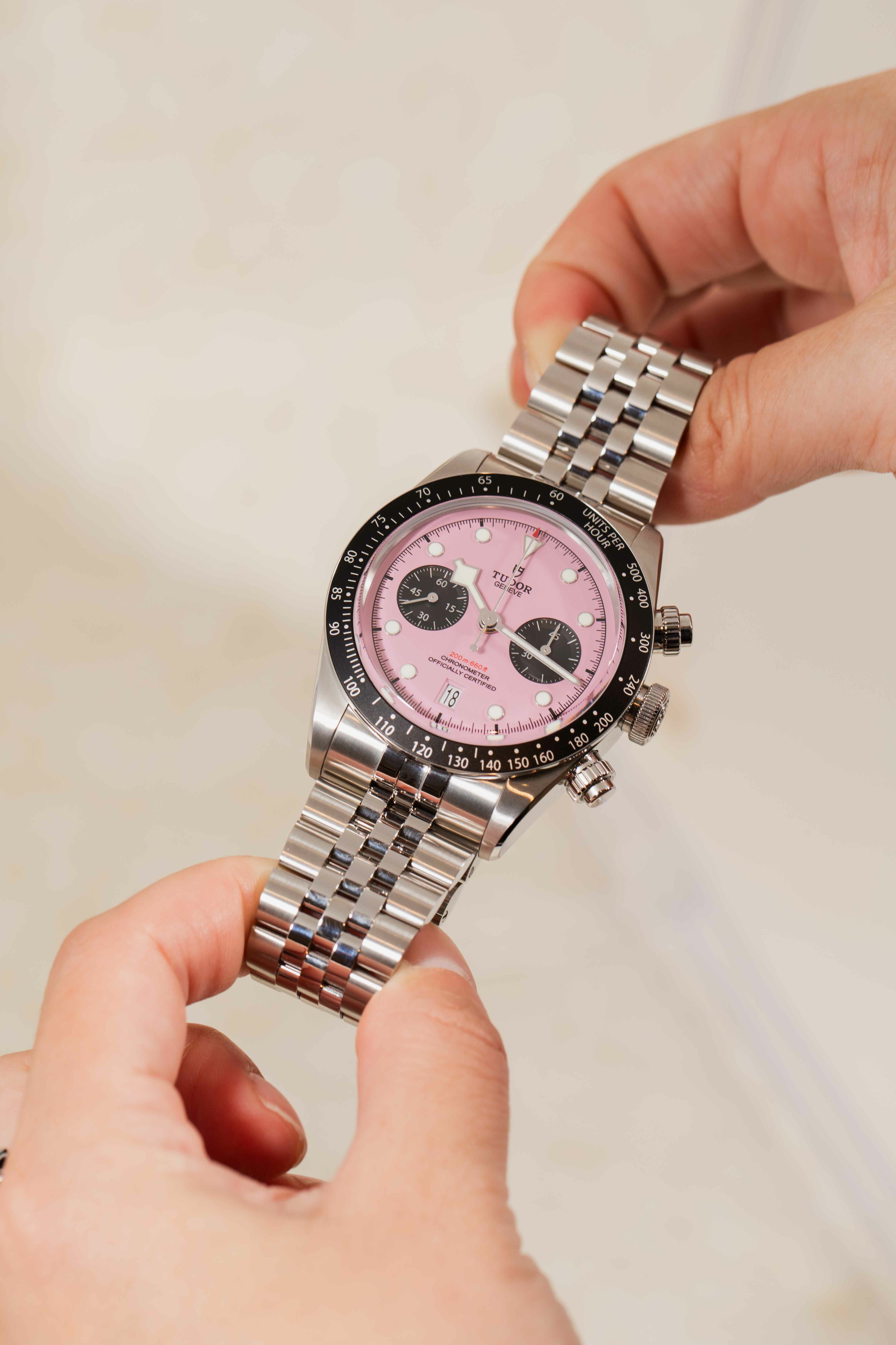 TUDOR ブラックベイ クロノ(Ref.79360N)ピンク文字盤は、王道クロノの力強さに“遊び心”と希少性が加わった、今かなり注目度の高いモデルです。ピンク文字盤は写真だと派手に見えがちですが、実物は意外と落ち着いたトーンで、肌なじみが良く上品にまとまります。クロノグラフらしい立体感のあるフェイスにピンクが入ることで、腕元の印象が一気に洒落て、人と被りにくいのも大きな魅力。カジュアルはもちろん、ジャケットスタイルの“外し”としても使いやすく、着けた瞬間に「これだ」と感じる方が多い一本です。レア感もあるので、コレクション目線でも満足度の高いモデルです。