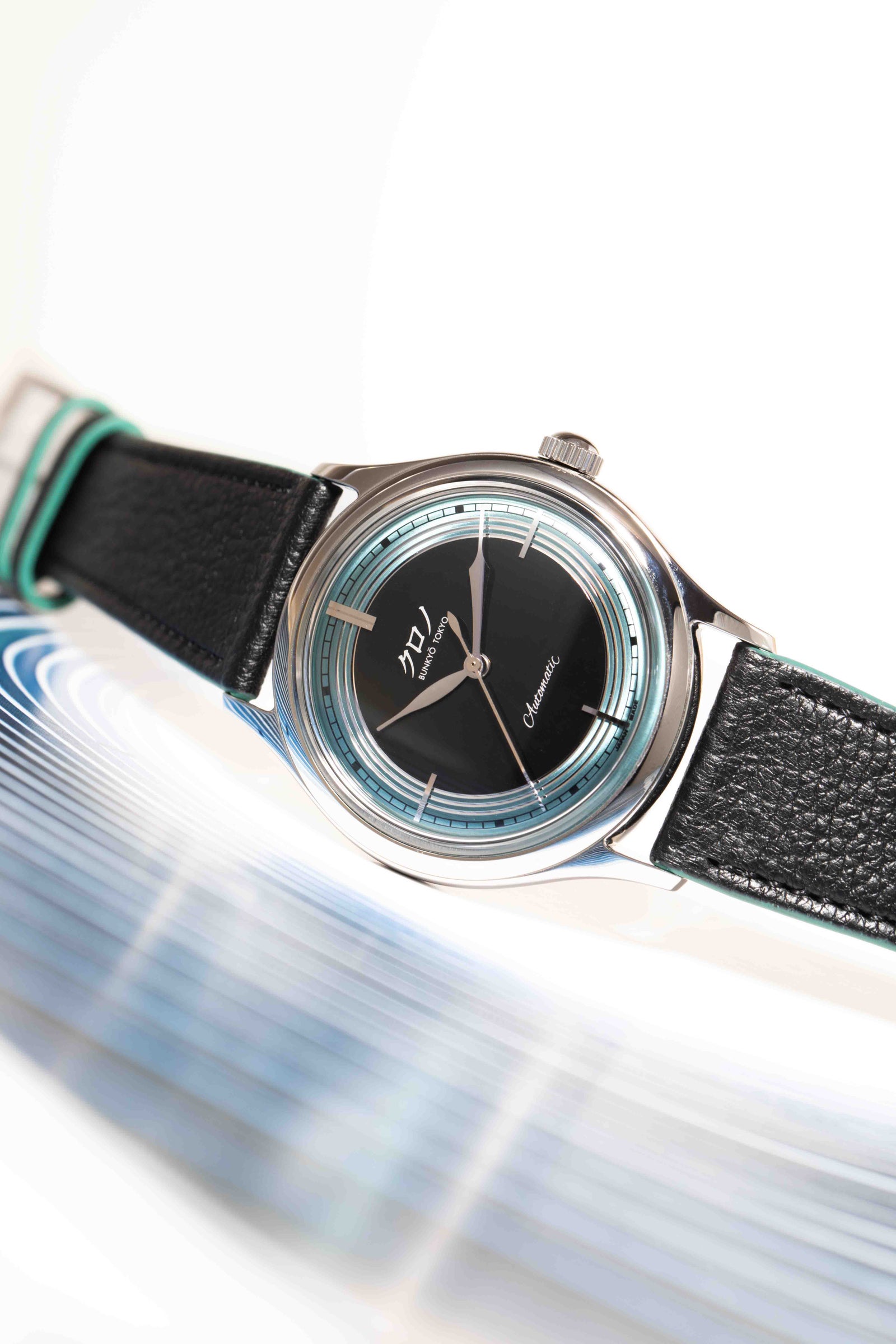 派手さで目を引くのではなく、色の重なりと空気感で惹きつける一本です。外周には瑠璃沼に着想を得たラピスグリーン系のメタリックカラー、中央には鏡面のような深いブラックが配されており、見る角度や光の入り方によって静かに表情を変えていきます。37mmのステンレススチールケースに収められたこのダイヤルは、華美に寄せすぎず、それでいてありきたりでもない独特の存在感があり、手元に知的で繊細な印象を添えてくれます。Kurono Tokyoの中でも、このモデルは2トーンの“Reiwa”表現を締めくくる作品として位置づけられています。