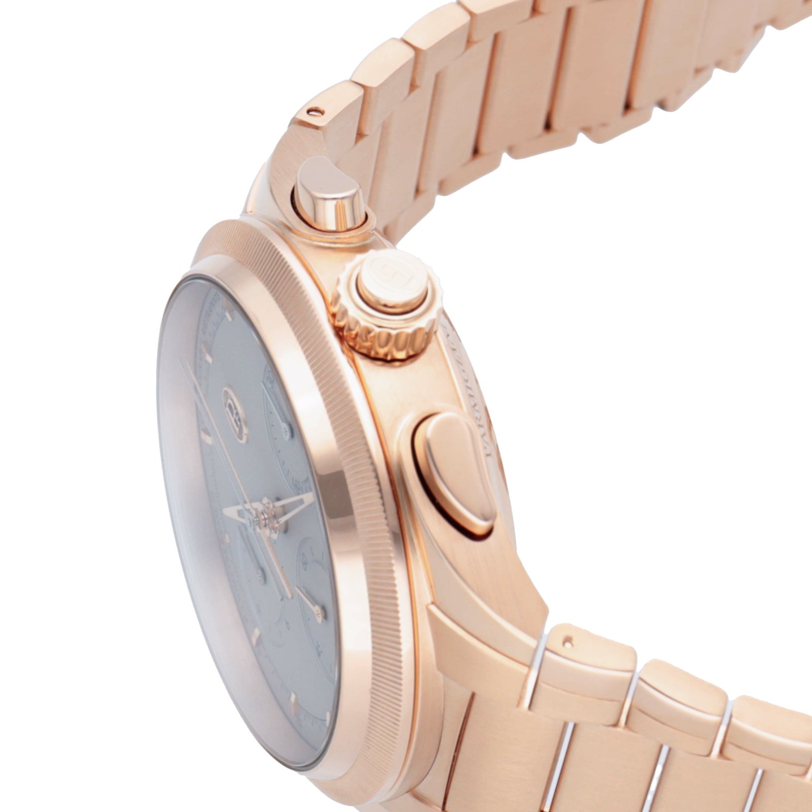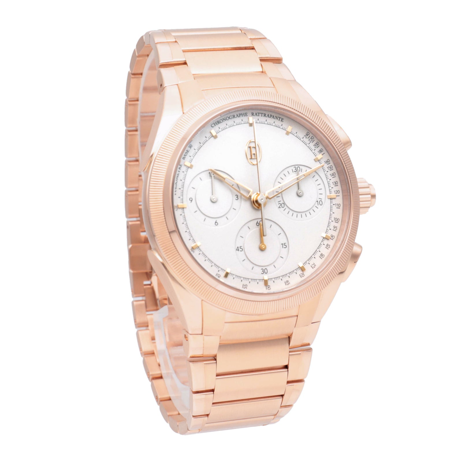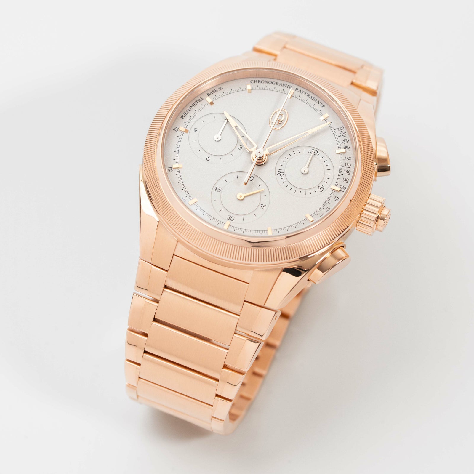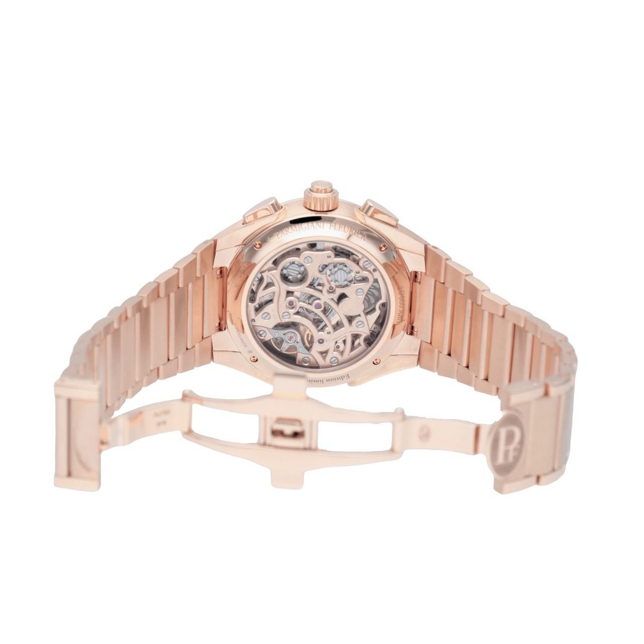 ラグジュアリーな一体型ブレスに“本気のラトラパンテ(スプリットセコンド)”を載せた、ブランド最高峰クラスのクロノグラフです。18Kローズゴールドの42mmケース&ブレスは、ポリッシュとサテンのコントラストが上品で、腕に乗せると見た目以上に一体感があります。ダイヤルはサンドブラスト仕上げのプラチナで、光を柔らかく受け止める落ち着いた表情が大人っぽさを強調します。