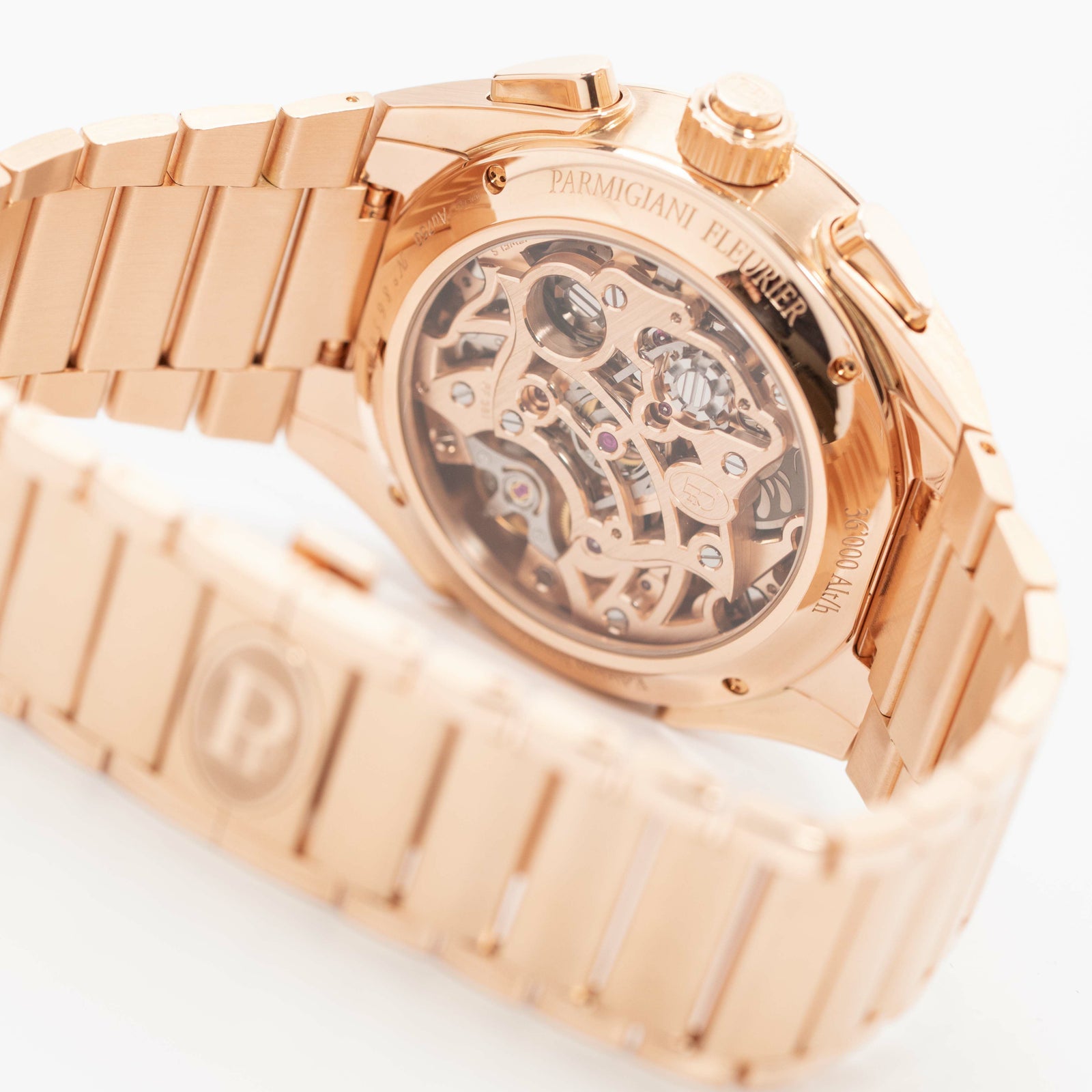 中身は手巻きの自社キャリバーPF361。5Hz(毎時36,000振動)のハイビートで、2つの出来事を同時に計測できるスプリットセコンド機構を搭載し、2つのコラムホイール+垂直クラッチという贅沢仕様なのもポイントです。パワーリザーブは約65時間。さらにムーブメントのブリッジや地板に18Kピンクゴールドを用いるなど、見えないところまで“別格”の作り込みが味わえます。