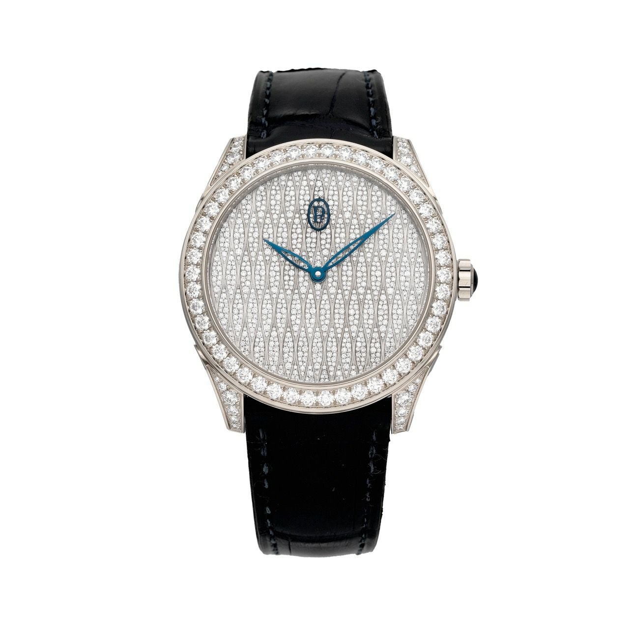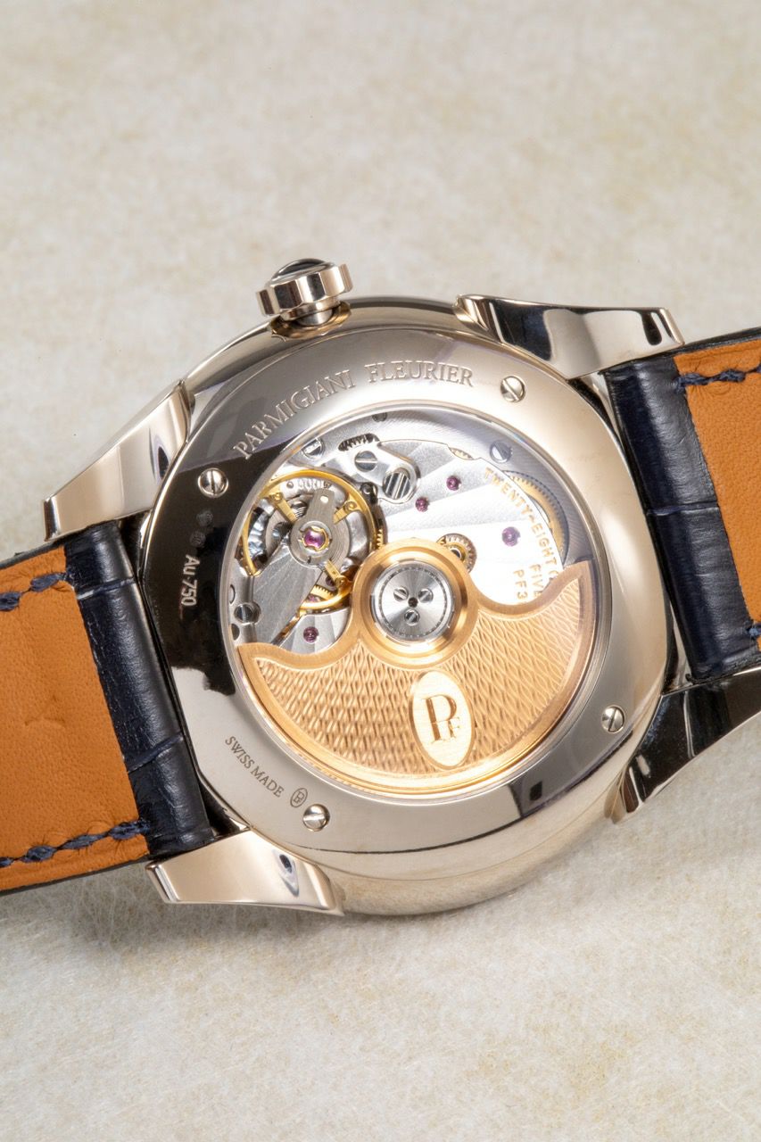 中身は自動巻きの自社キャリバーPF310を搭載し、パワーリザーブ約50時間/30m防水/サファイヤケースバックと、見た目だけでなく普段使いの安心感も確保。 仕上げ面では、ローターにバーリーコーン(麦の穂)装飾が入るなど、細部まで作り込みが丁寧です。 そしてホワイトゴールドモデルは、リューズにブルーサファイアのカボションが入るのもポイントで、腕元で“さりげない色気”が出ます。
