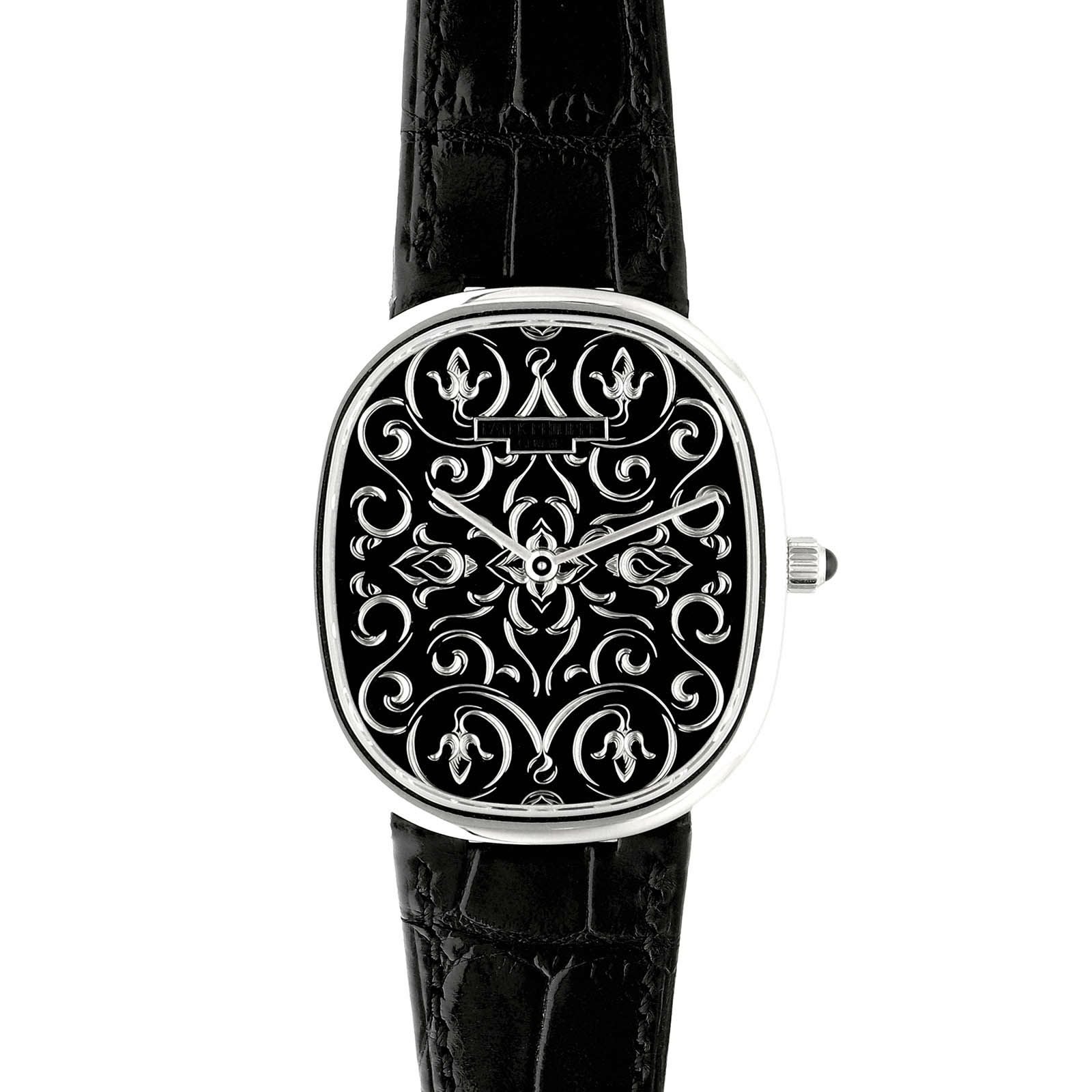 18Kゴールドの文字盤プレートに施された繊細な彫金技術により、優美なくぼみが作り出され、そこにシャンルヴェ七宝として知られる希少なハンドクラフト技法で本黒七宝が施されています。 薄型の自動巻きムーブメント「Cal.240」を搭載し、パテックフィリップが誇る職人技と芸術性を感じさせます。 ※保証書が無い為、未使用としています。
