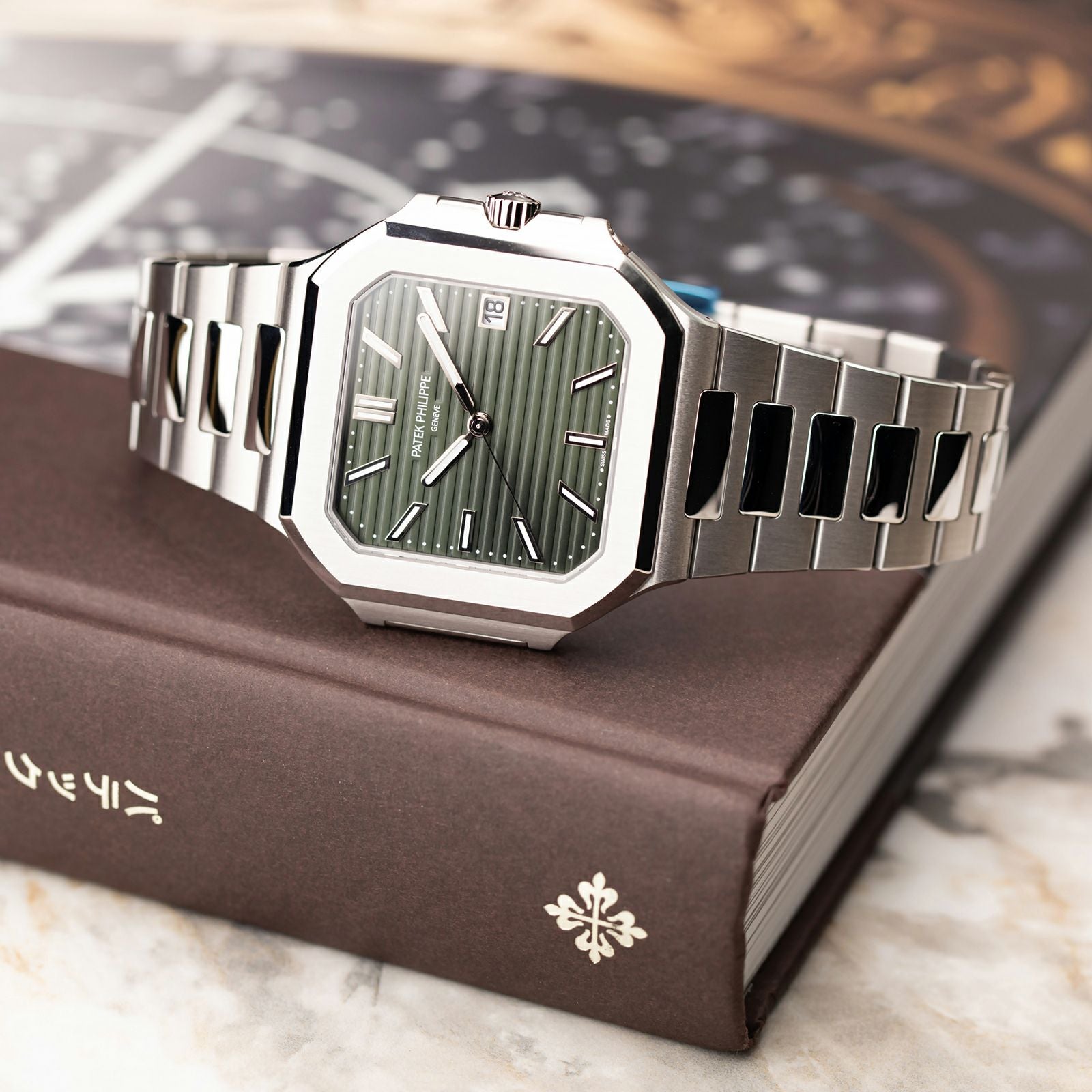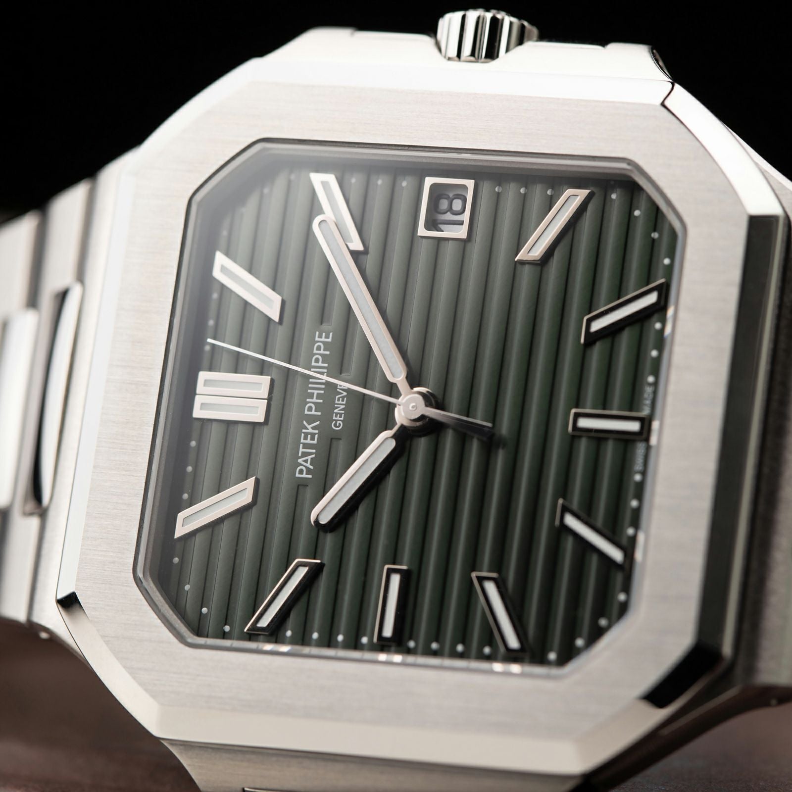 2024年秋に発表された「パテック フィリップ Cubitus」は、ブランドにとって1999年の「Twenty~4」以来の全く新しいシリーズとして注目されています。ポリッシュ仕上げと縦サテン仕上げを絶妙に組み合わせたモダンなステンレススチールモデルは、他にはない存在感を放ちます。 スリムでエレガントなスクエア型ケースは手首にしなやかにフィットし、快適な着用感を実現しています。さらに、オリーブグリーンのソレイユ仕上げが施された水平エンボス文字盤が、上品で洗練された印象を引き立てます。