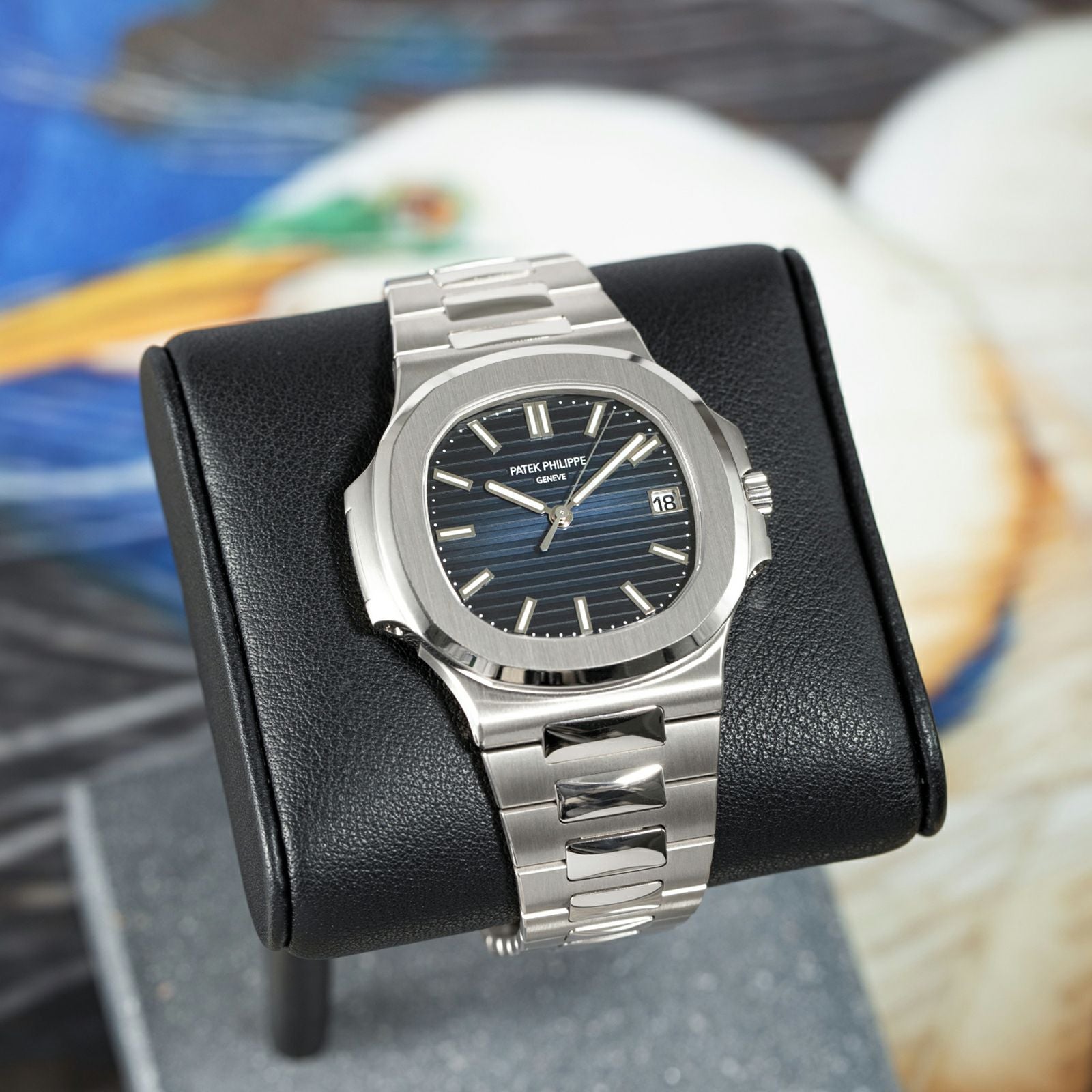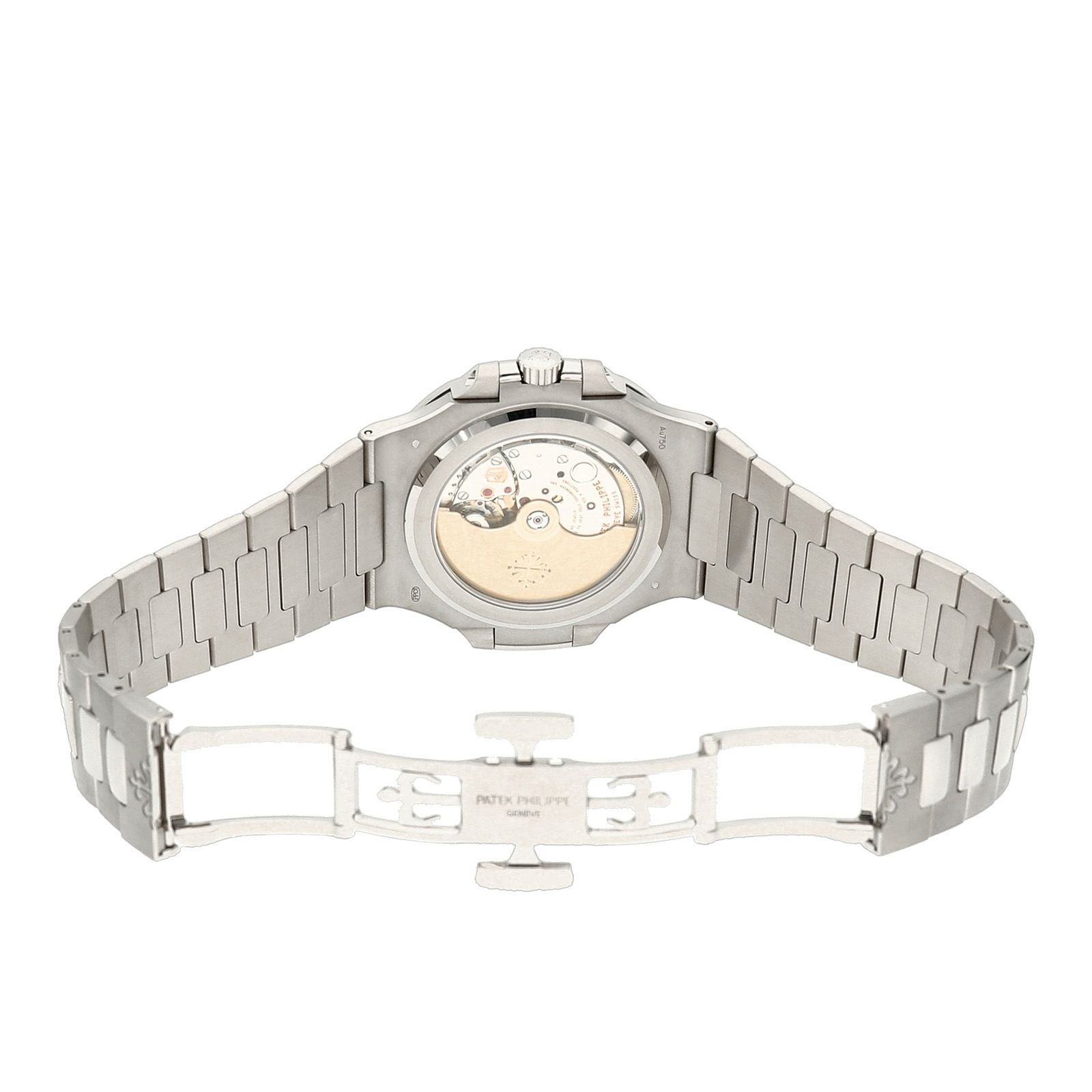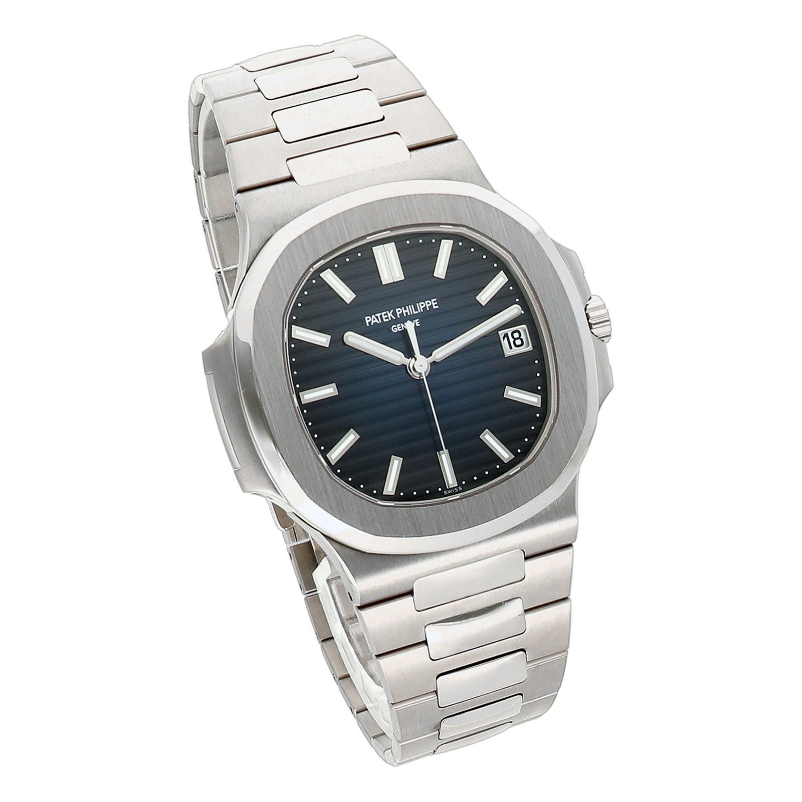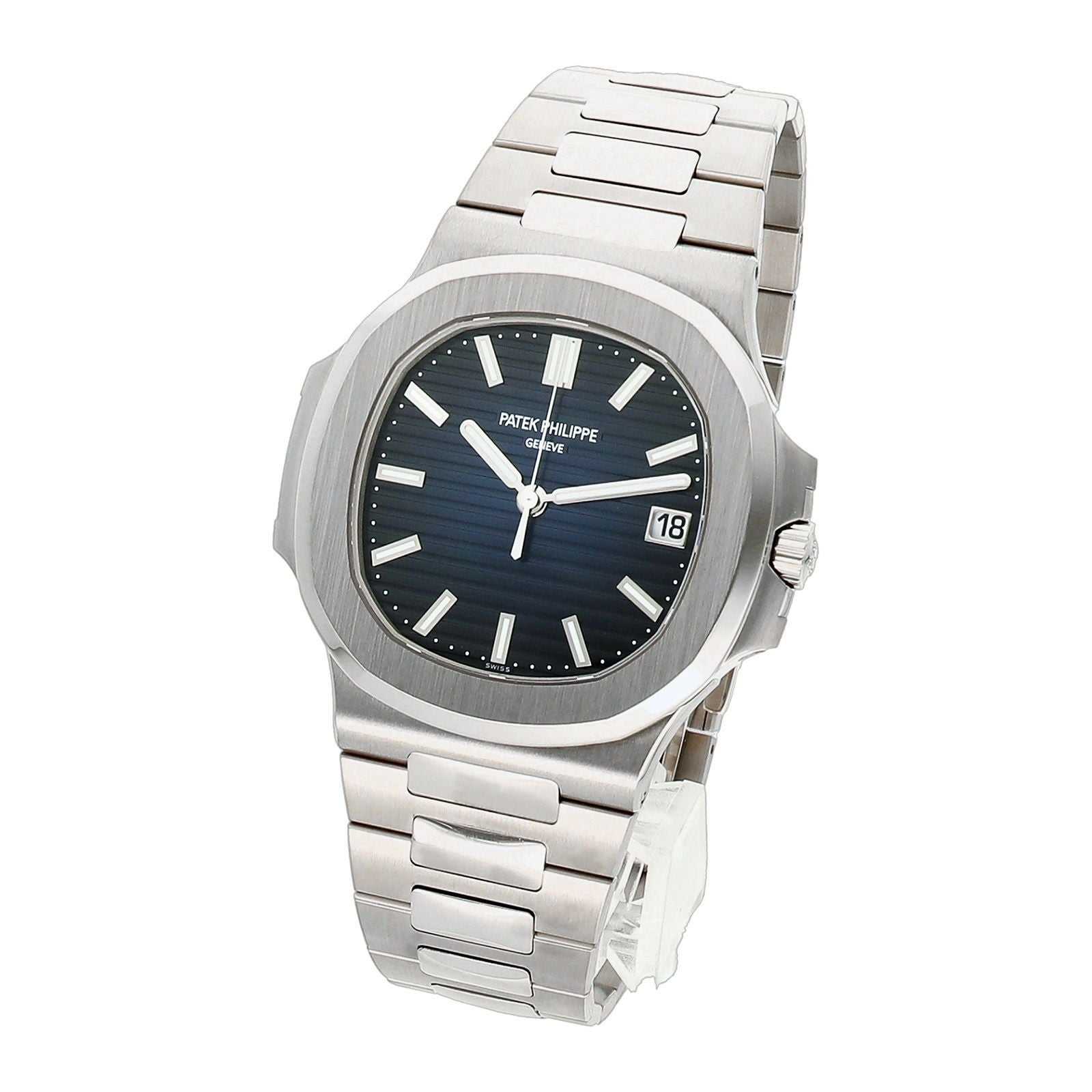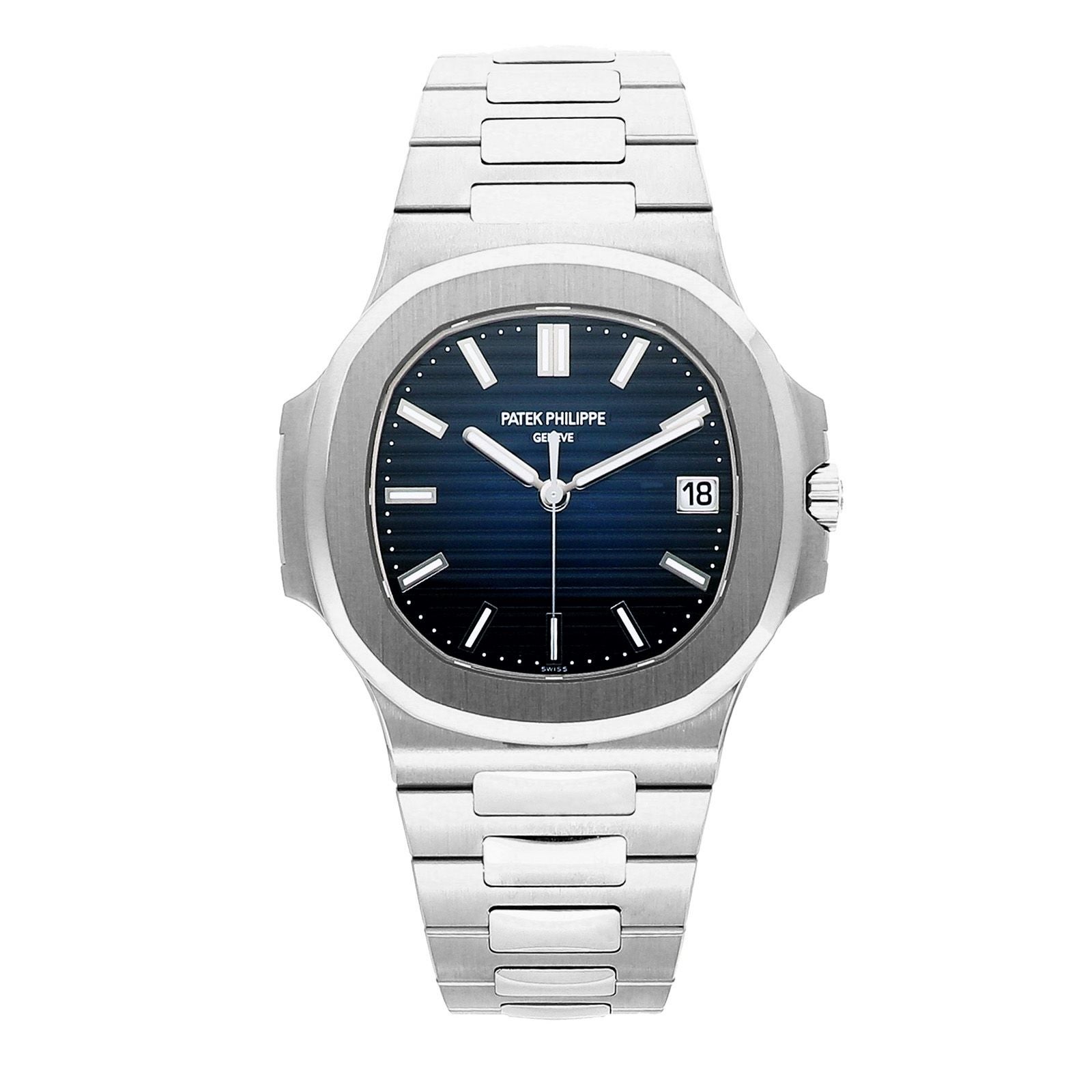 2022年に発表されたパテックを代表するモデル「ノーチラス」のホワイトゴールドの3針です。 文字盤は外周にいくほど濃くなるブラック・グラデーションのブルー・ソレイユ文字盤となっています。