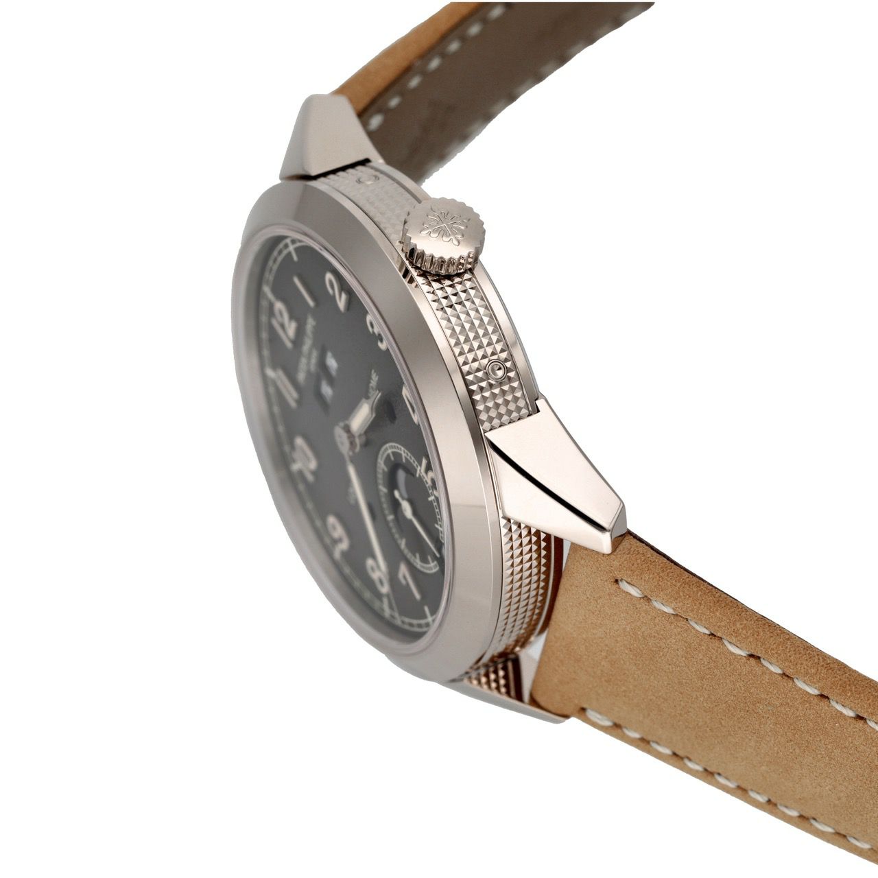 外装は41mmのホワイトゴールド。ケース側面にはクルー・ド・パリ(ホブネイル)装飾が入り、クラシックなのに新鮮な存在感があります。文字盤はチャコールグレーのテクスチャーに外周ブラックのグラデーション、立体感あるアラビア数字インデックスで、落ち着きと雰囲気の両方を出せる顔つきです。防水は30m。