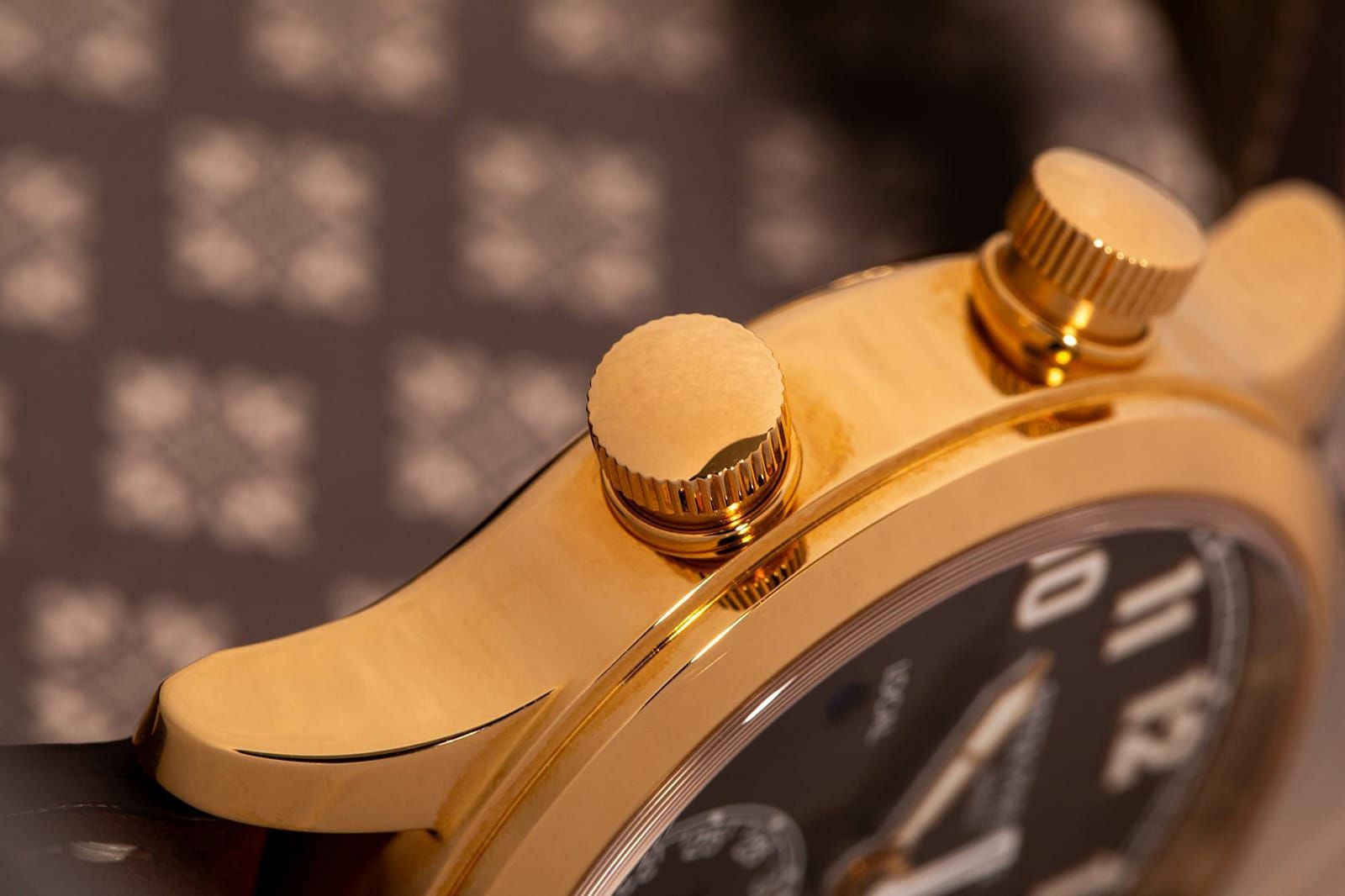 パイロットテイストの顔つきに、同ブランドの得意技「トラベルタイム(第2時間帯表示)」を載せた、通好みのコンプリケーションです。直径37.5mmのローズゴールドケースに、外周へ向かって濃くなるブラウン?ブラックのグラデーション文字盤が上品で、スポーティなのに“きちんと高級”にまとまるのが魅力です。