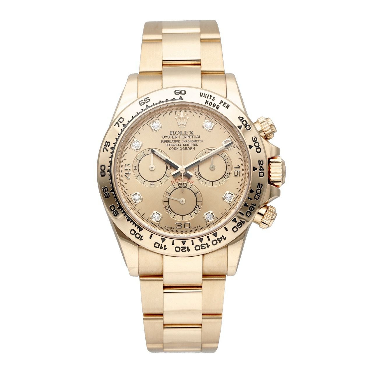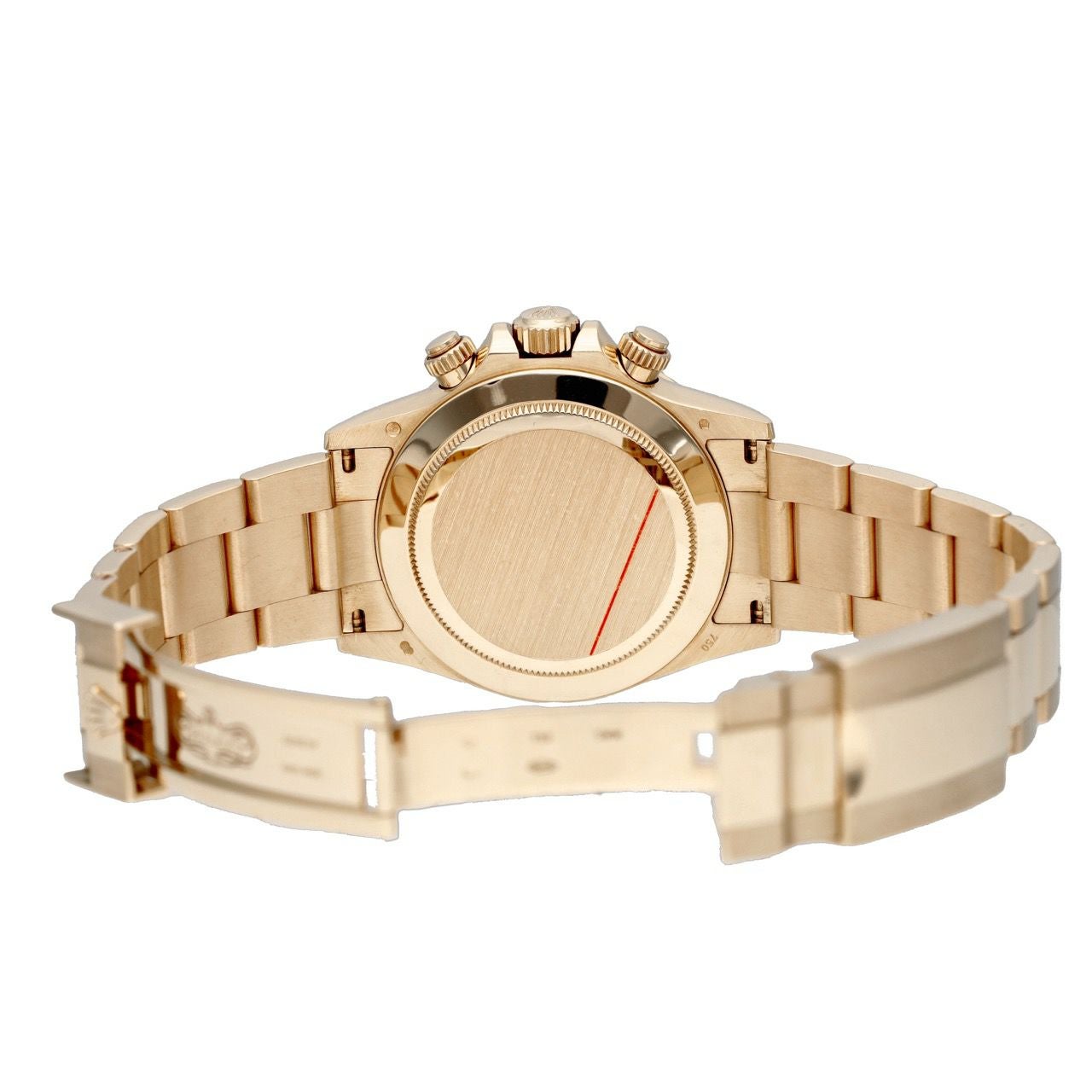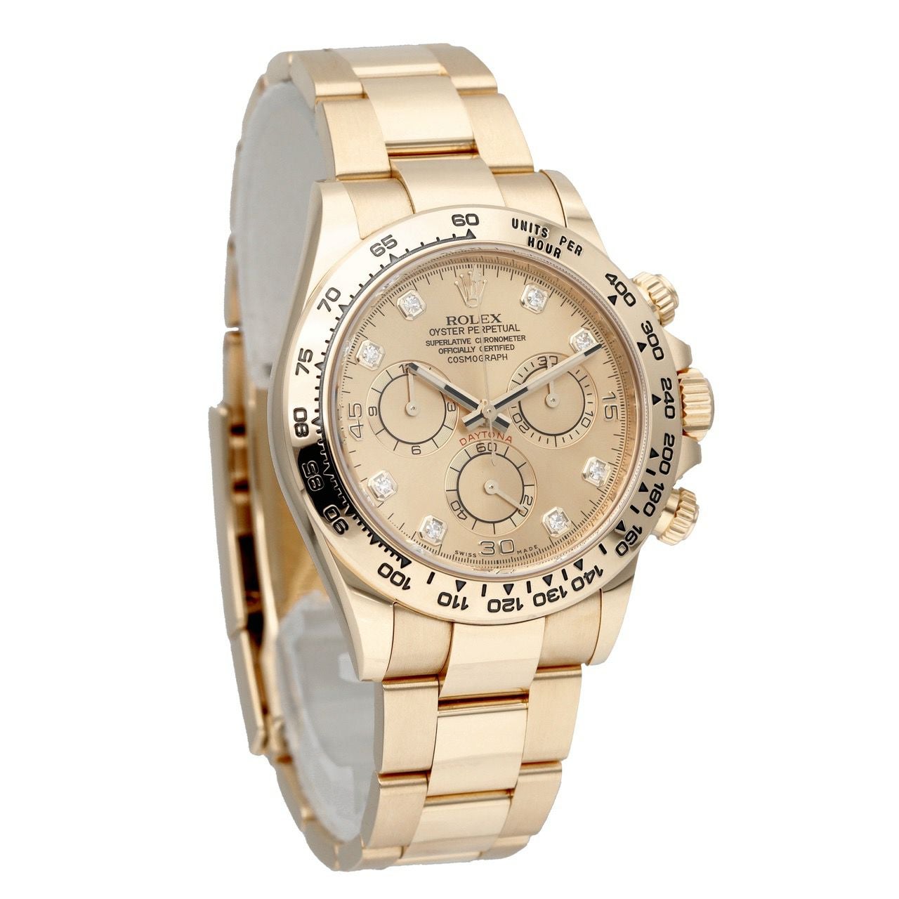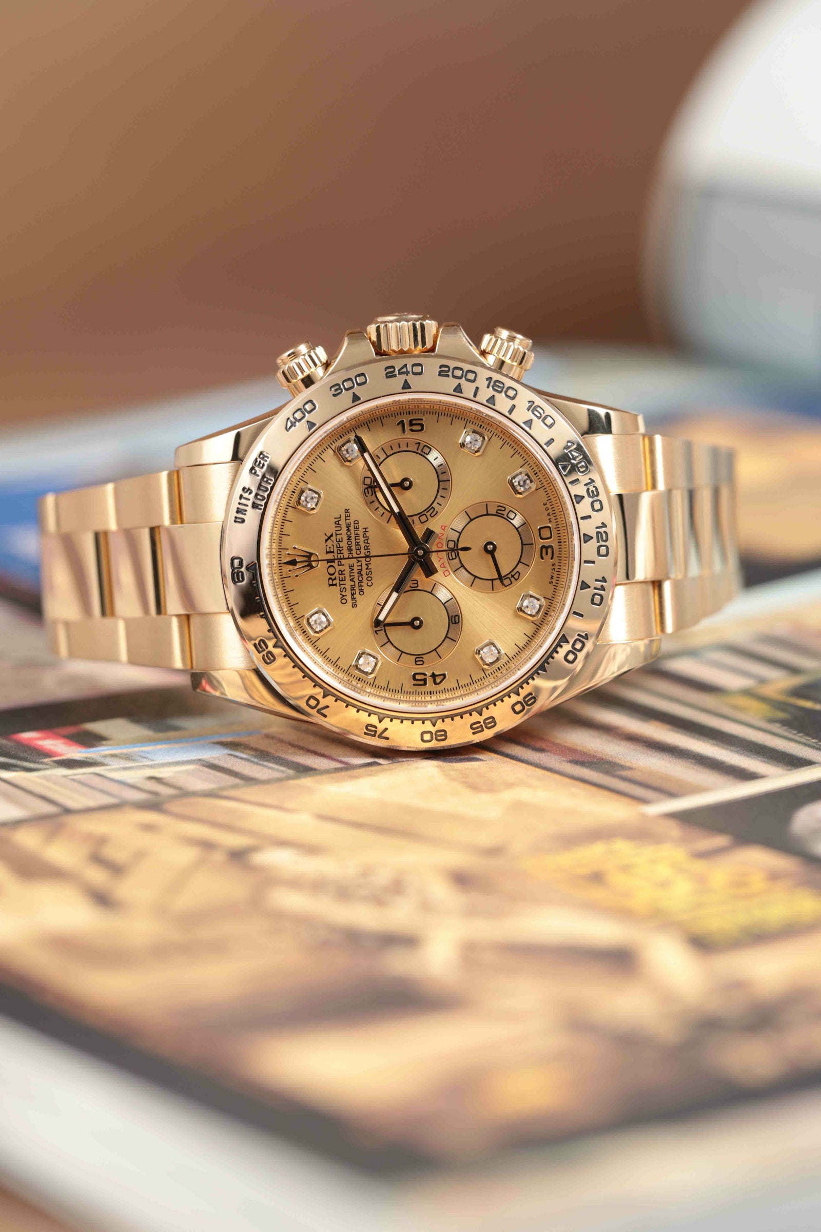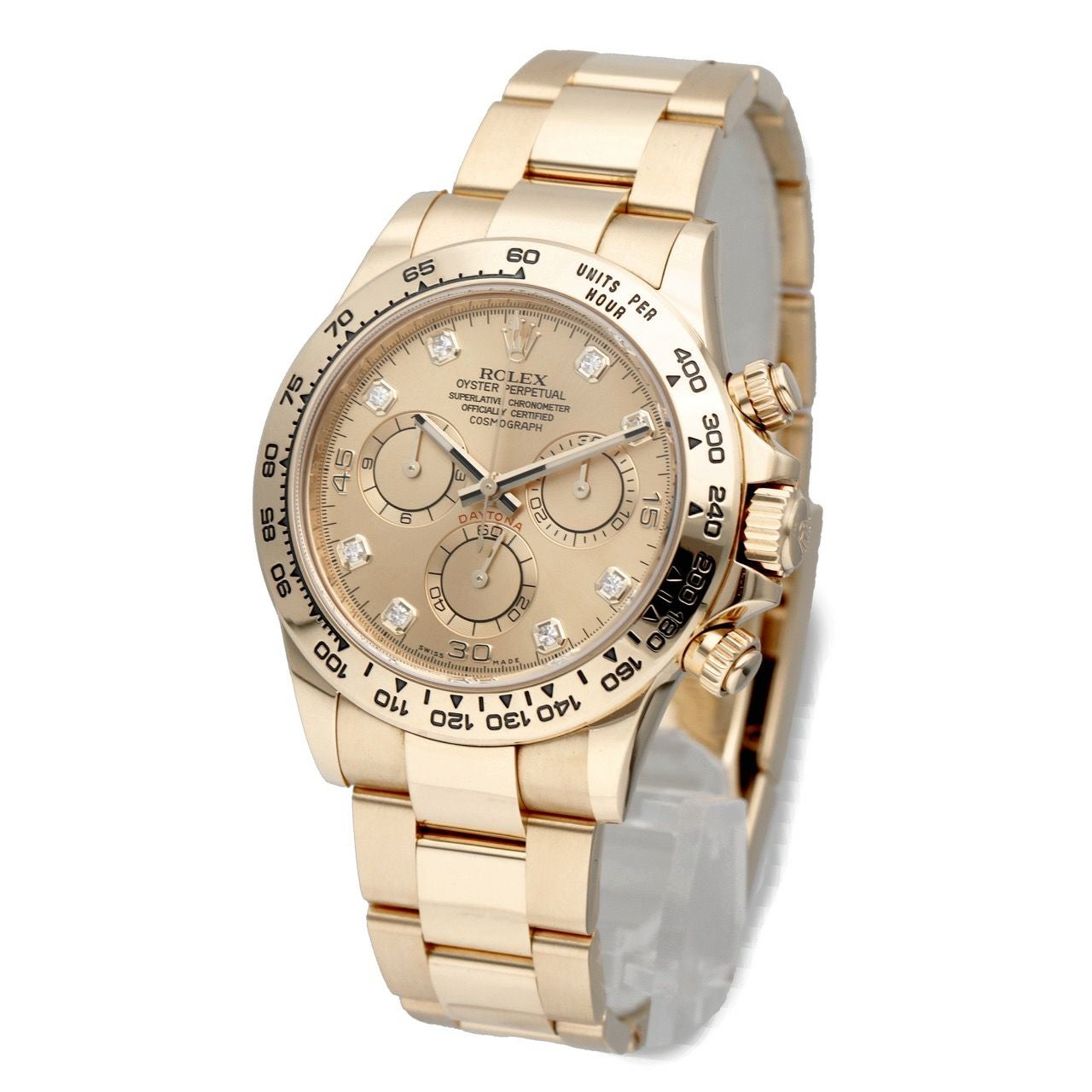 デイトナの王道クロノグラフに18Kイエローゴールドの圧倒的な存在感を乗せた、“一発で格が伝わる”モデルです。ケースとブレスのゴールドは派手に見えがちですが、デイトナはデザインが端正なので、実物は意外と品よくまとまります。さらに「G」は8Pダイヤインデックス仕様のことが多く、近くで見ると輝きが上品で、さりげなく特別感が出るのも魅力。写真以上にケースの質感や面の出方がきれいで、腕に乗せた瞬間に満足感が出やすい一本です。オンでもオフでも“主役”になってくれて、デイトナらしい人気・資産性も含めて間違いないモデルです。