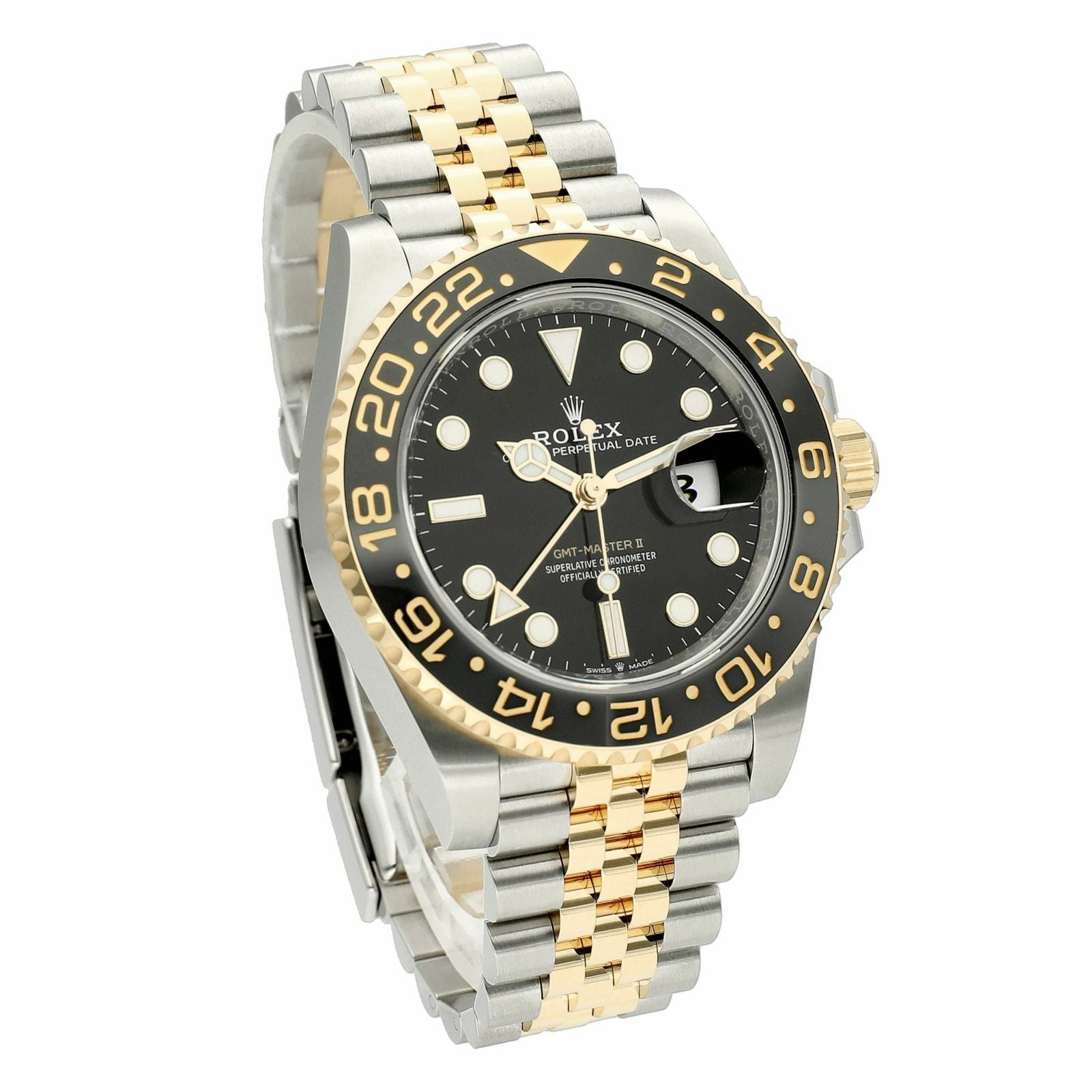 イエローゴールド×オイスタースチールのコンビ(イエローロレゾール)が持つ華やかさと、GMTマスターⅡらしい実用性を一度に楽しめる注目モデルです。グレー×ブラックの24時間回転ベゼルとブラックダイアルの引き締まった表情が相まって、ラグジュアリーなのに派手すぎず“大人のスポーツロレックス”として腕元が綺麗にまとまります。ジュビリーブレスはしなやかで着け心地が良く、スーツにもカジュアルにも合わせやすいのも魅力。2タイムゾーン表示ができるGMT機能で旅行や出張にも強く、日常使いから特別な一本まで幅広く活躍してくれます。