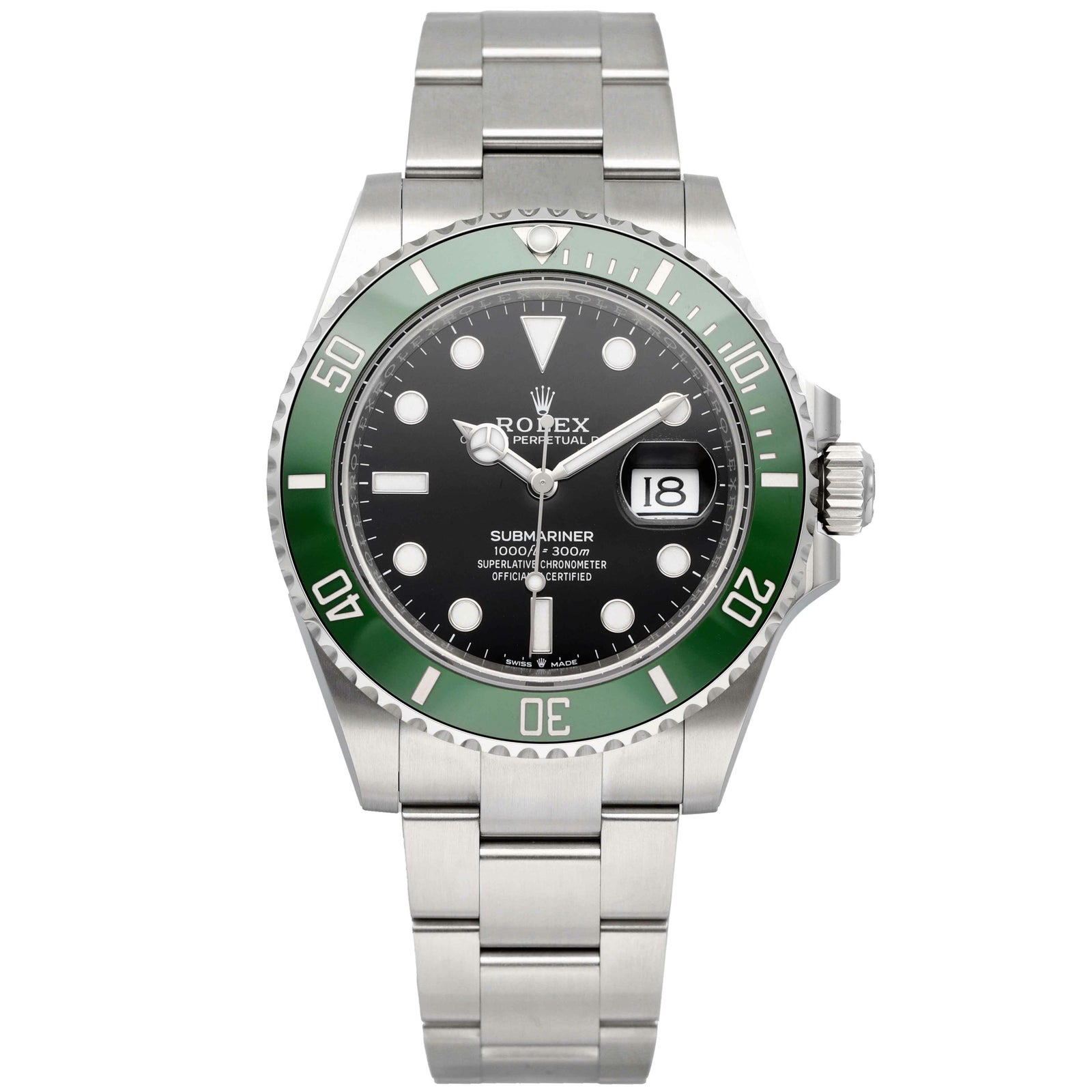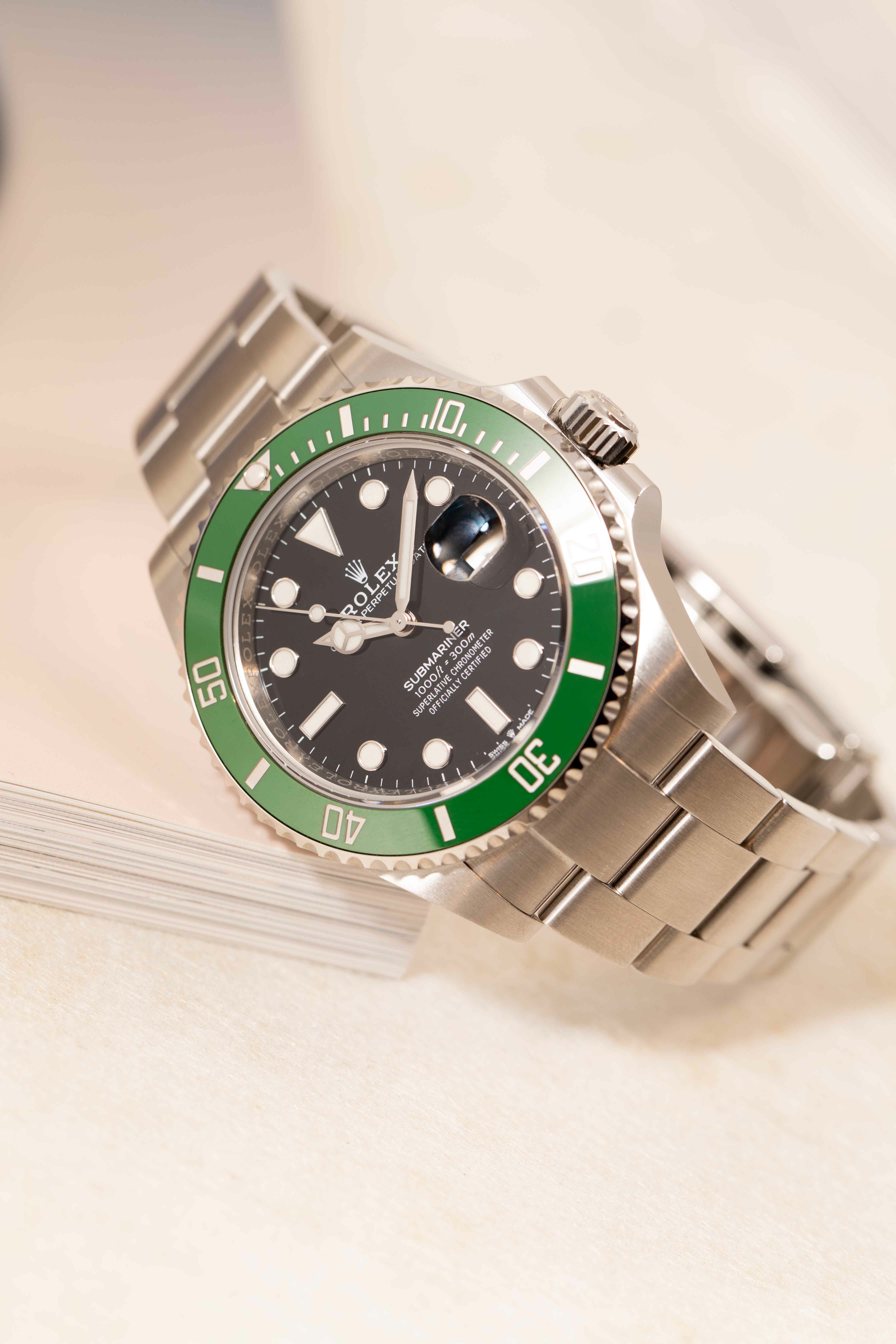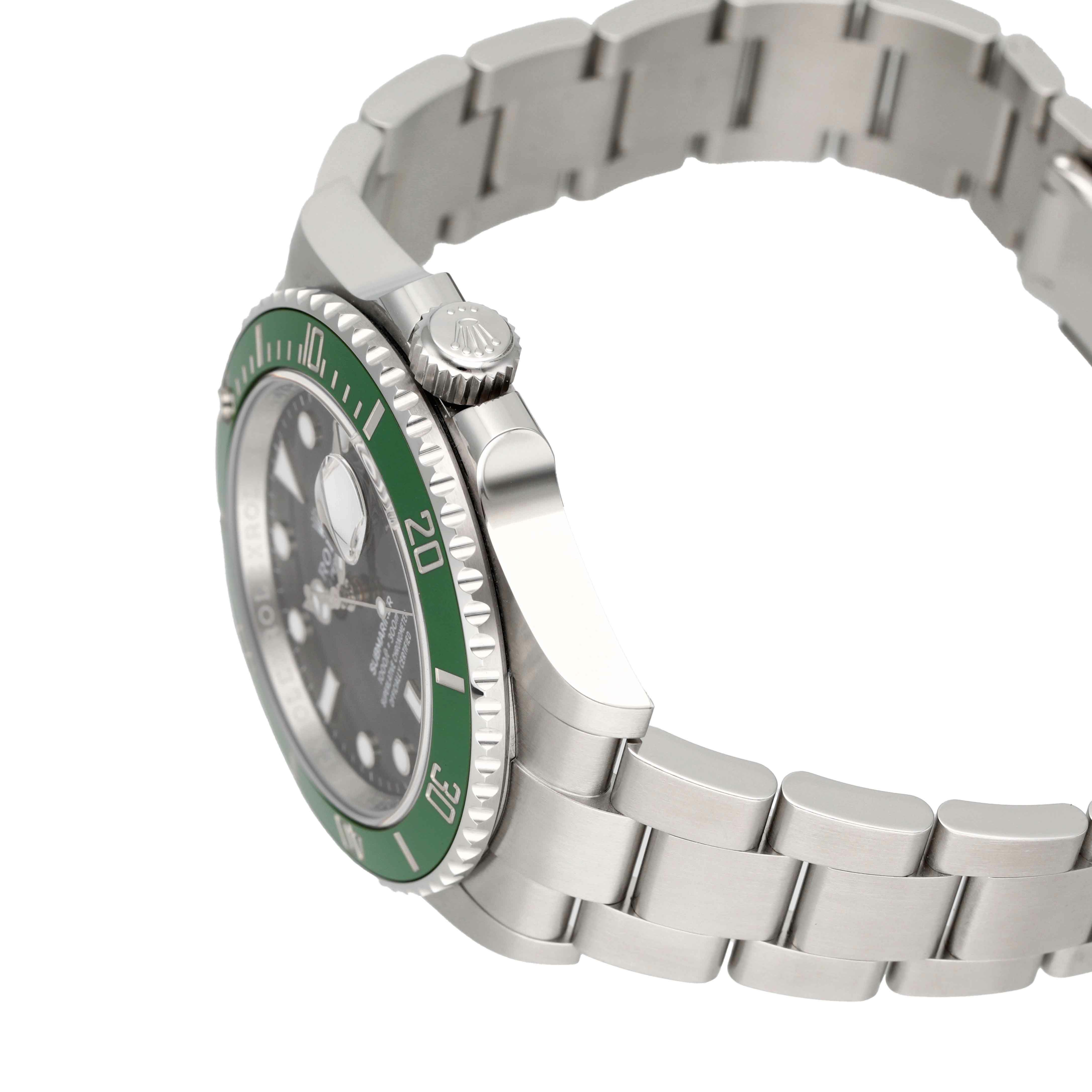 1953年からスタートしたサブマリーナーはダイバーズウォッチの原点とも言われています。「潜水艦乗務員」という意味を持ち現在は300m防水と機能性にもすぐれています。サブマリーナー生誕50周年を記念して発表されたグリーンサブマリーナー。 2020年に発表された今作が3代目となり、当モデルはケース径が前作より1mmアップした41mmサイズでラグ幅などが細くなったことによりバランスの良いサイズ感で腕元に落ち着きを見せます。特徴的なグリーンベゼルには傷に強いセラクロムベゼルを採用し、暗闇でも視認性の良いクロマライト夜光塗料を使用しています。 ブレスレットは堅牢性の高いマットな3連ブレスでグライドロック・エクステンションブレスは容易にサイズの変更が可能な仕様となっています。 型番のLVとはフランス語でLunette Vert「緑のベゼル」という意味を持ちます。 通称名は「スターバックス」と言われています。