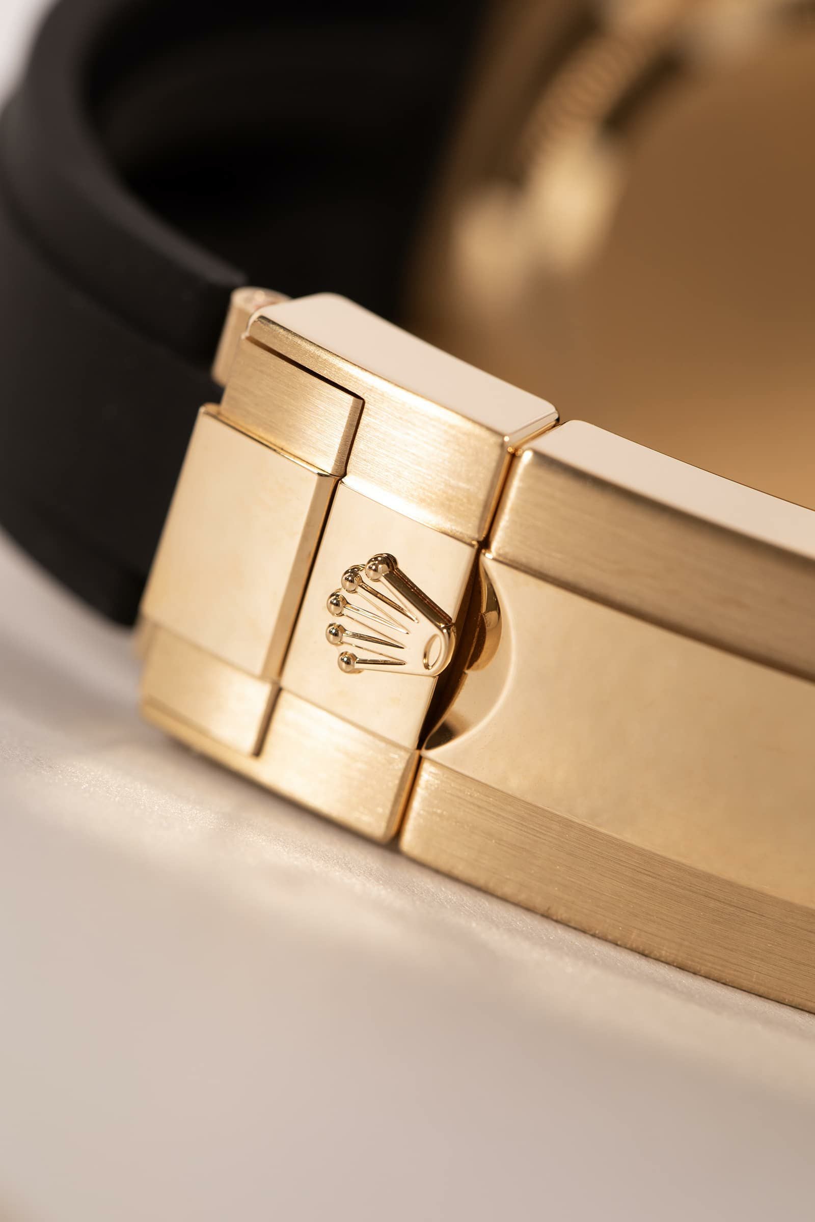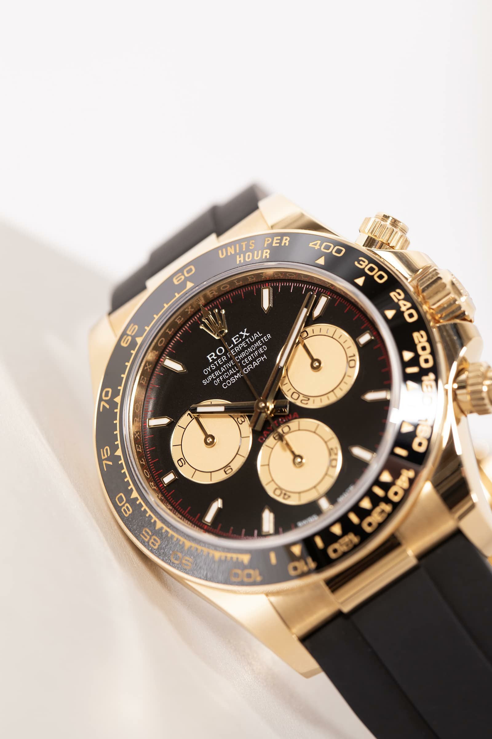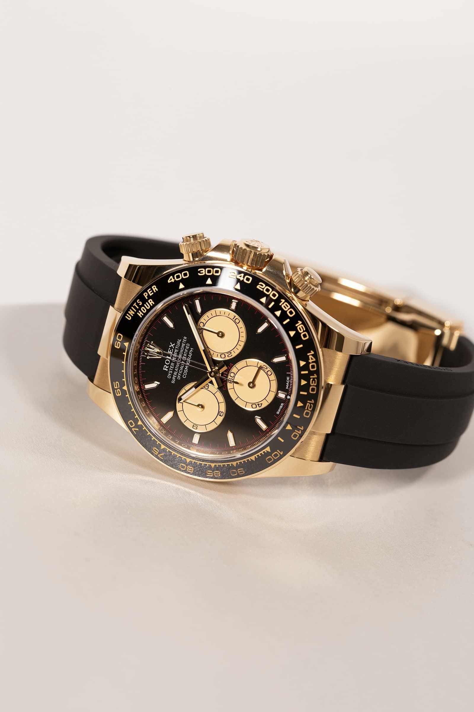 18Kイエローゴールドの“華”と、ブラックのセラクロムベゼル&ブラックダイヤルの“締まり”が同居した、完成度の高いデイトナです。ゴールドの迫力はしっかりあるのに、黒が効いているので派手すぎず大人っぽくまとまるのが魅力。さらにラバーストラップ(オイスターフレックス)仕様で、見た目はラグジュアリーなのに着け心地は軽快で、夏場や普段使いでもストレスが少ないのもポイントです。腕に乗せた瞬間に「特別感」と「使いやすさ」の両方が伝わる、主役級の一本です。