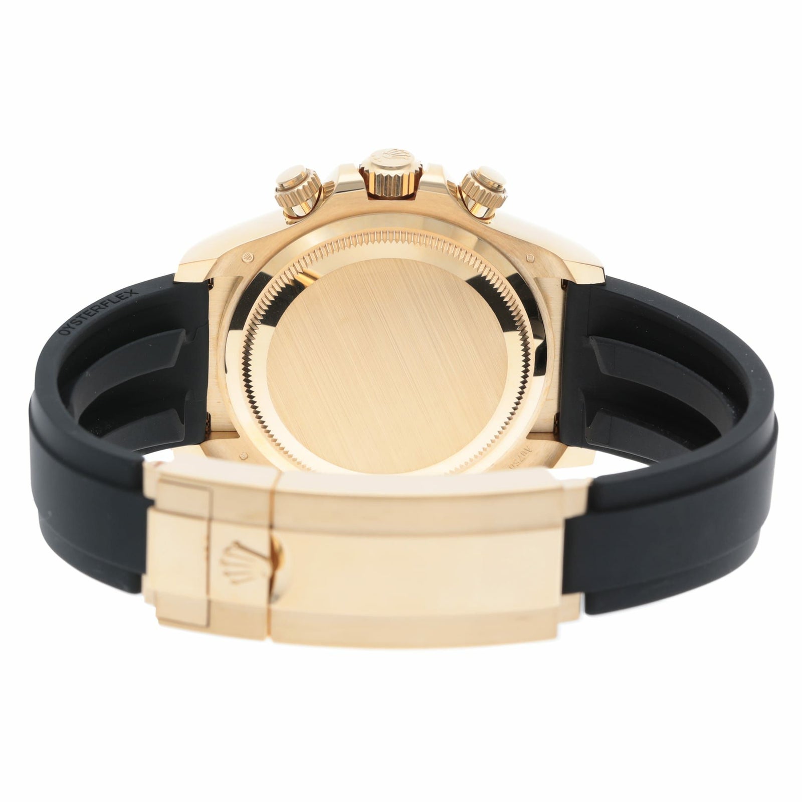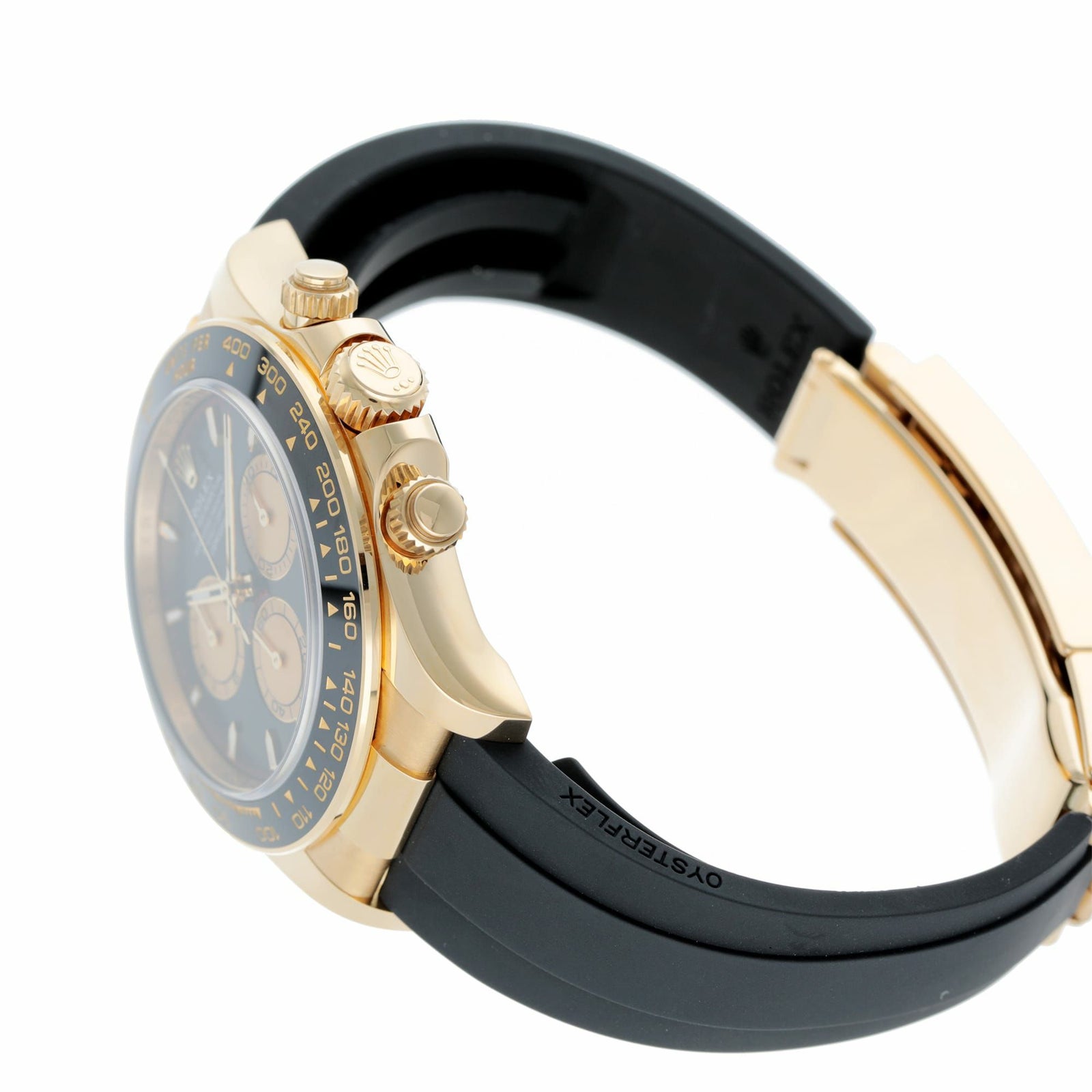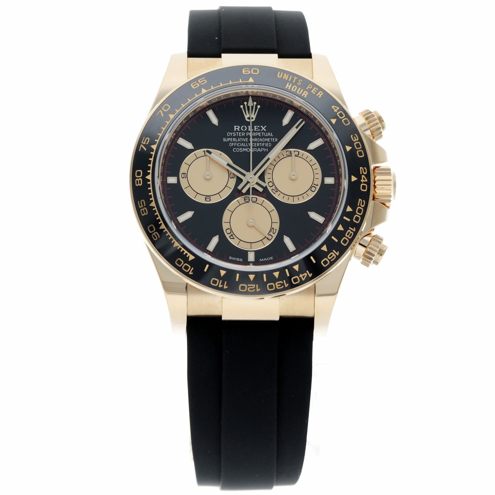 18Kイエローゴールドの“華”と、ブラックのセラクロムベゼル&ブラックダイヤルの“締まり”が同居した、完成度の高いデイトナです。ゴールドの迫力はしっかりあるのに、黒が効いているので派手すぎず大人っぽくまとまるのが魅力。さらにラバーストラップ(オイスターフレックス)仕様で、見た目はラグジュアリーなのに着け心地は軽快で、夏場や普段使いでもストレスが少ないのもポイントです。腕に乗せた瞬間に「特別感」と「使いやすさ」の両方が伝わる、主役級の一本です。