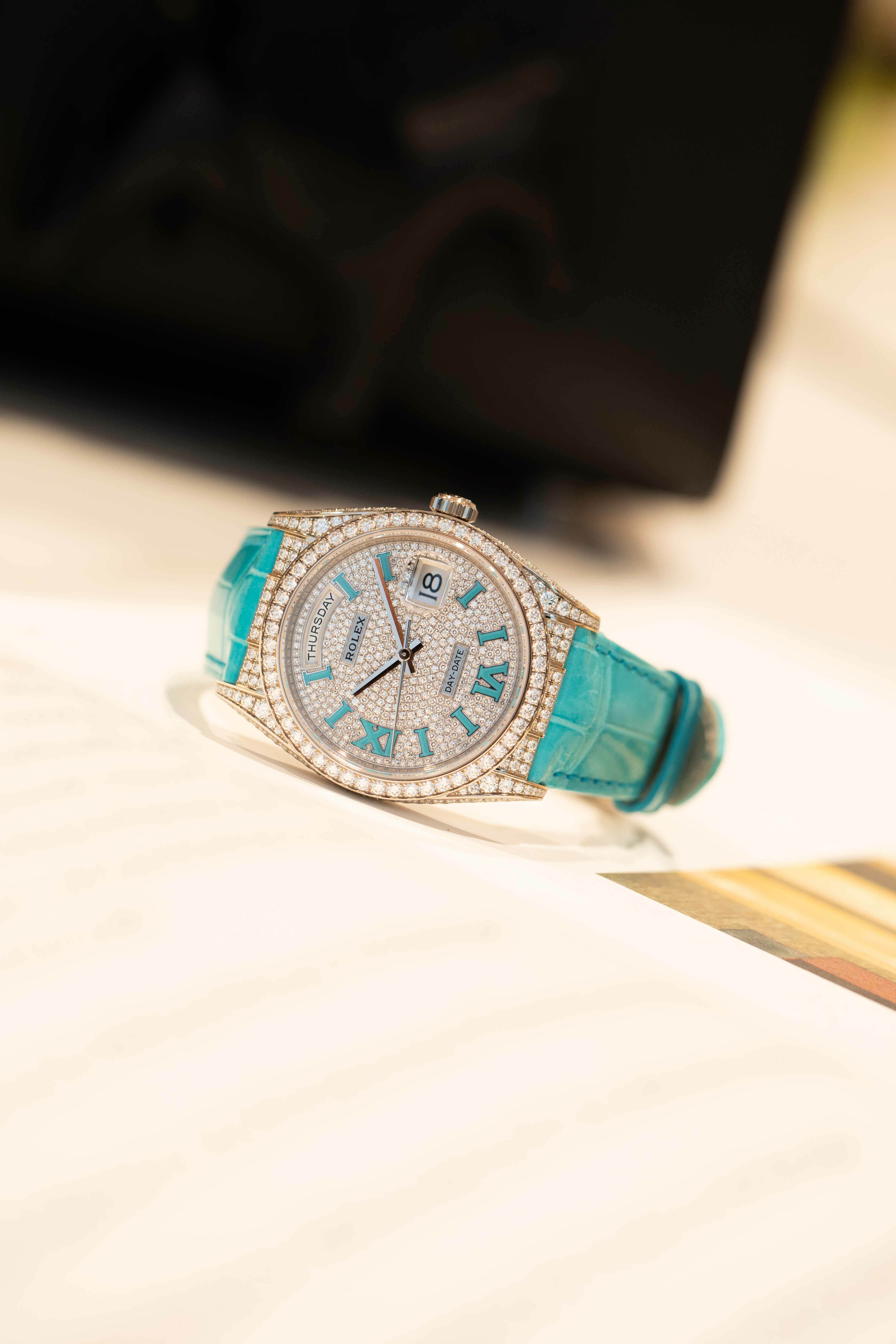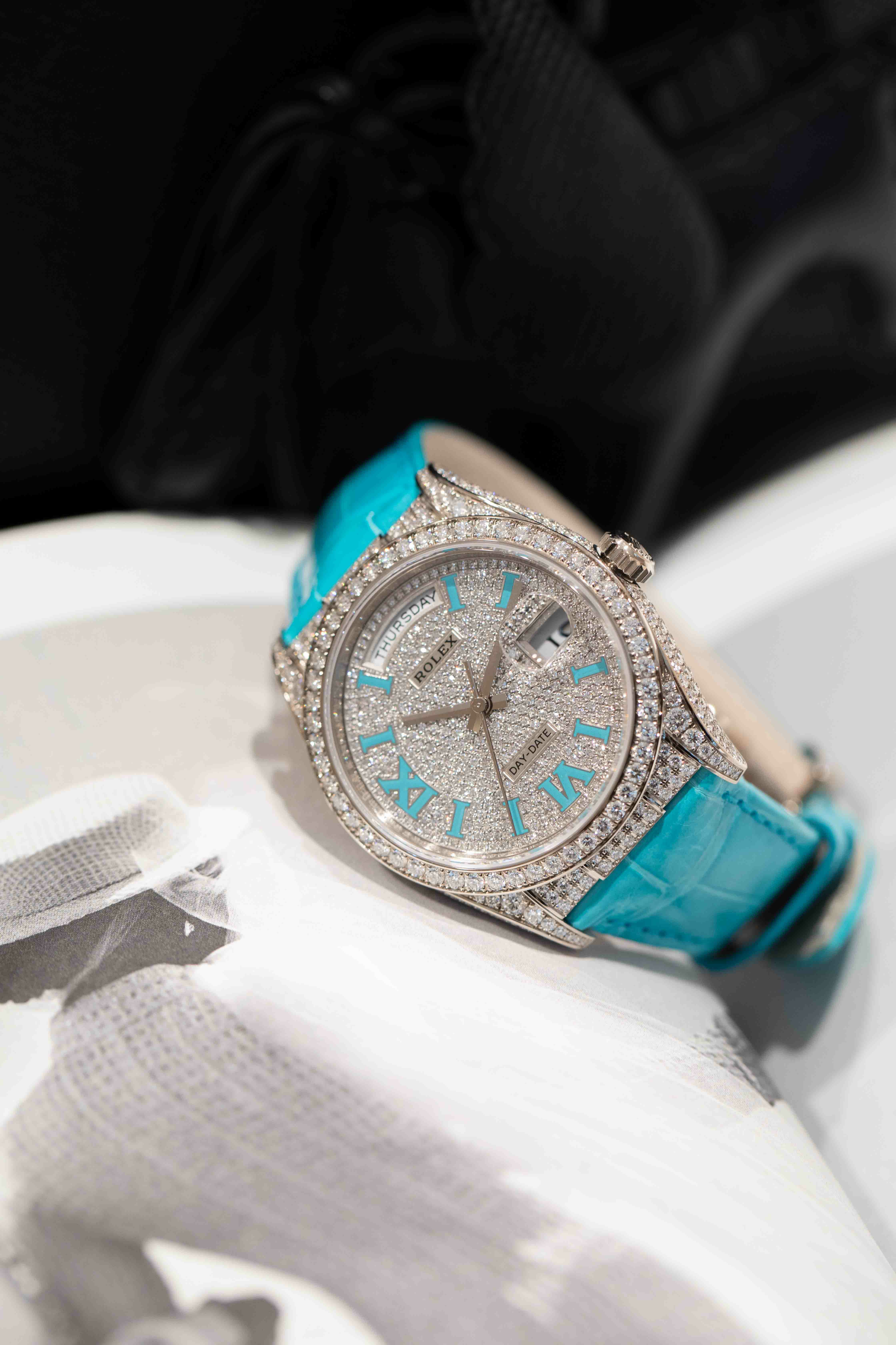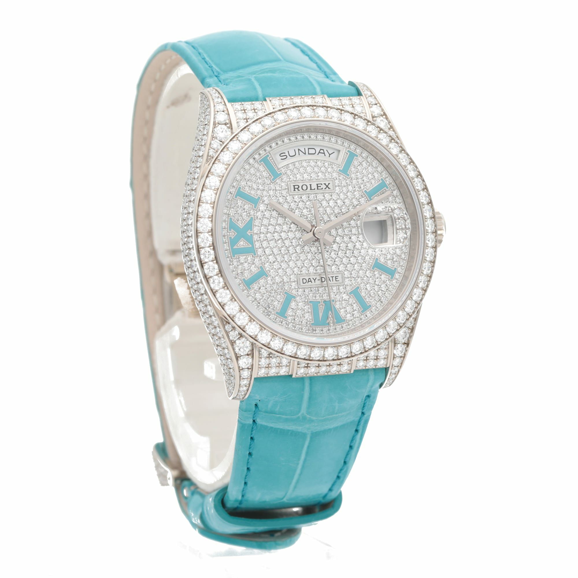 ロレックスの最上位ライン「デイデイト」を、18Kホワイトゴールド×ダイヤモンドセッティングで徹底的にラグジュアリーへ振り切った特別仕様です。36mmケースにダイヤベゼル、さらにフルパヴェダイヤ文字盤へ、アクセントとしてターコイズのローマ数字が入るデザインで、腕元の“華”が一瞬で伝わります。 機能面もデイデイトらしく、曜日フルスペル表示+日付を搭載。ムーブメントはCal.3255で、約70時間パワーリザーブ・100m防水と、見た目のジュエリー感だけでなく実用性もきちんと押さえています。