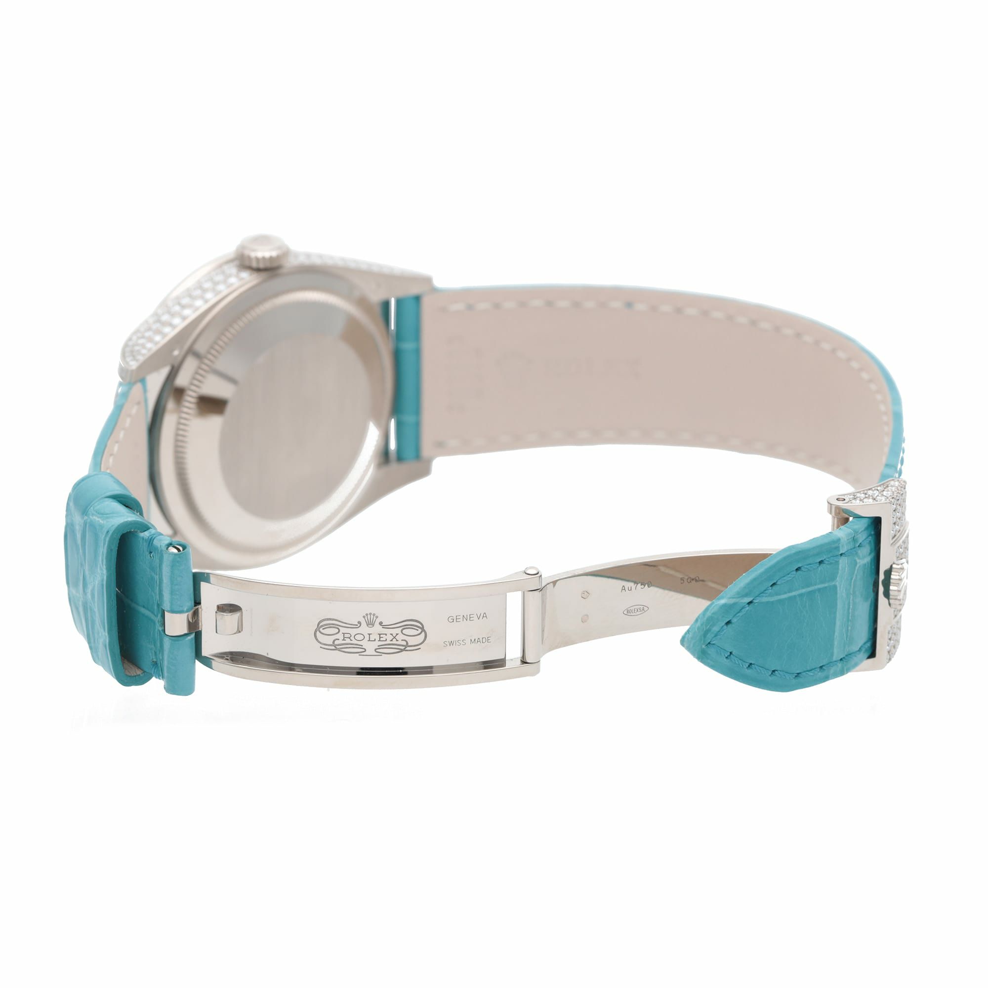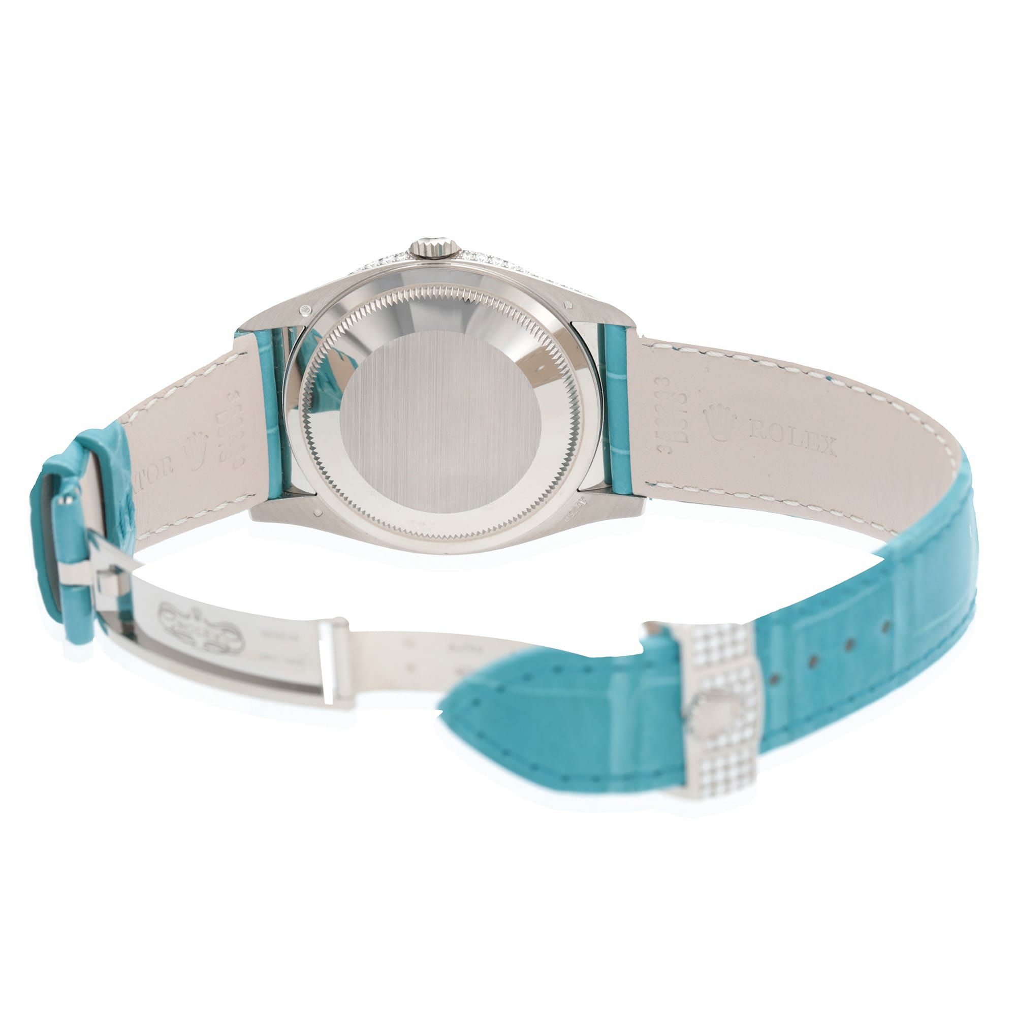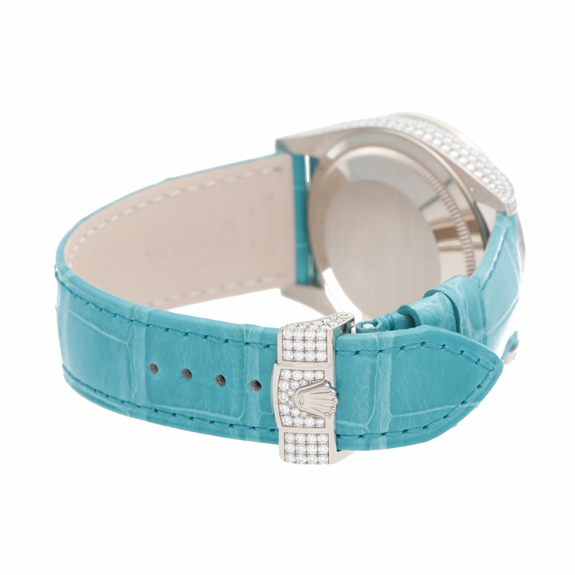 ロレックスの最上位ライン「デイデイト」を、18Kホワイトゴールド×ダイヤモンドセッティングで徹底的にラグジュアリーへ振り切った特別仕様です。36mmケースにダイヤベゼル、さらにフルパヴェダイヤ文字盤へ、アクセントとしてターコイズのローマ数字が入るデザインで、腕元の“華”が一瞬で伝わります。 機能面もデイデイトらしく、曜日フルスペル表示+日付を搭載。ムーブメントはCal.3255で、約70時間パワーリザーブ・100m防水と、見た目のジュエリー感だけでなく実用性もきちんと押さえています。