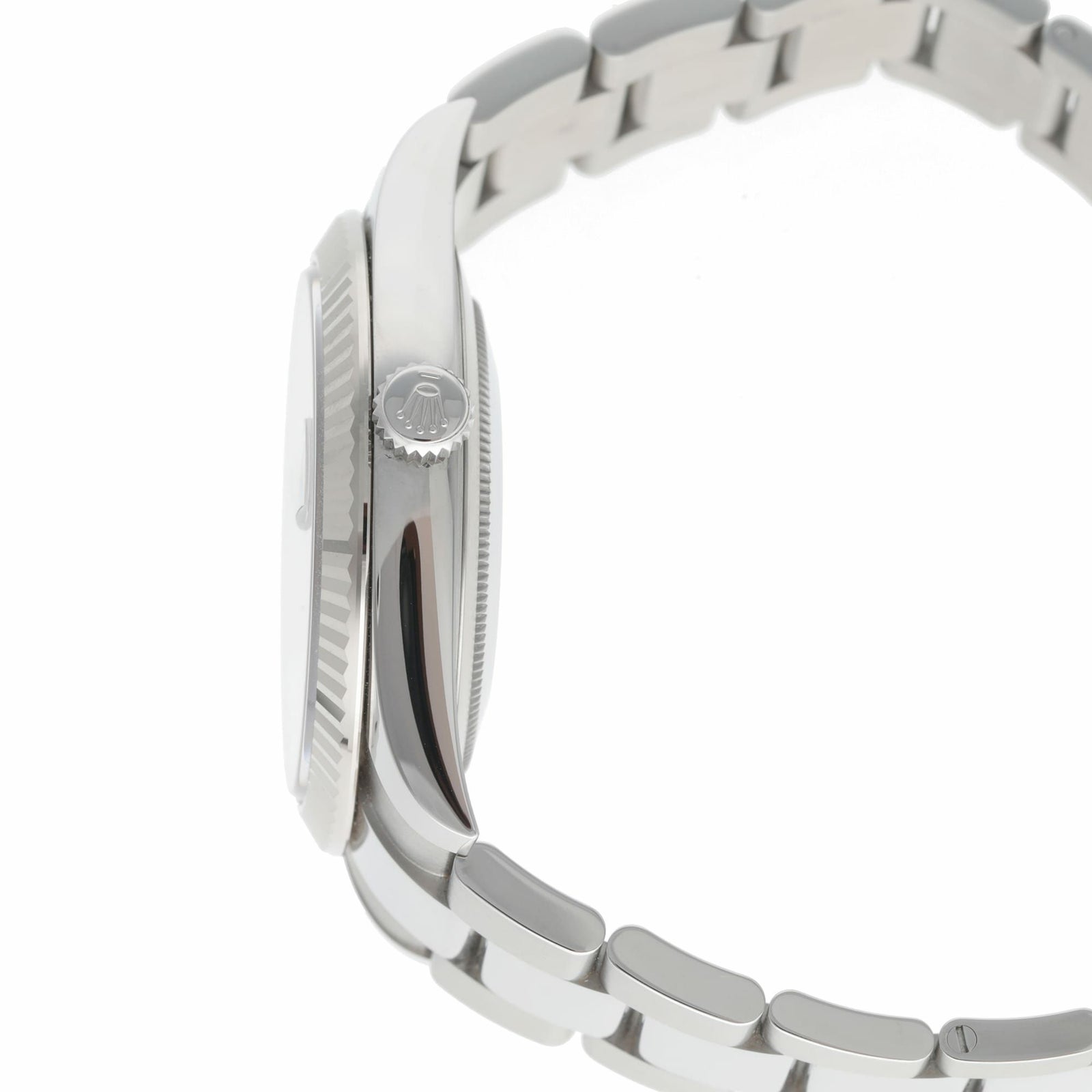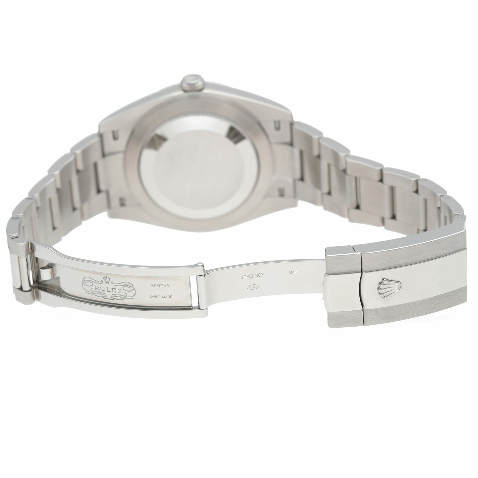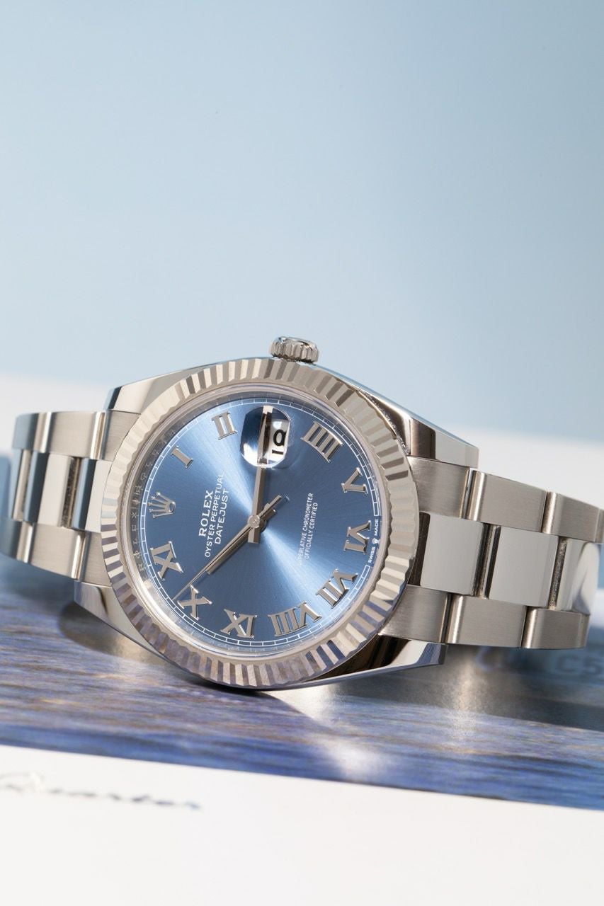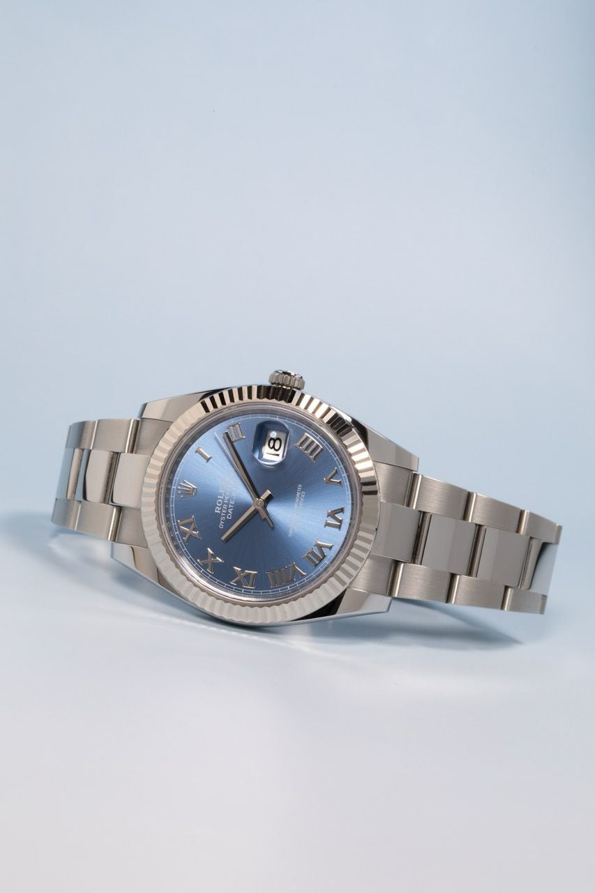 ステンレスの実用性に、ホワイトゴールド製フルーテッドベゼルの上品な輝きを加えた王道モデルです。41mmの程よい存在感がありながら、端正なデザインでスーツにもカジュアルにも自然に馴染みます。派手さではなく質感で高級感が伝わり、毎日使っても飽きにくい一本です。
