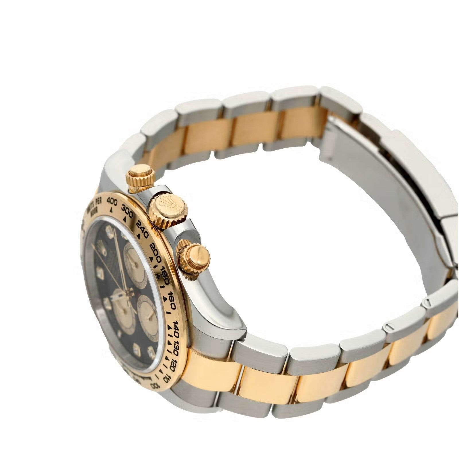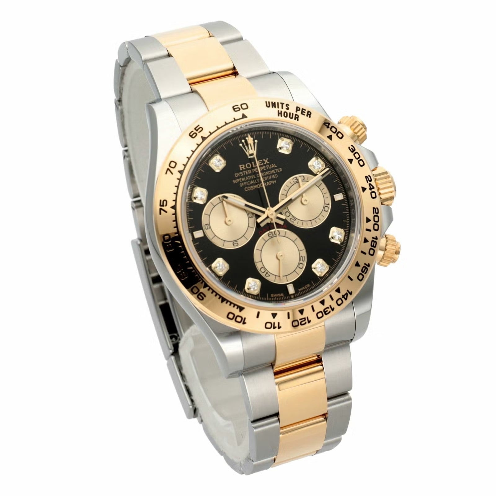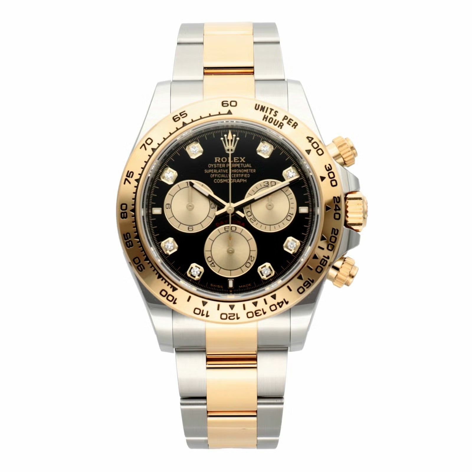 デイトナのスポーティさに、イエローゴールド×ステンレスの華やかさとダイヤインデックスの特別感を加えたラグジュアリーな一本です。40mmケースに、イエローゴールドのタキメーターベゼルとオイスターブレスを組み合わせることで、華やかさはありつつ全体はしっかり引き締まって見えるのが魅力。文字盤は仕様違いがありますが、代表的なブラック系ではゴールデンカウンターリングが映えて、腕元にかなり高級感が出ます。
