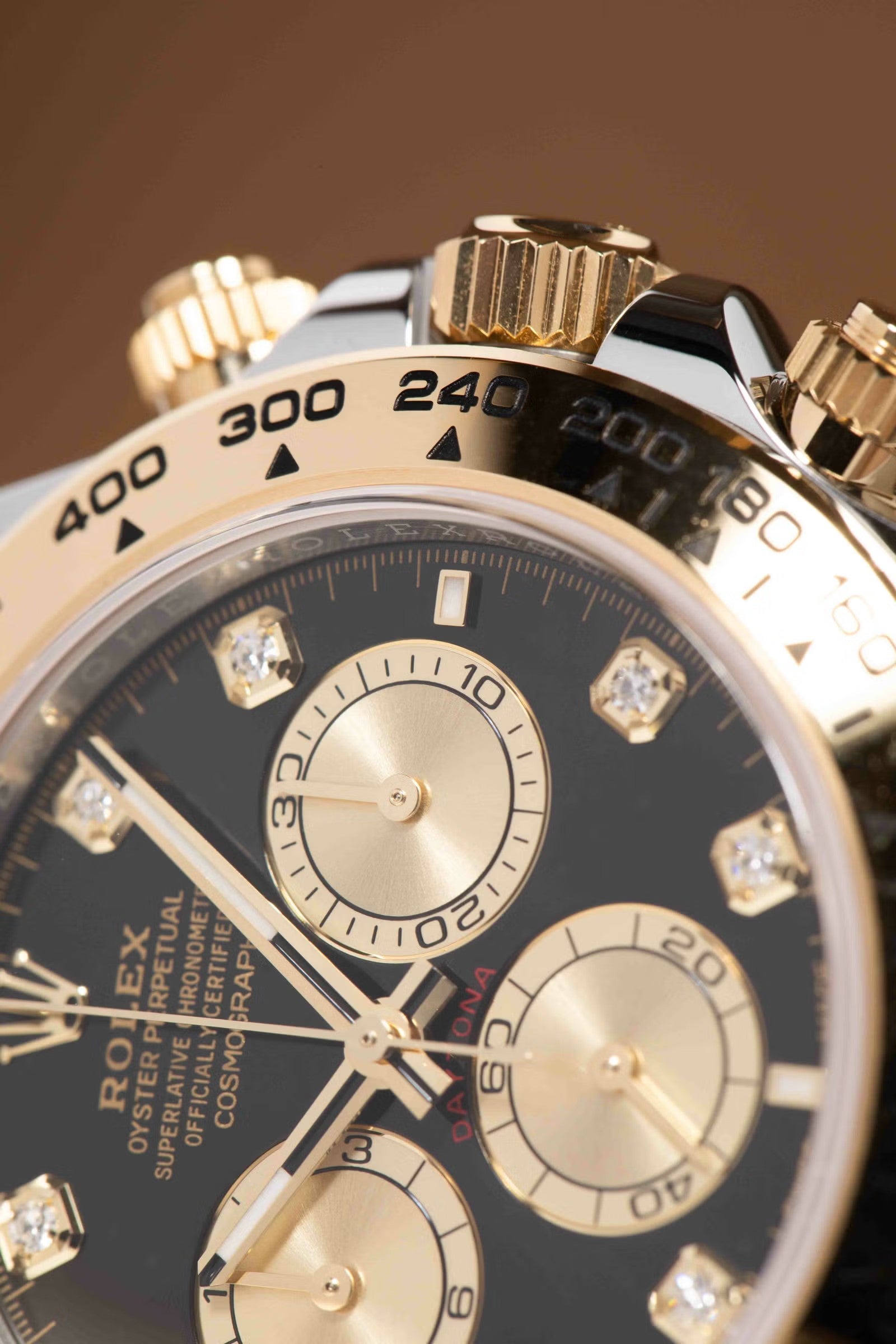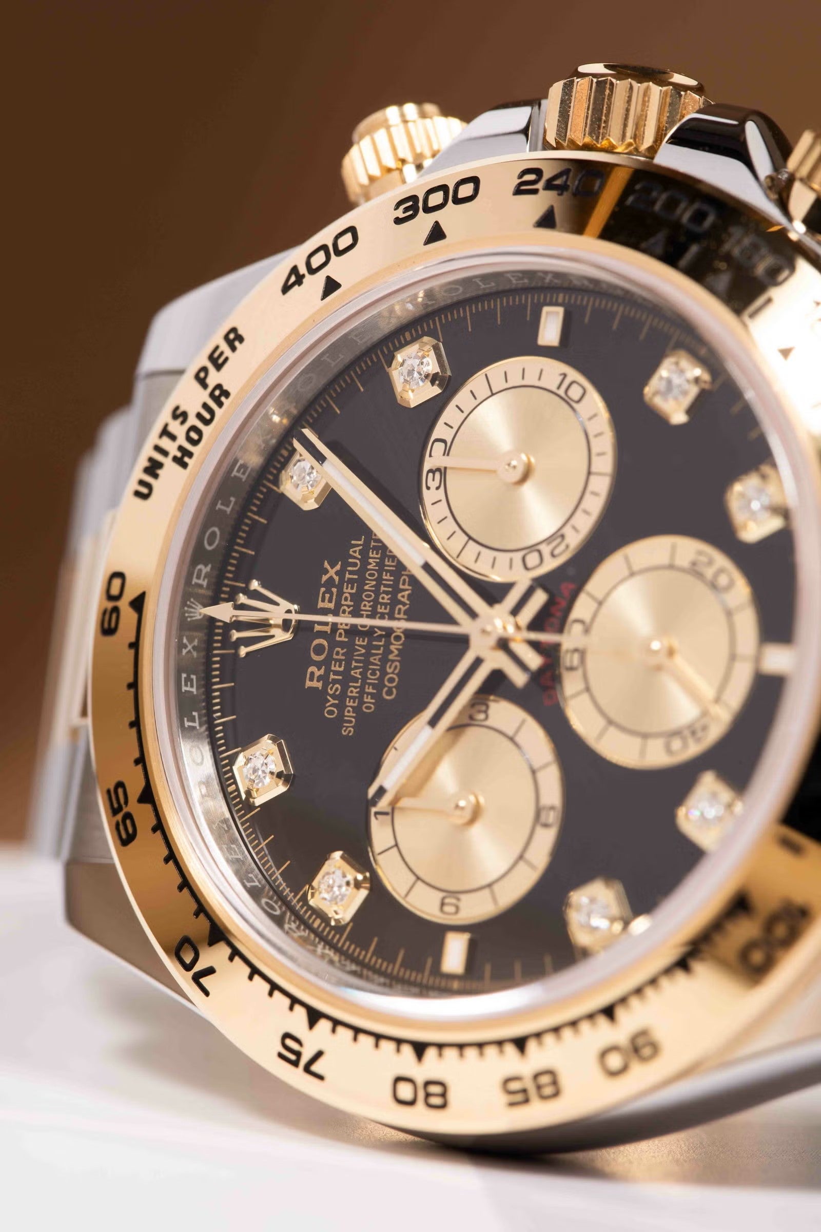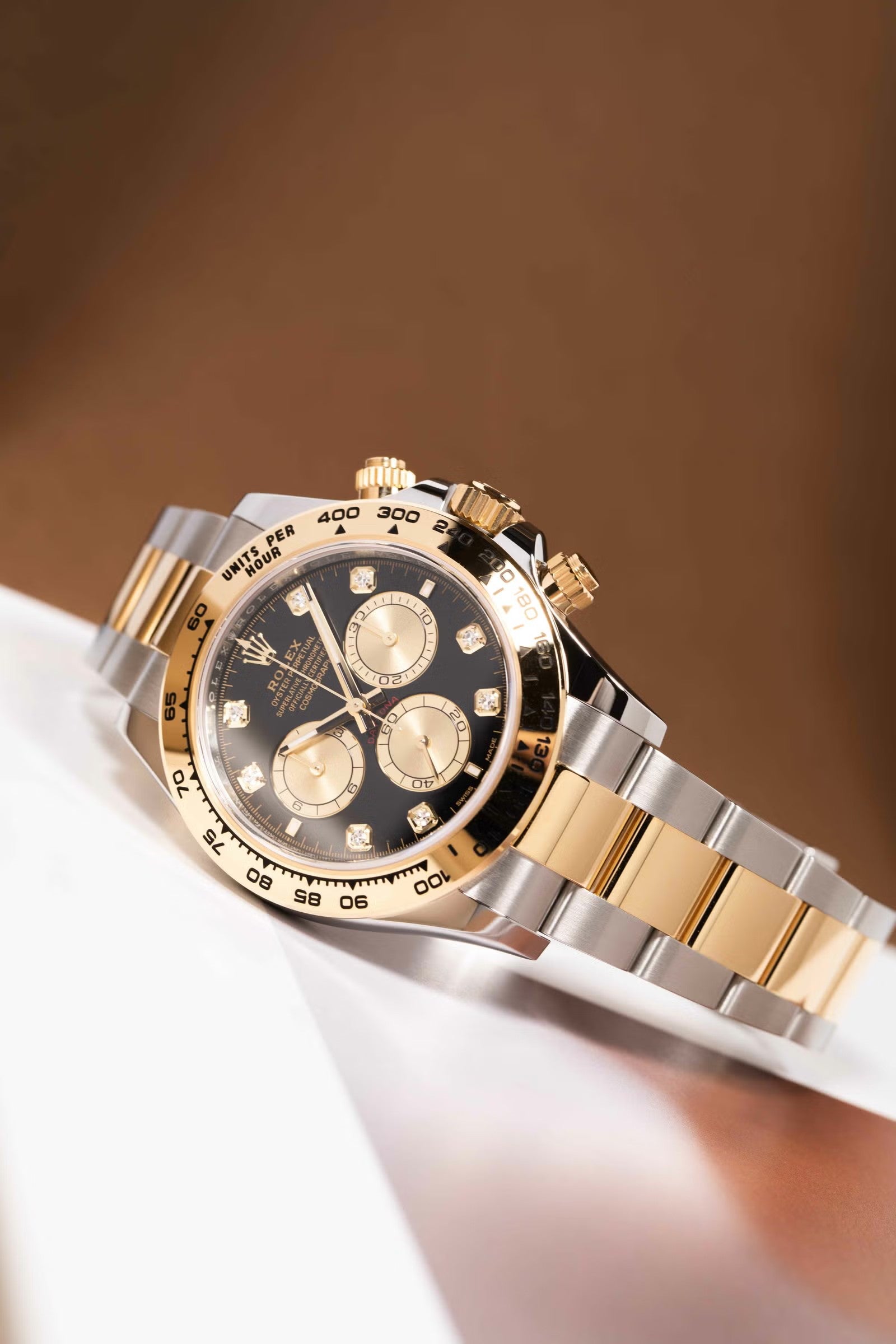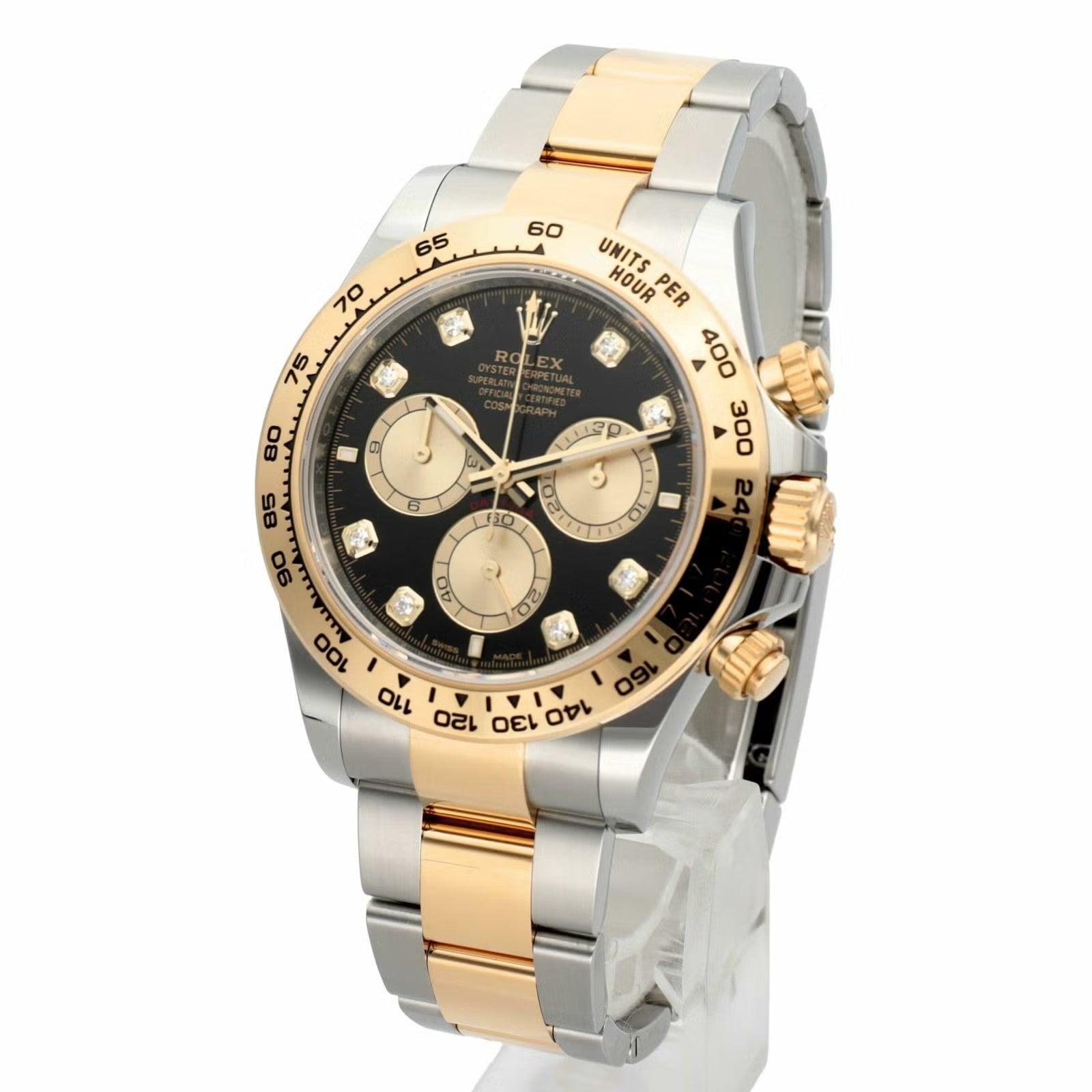デイトナのスポーティさに、イエローゴールド×ステンレスの華やかさとダイヤインデックスの特別感を加えたラグジュアリーな一本です。40mmケースに、イエローゴールドのタキメーターベゼルとオイスターブレスを組み合わせることで、華やかさはありつつ全体はしっかり引き締まって見えるのが魅力。文字盤は仕様違いがありますが、代表的なブラック系ではゴールデンカウンターリングが映えて、腕元にかなり高級感が出ます。