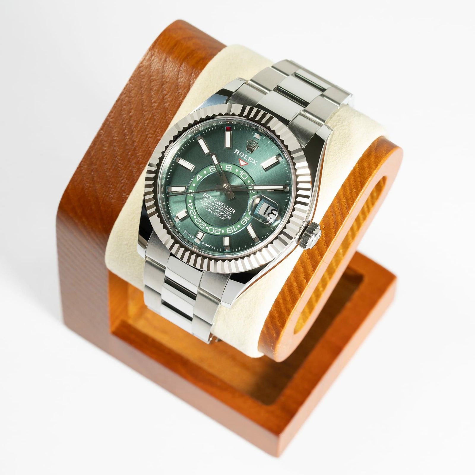 ロレックスの中でも“実用的な複雑機構”を上品に楽しめる、ワンランク上のトラベルウォッチです。42mmケースに、オイスタースチール×ホワイトゴールドのホワイトロレゾール仕様を採用し、フルーテッドベゼルの高級感がしっかりありながら、全体はとても上品にまとまります。さらにこのモデルは、年次カレンダー(サロス)と第2時間帯表示を備え、旅行や出張でも使い勝手が高いのが魅力です。