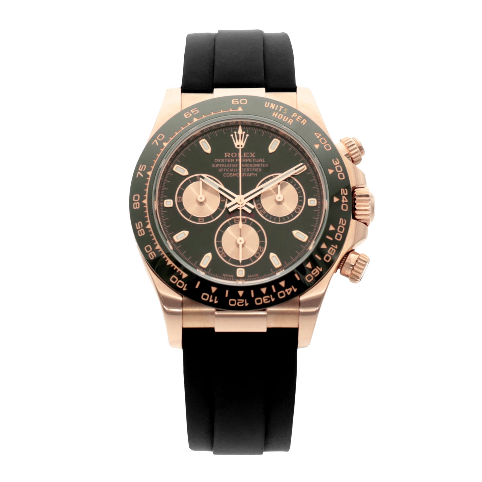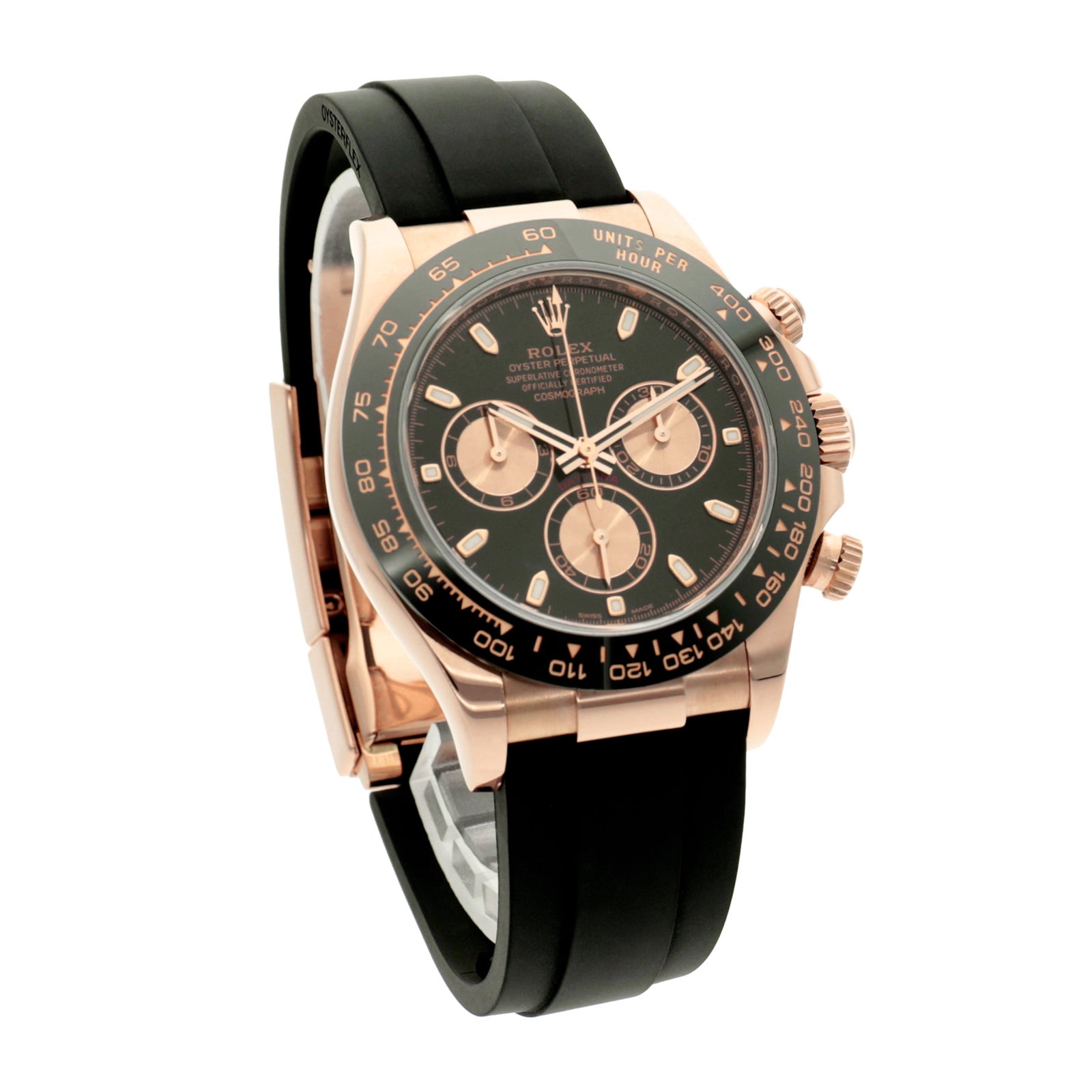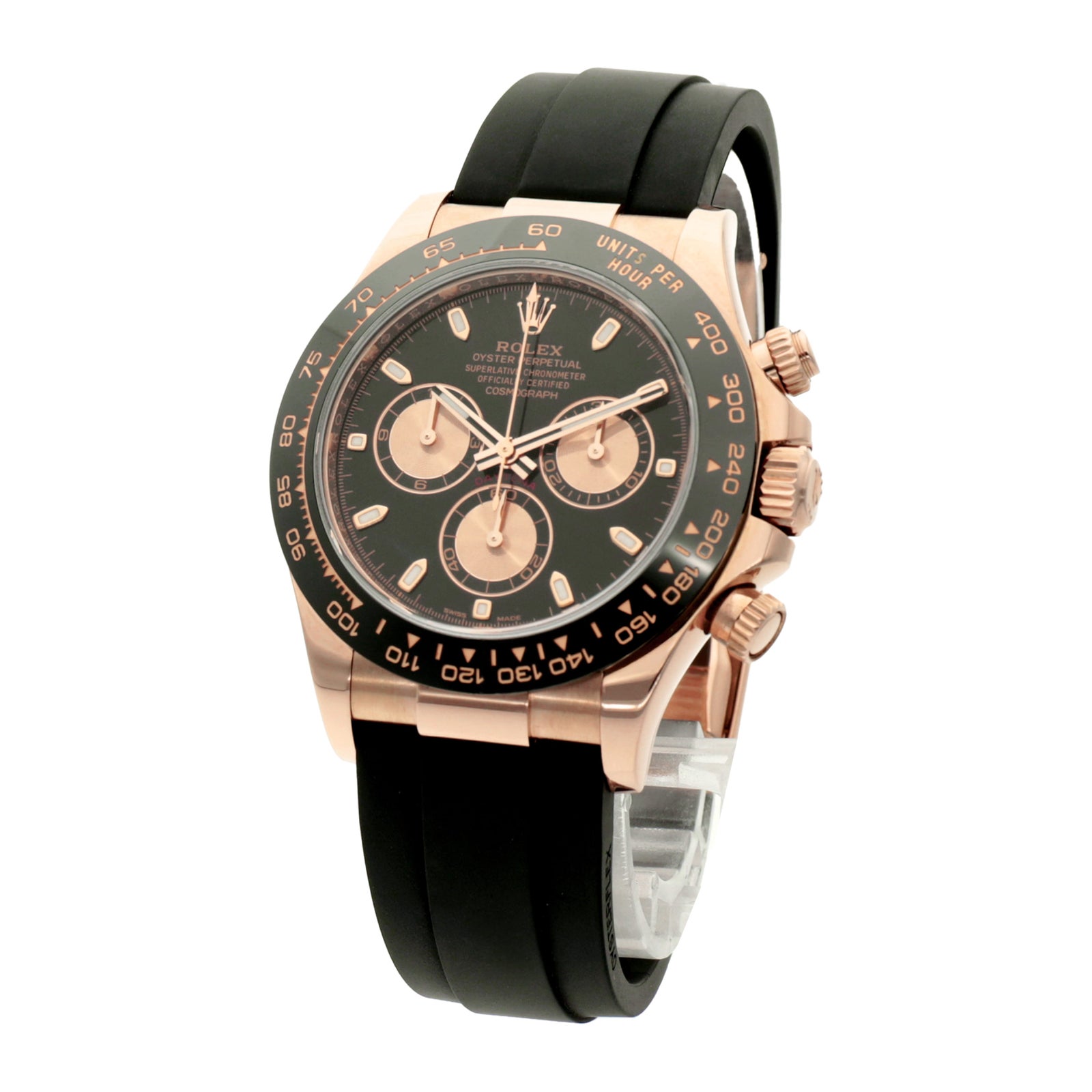 エバーローズゴールドの華やかさに、ブラックのセラクロムベゼルとオイスターフレックスブレスのスポーティさを組み合わせた、非常に完成度の高い一本です。ゴールドモデルでありながら重たく見えすぎず、黒が全体を引き締めてくれるので、ラグジュアリーなのに大人っぽくまとまるのが魅力。仕様違いでチョコレート系やメテオライトなどの文字盤バリエーションもあり、どれも腕に乗せた瞬間に特別感がしっかり伝わるモデルです。