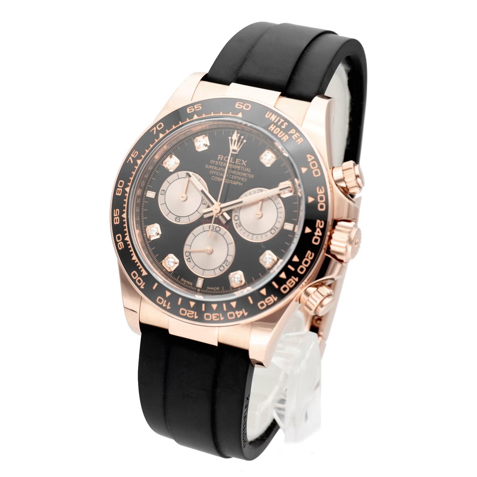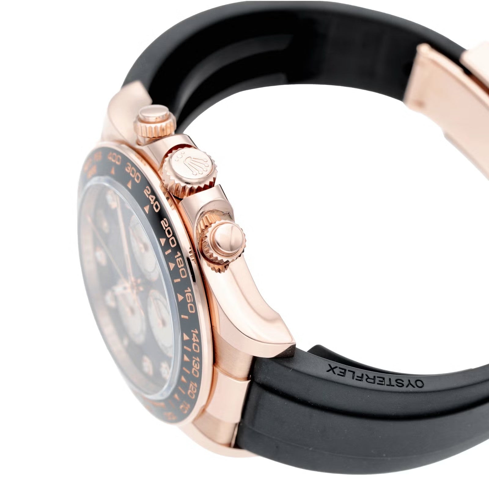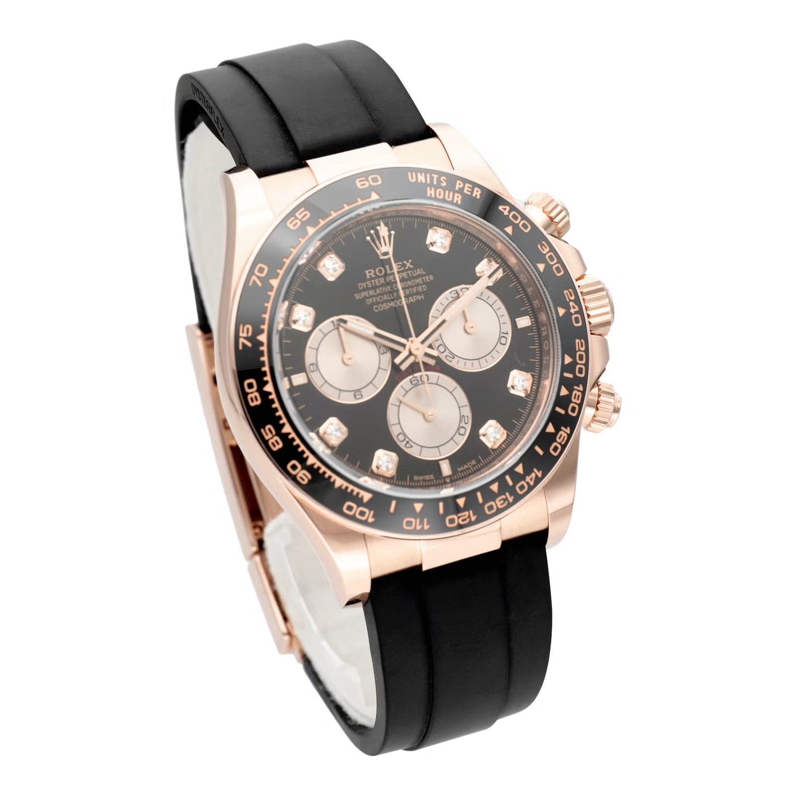 18 ct エバーローズゴールドの華やかさに、ブラック セラクロムベゼルとオイスターフレックス ブレスレットのスポーティさを組み合わせた、非常に完成度の高い一本です。さらにこの仕様はブライトブラック&サンダストのダイヤセット文字盤が入ることで、通常モデルよりも手元の特別感がぐっと増し、ラグジュアリーなのに大人っぽくまとまるのが魅力。ケースは40mm、ムーブメントはCal.4131、約72時間パワーリザーブ、100m防水と実用性も高く、見た目だけでなく普段使いでもしっかり満足感が得られるモデルです。