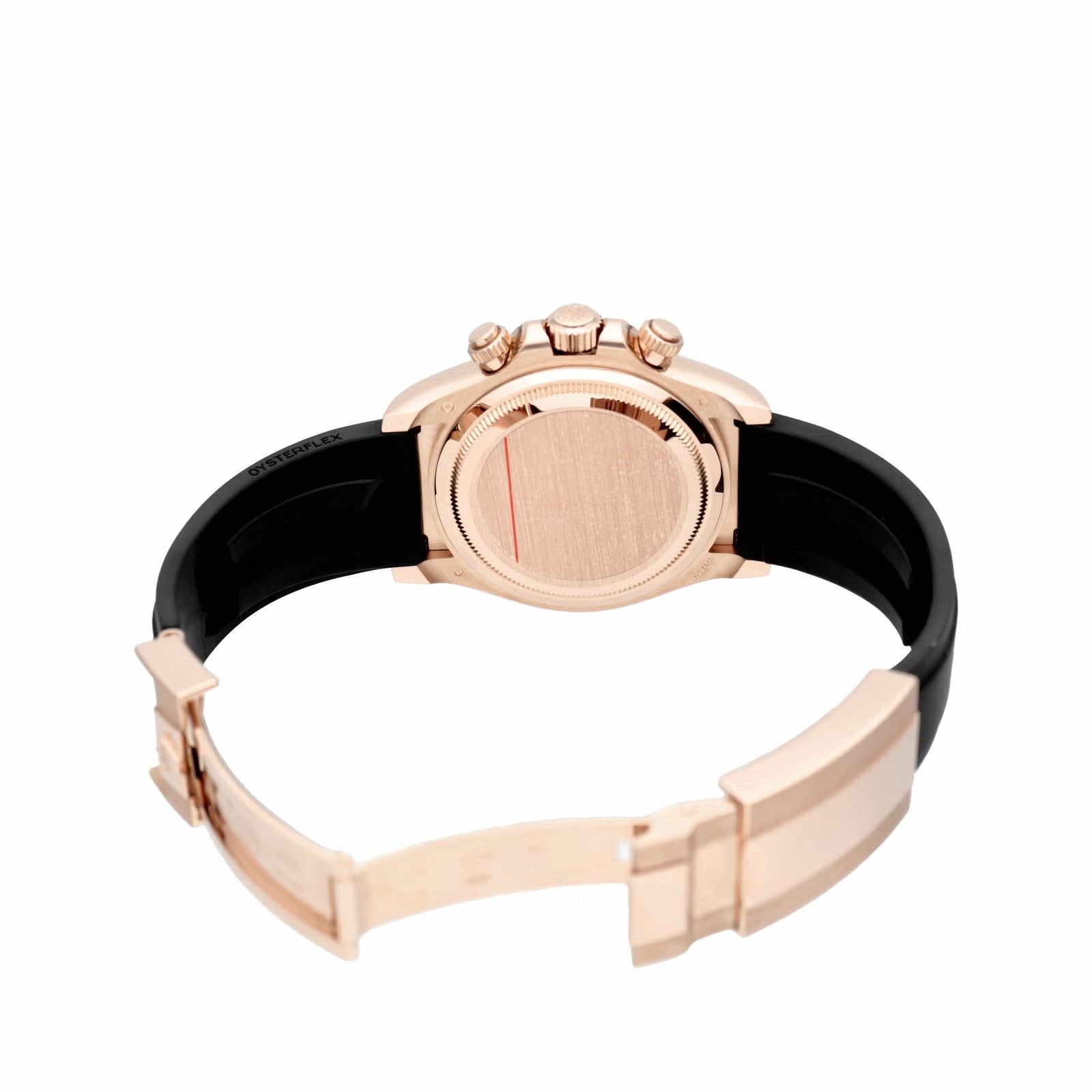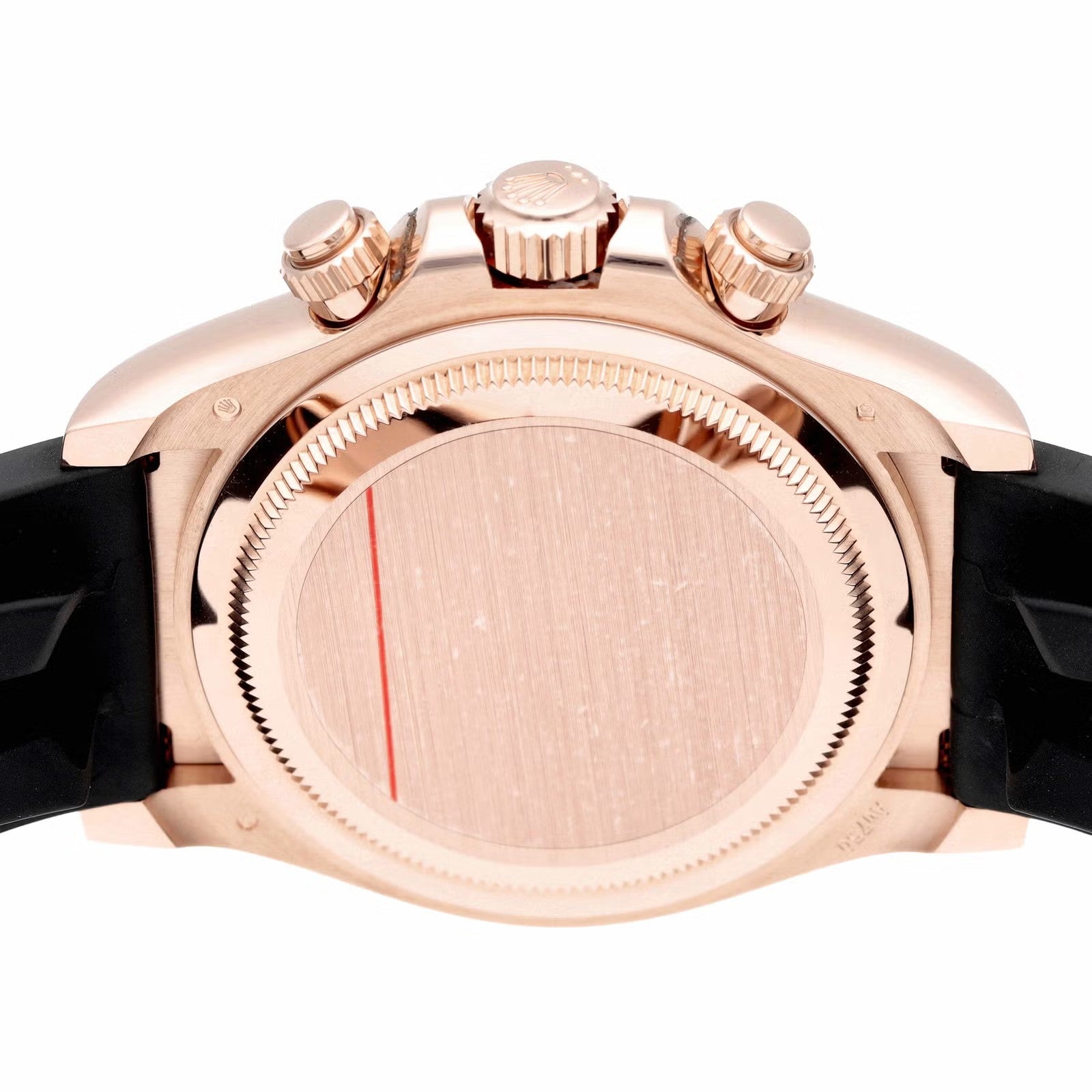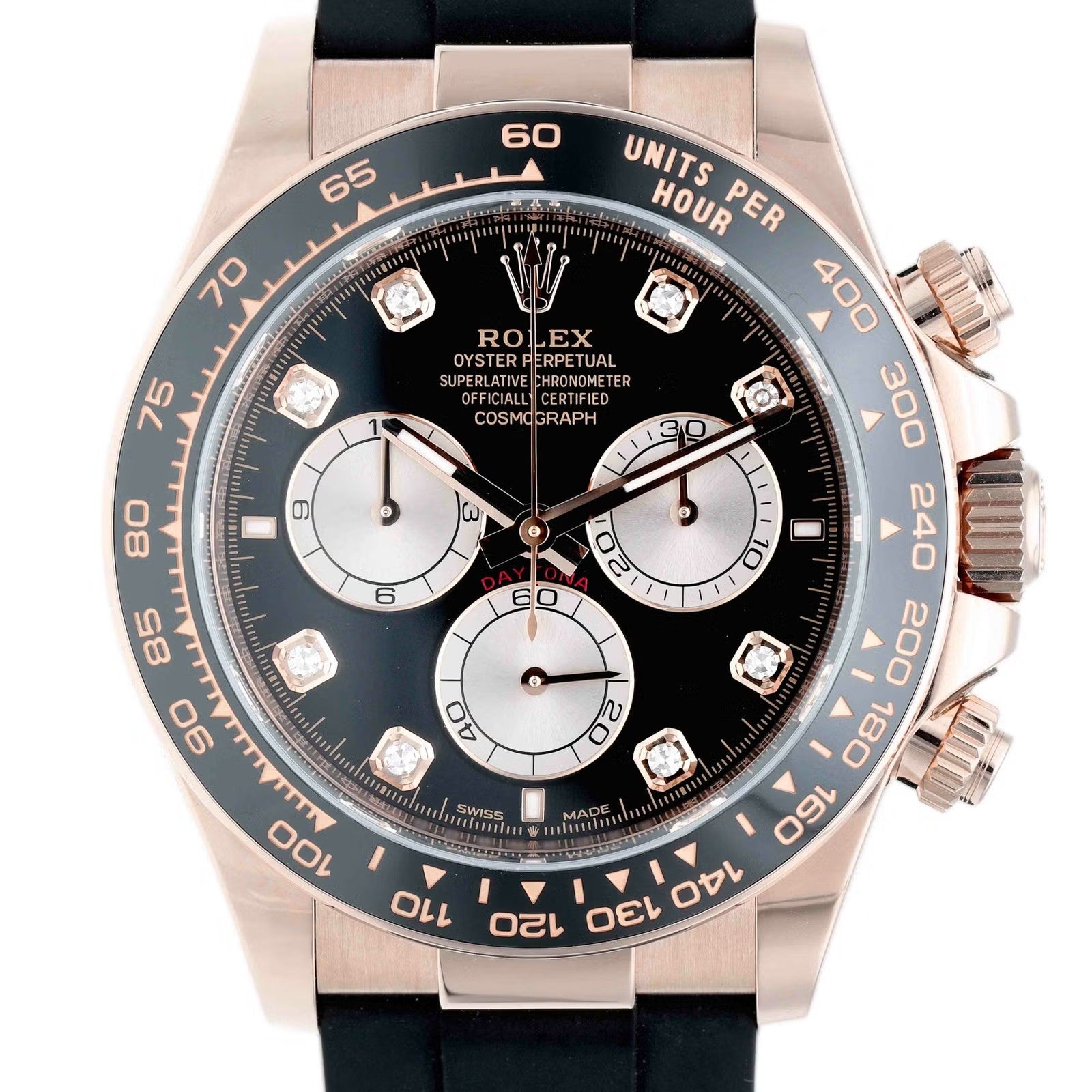 18 ct エバーローズゴールドの華やかさに、ブラック セラクロムベゼルとオイスターフレックス ブレスレットのスポーティさを組み合わせた、非常に完成度の高い一本です。さらにこの仕様はブライトブラック&サンダストのダイヤセット文字盤が入ることで、通常モデルよりも手元の特別感がぐっと増し、ラグジュアリーなのに大人っぽくまとまるのが魅力。ケースは40mm、ムーブメントはCal.4131、約72時間パワーリザーブ、100m防水と実用性も高く、見た目だけでなく普段使いでもしっかり満足感が得られるモデルです。