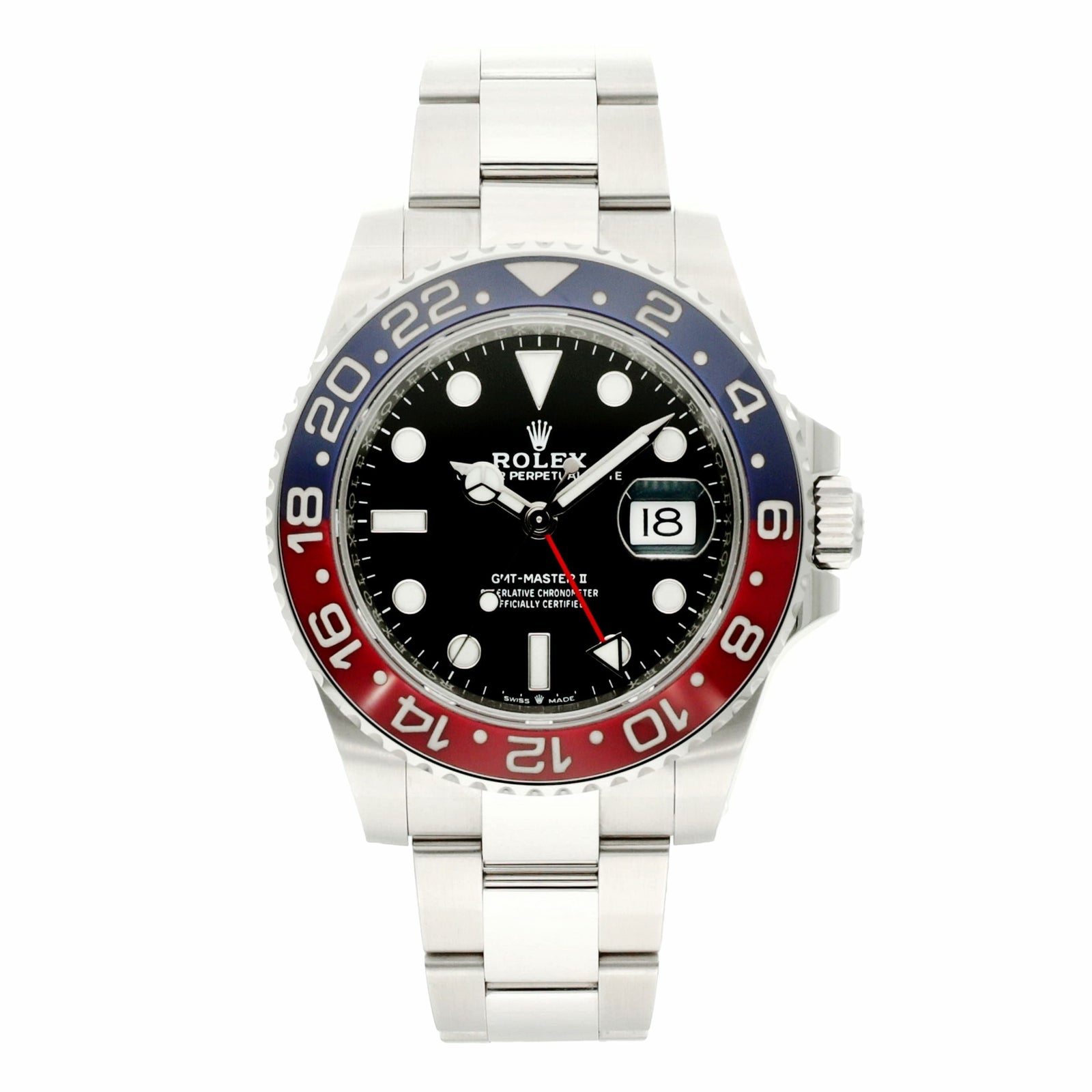 赤×青の“ペプシ”ベゼルが象徴的な超人気モデルを、よりスポーティに楽しめる一本です。オイスターブレスは見た目が引き締まり、ジュビリーよりも硬派でアクティブな印象になるのが魅力。GMT機能で2つの時間帯を同時に把握できる実用性も高く、旅行や出張はもちろん普段使いでも頼れるモデルです。存在感はしっかりありつつ、配色は爽やかで上品なので、カジュアルからジャケットスタイルまで幅広く合わせやすいのもポイント。写真より実物のベゼルの発色と質感が綺麗で、腕に乗せた瞬間の満足感が高い“鉄板のGMT”です。