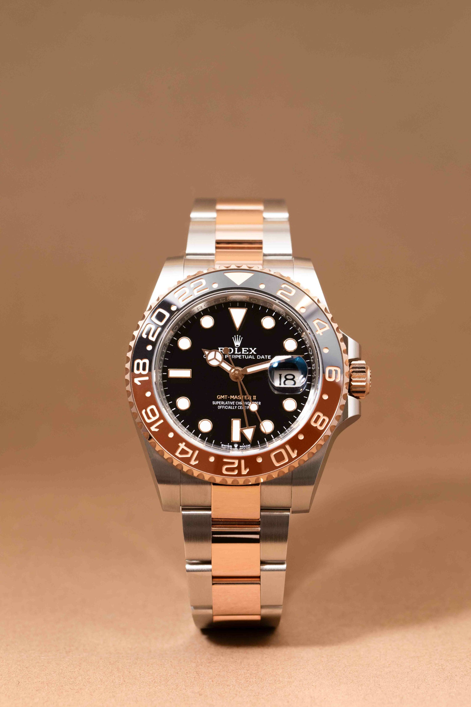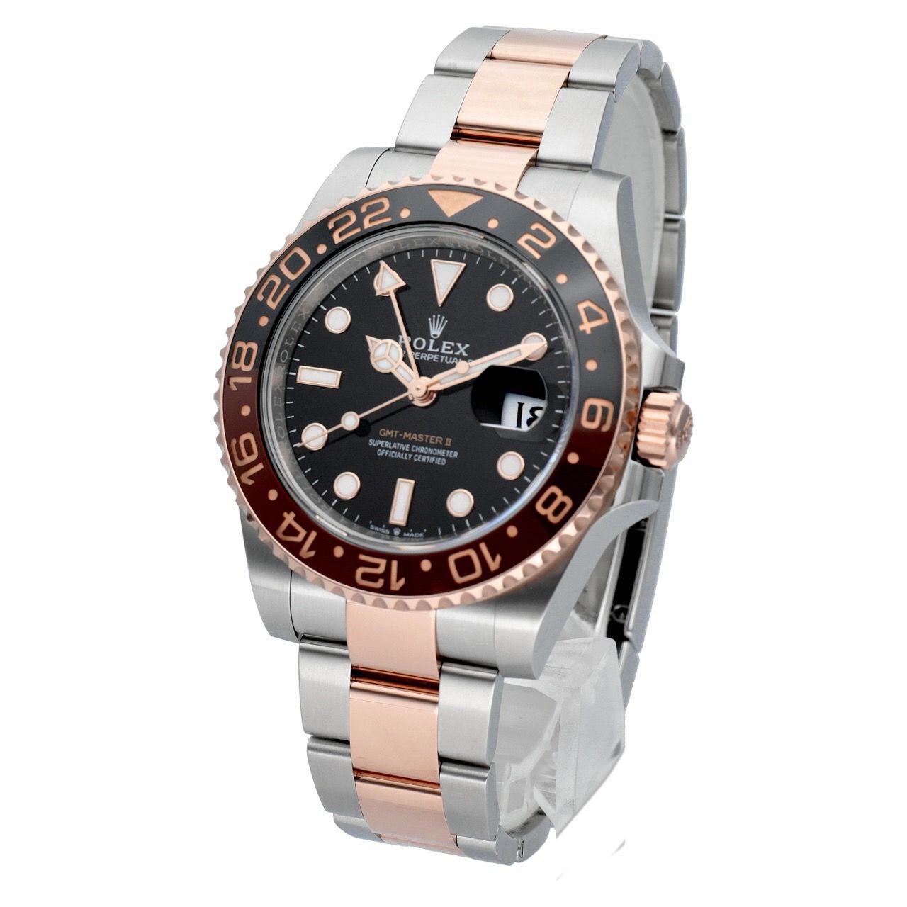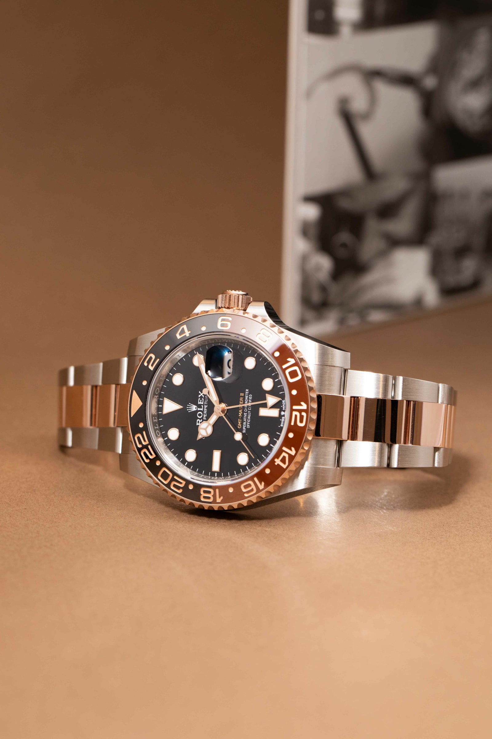エバーローズゴールドとステンレスを組み合わせた上品なコンビ仕様に、ブラウン×ブラックのツートンベゼルが映える人気モデルです。通称“ルートビア”とも呼ばれ、スポーティさがありながらどこか大人っぽく、腕元がぐっと落ち着いて見えるのが魅力。40mmケースにオイスターブレスを合わせることで、華やかさはありつつ全体はしっかり引き締まり、スーツにもカジュアルにも合わせやすい一本です。