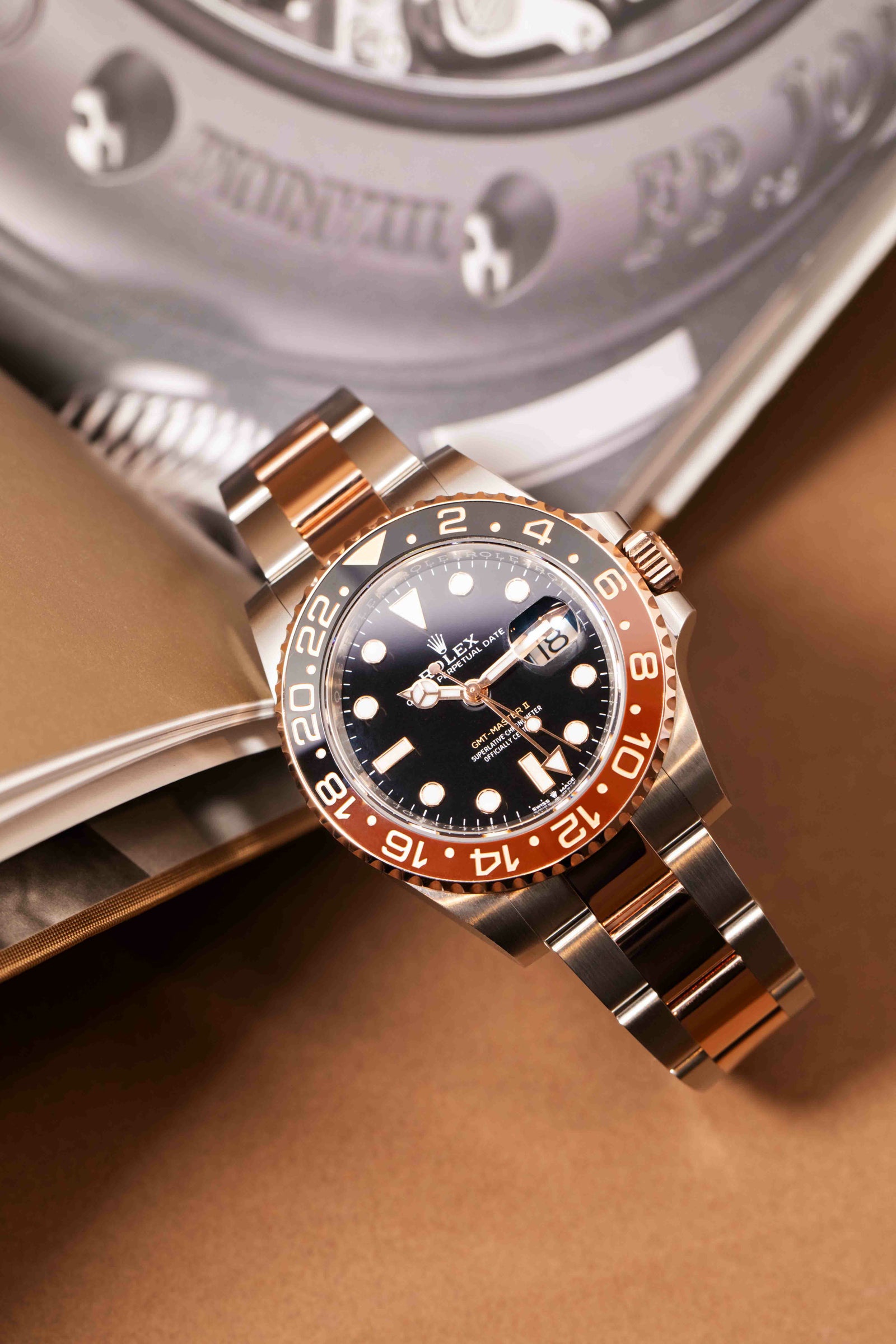 機能面もGMTマスターIIらしく実用的で、第2時間帯表示と独立可動の時針により、旅行や出張でも使いやすい仕様です。ムーブメントはCal.3285で、約70時間パワーリザーブ、100m防水と日常使いでも安心感があります。