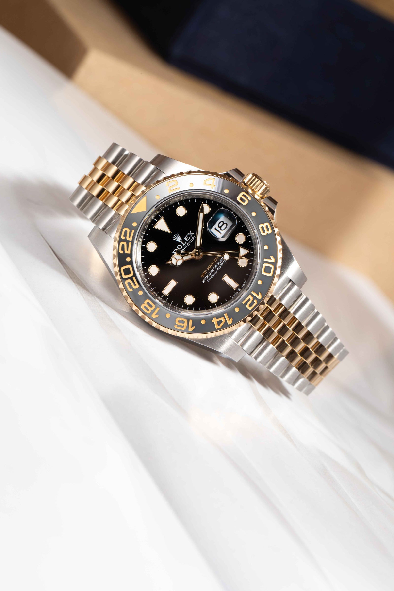 イエローゴールド×オイスタースチールのコンビ(イエローロレゾール)が持つ華やかさと、GMTマスターⅡらしい実用性を一度に楽しめる注目モデルです。グレー×ブラックの24時間回転ベゼルとブラックダイアルの引き締まった表情が相まって、ラグジュアリーなのに派手すぎず“大人のスポーツロレックス”として腕元が綺麗にまとまります。ジュビリーブレスはしなやかで着け心地が良く、スーツにもカジュアルにも合わせやすいのも魅力。2タイムゾーン表示ができるGMT機能で旅行や出張にも強く、日常使いから特別な一本まで幅広く活躍してくれます。