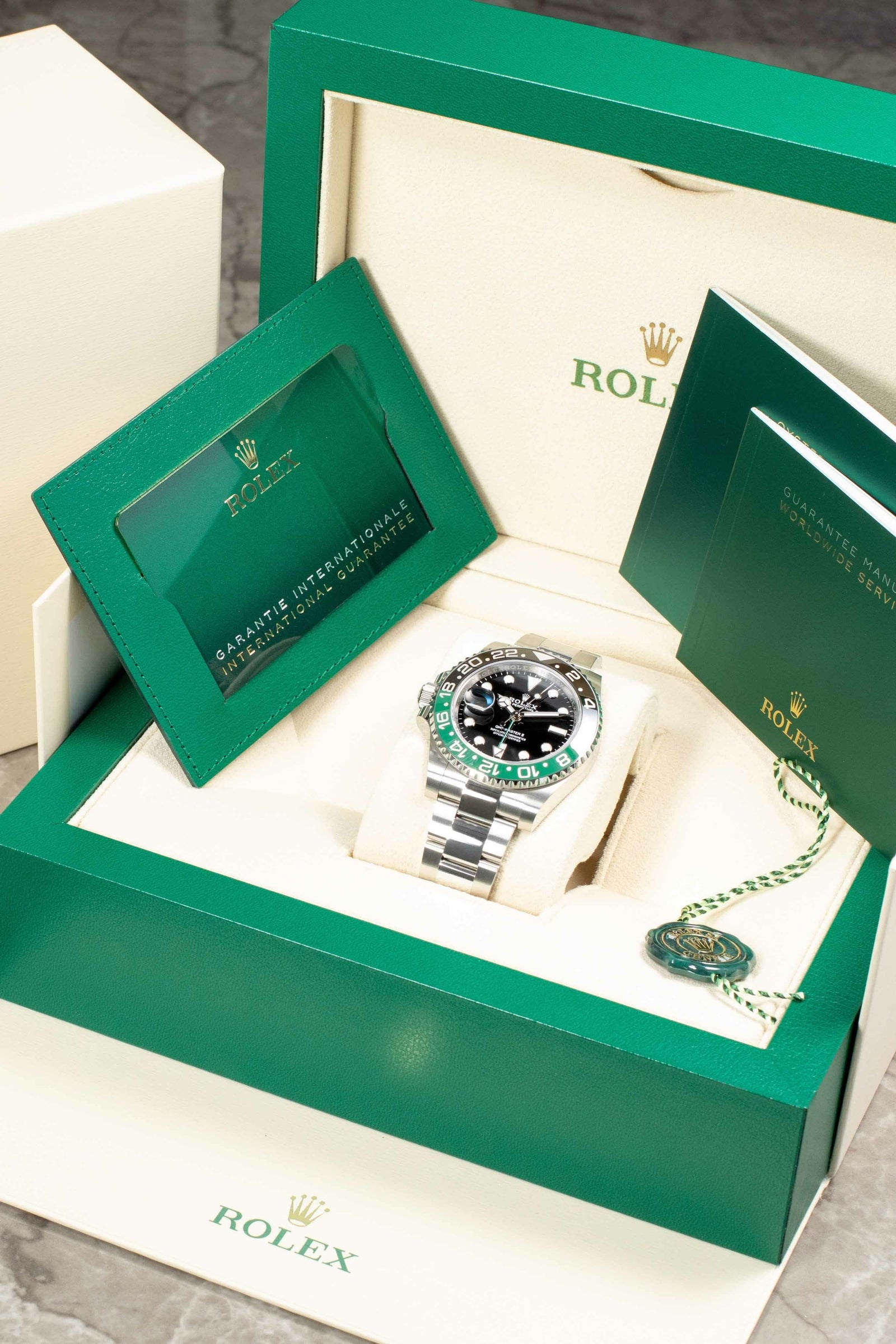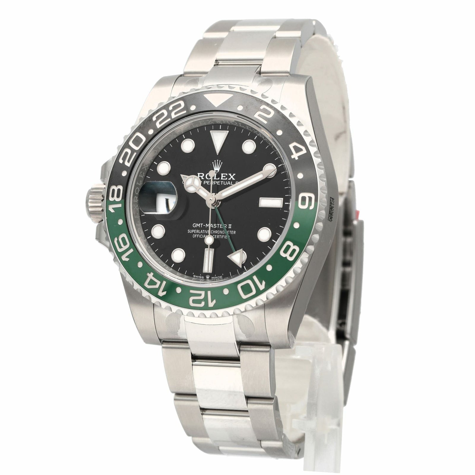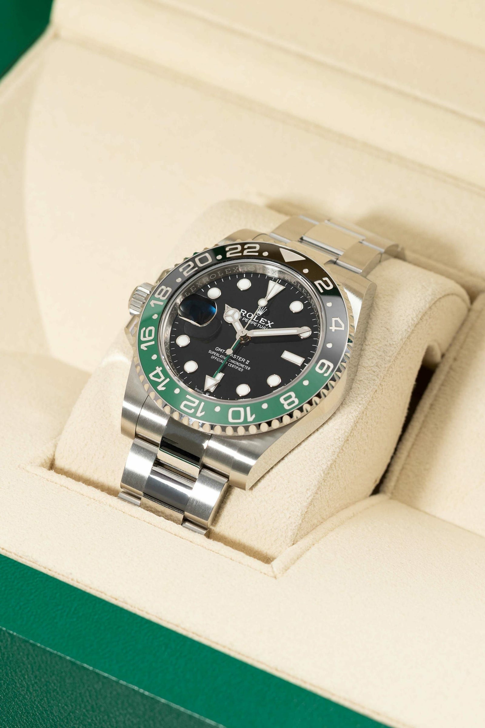 2022年の新作「126720VTNR GMTマスターII」の特徴は、レフティ用に制作された左リューズ。右利きの方が左手に装着しても手に当たることはほとんど無く、リューズ操作も簡単に行えます。さらにベゼルはグリーンとブラックになり、コーポレートカラーをベゼルとGMT針に取り入れた珍しさも話題となりました。 単独で動く短針とGMT針、両回転式のベゼルを操作することで第3か国までの時刻を表示することが出来ます。クロノメーター認定の自社ムーブメント3285搭載、パワーリザーブ約70時間、100m防水仕様になります。 ブレスレットの長さを約5 mm延長させることができ、あらゆる場面でより快適な装着感が実現できます。