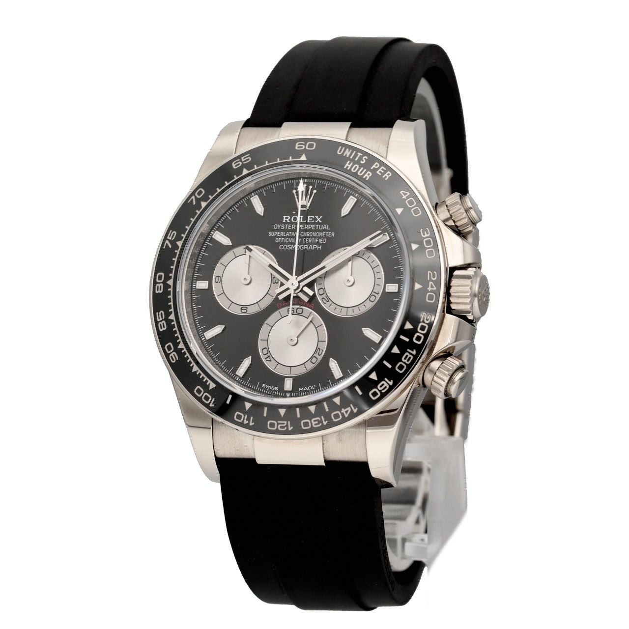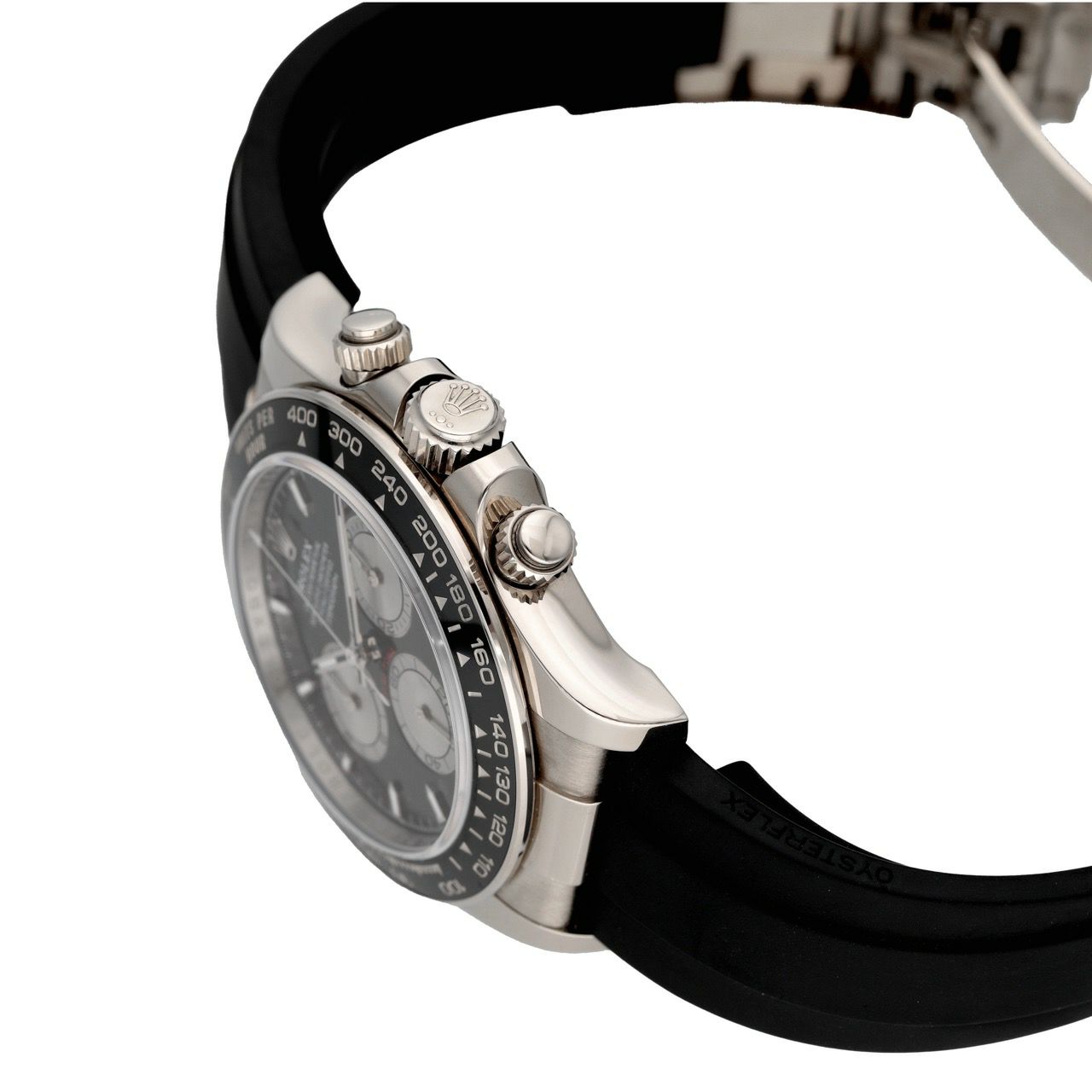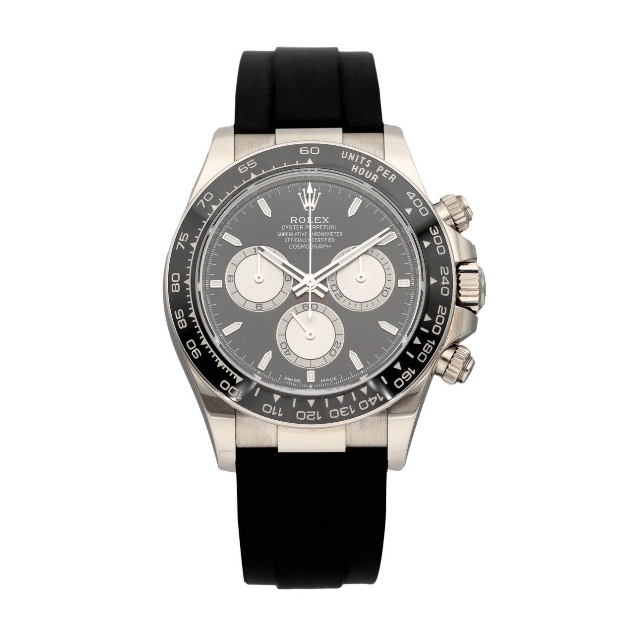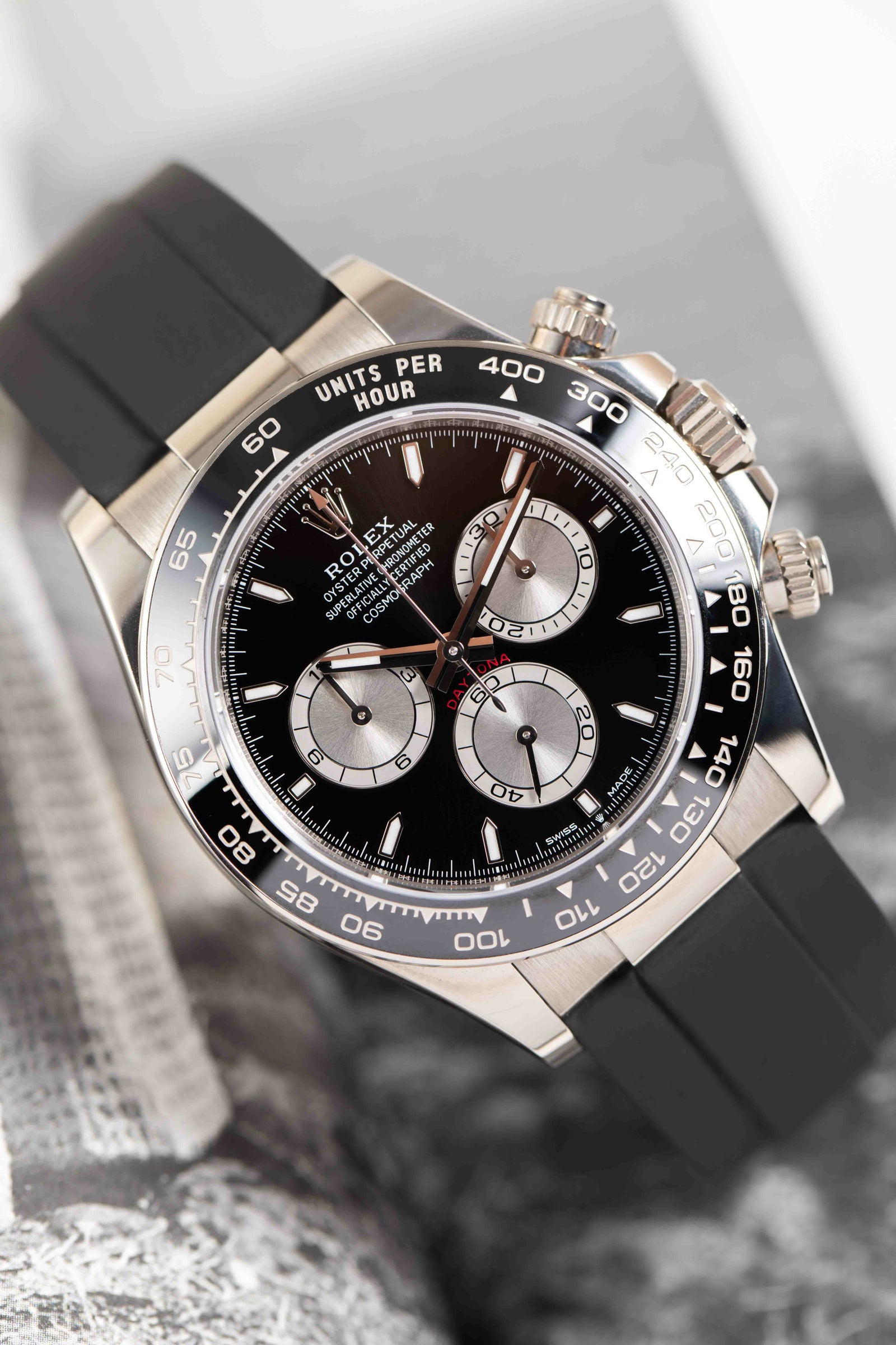 デイトナの中でも“ラグジュアリー感”と“締まりのあるスポーティさ”が両立した、とても完成度の高い一本です。ホワイトゴールドケースの上質さに、ブラックのセラクロムベゼルが効いていて、華やかなのに派手すぎず大人っぽくまとまるのが魅力。ブライトブラック&スチールの文字盤はコントラストが綺麗で、クロノグラフらしい立体感と視認性の良さもしっかり感じられます。写真より実物の質感が圧倒的に良いタイプで、腕に乗せた瞬間に「別格感」が伝わりやすいモデル。オンオフ問わず主役になってくれて、所有満足度も資産性も意識できるデイトナです。
