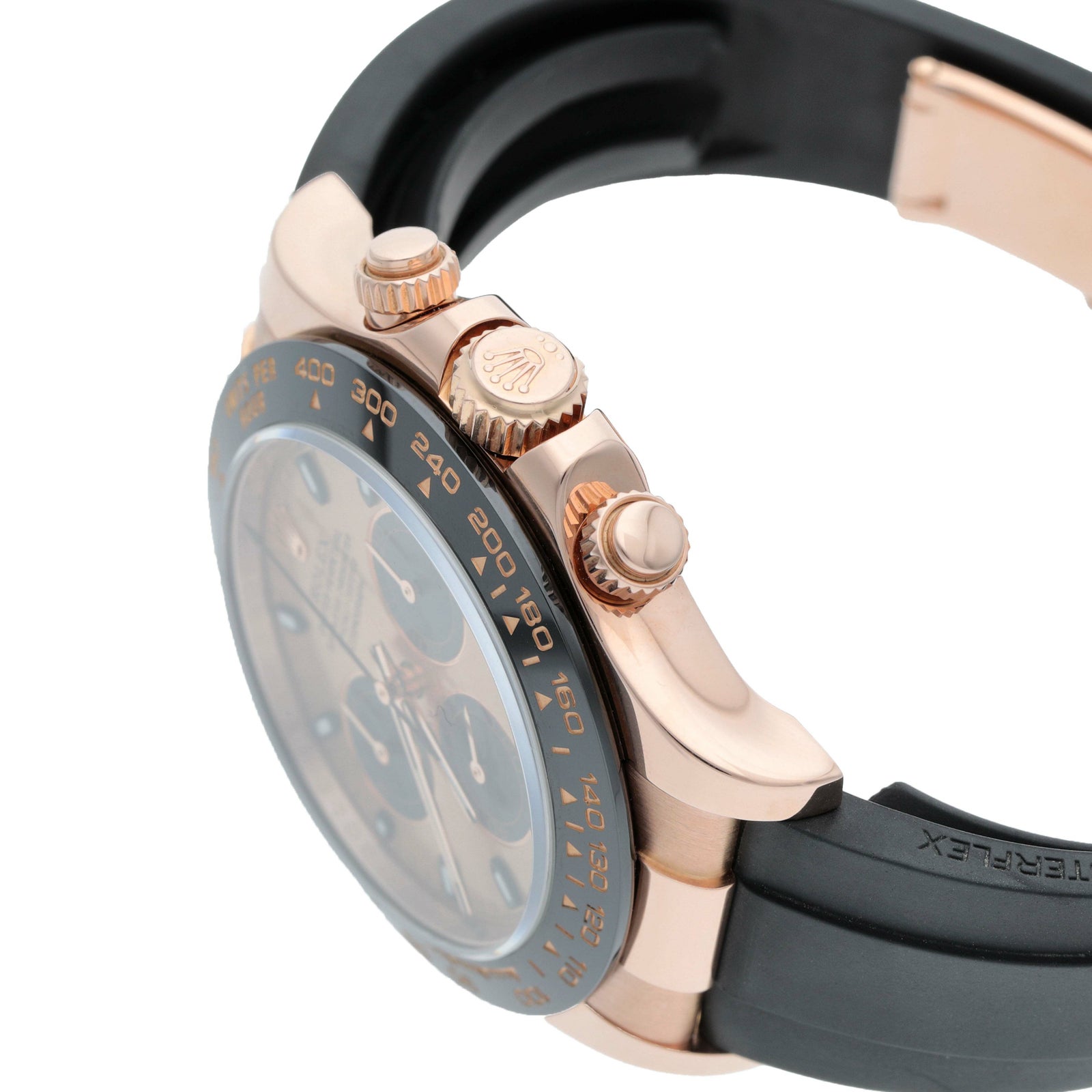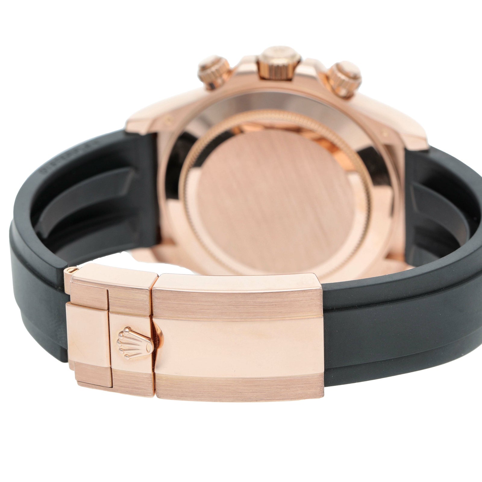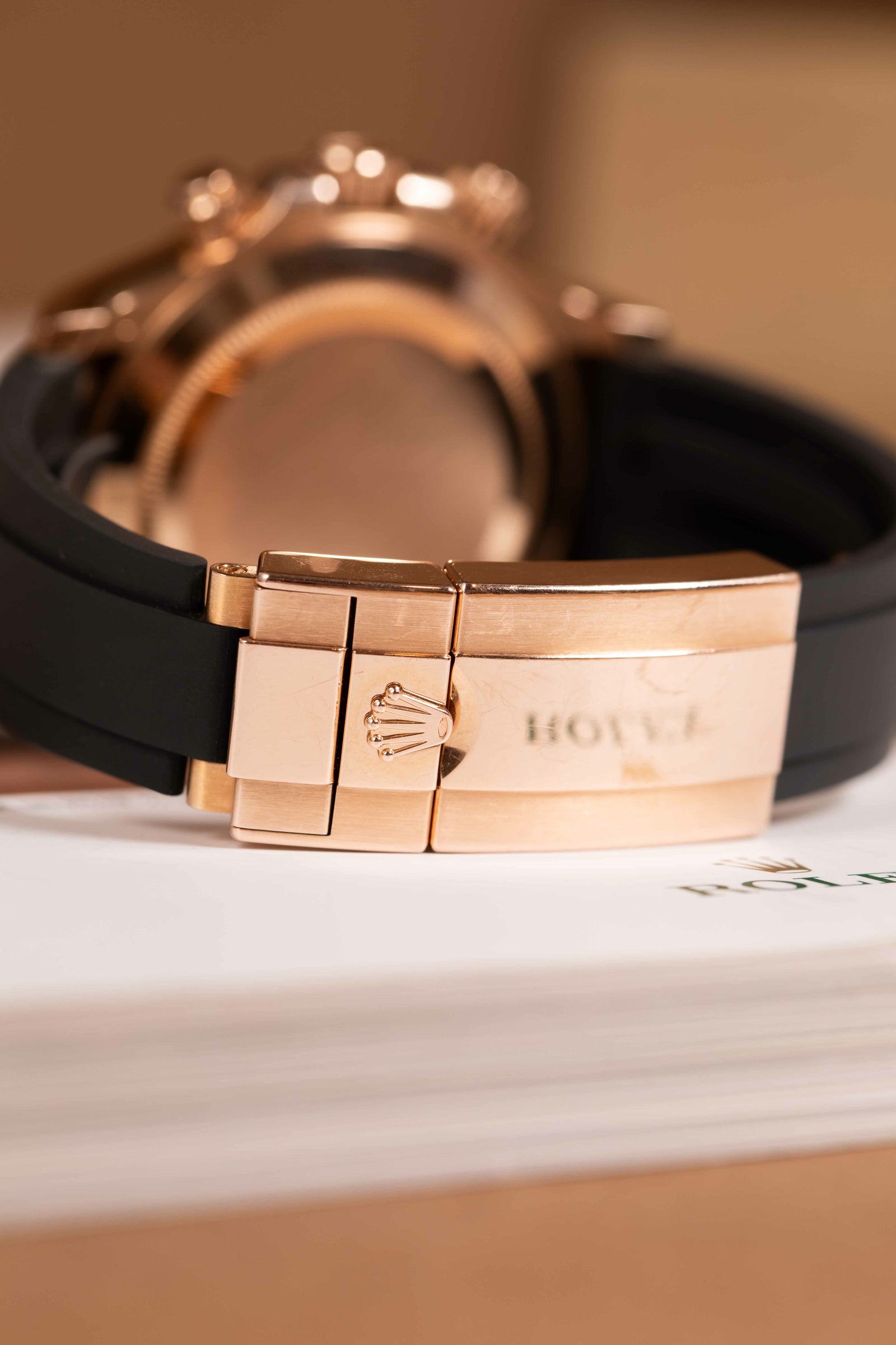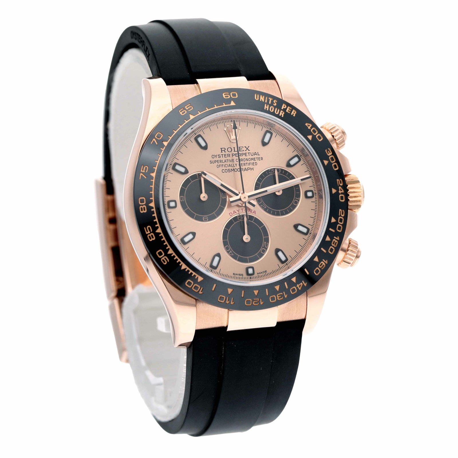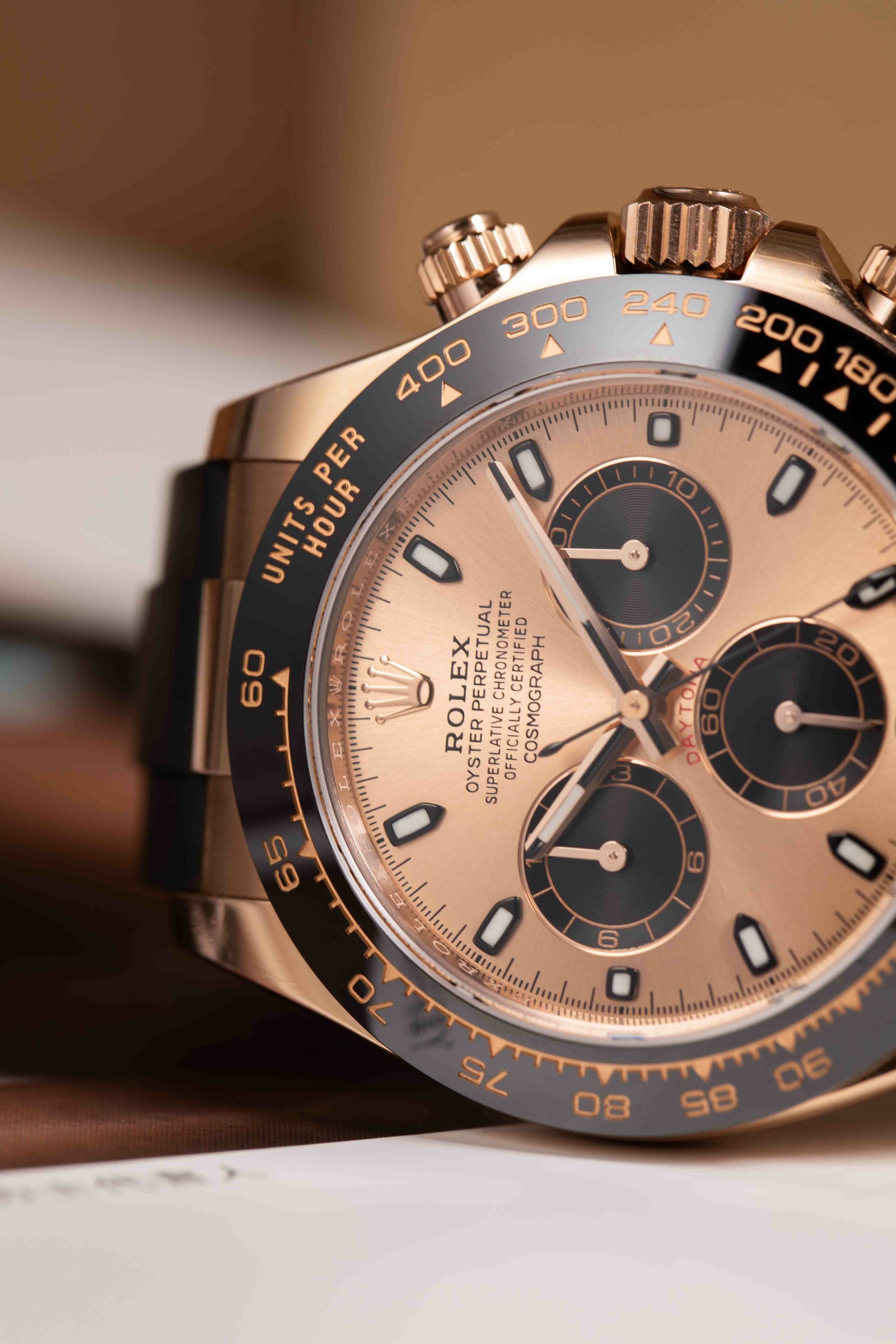 エバーローズゴールドの華やかさに、ブラックのセラクロムベゼルとオイスターフレックスブレスのスポーティさを組み合わせた、非常に完成度の高い一本です。ゴールドモデルでありながら重たく見えすぎず、黒が全体を引き締めてくれるので、ラグジュアリーなのに大人っぽくまとまるのが魅力。腕に乗せた瞬間に、デイトナらしい特別感と実用性のバランスの良さがしっかり伝わるモデルです。