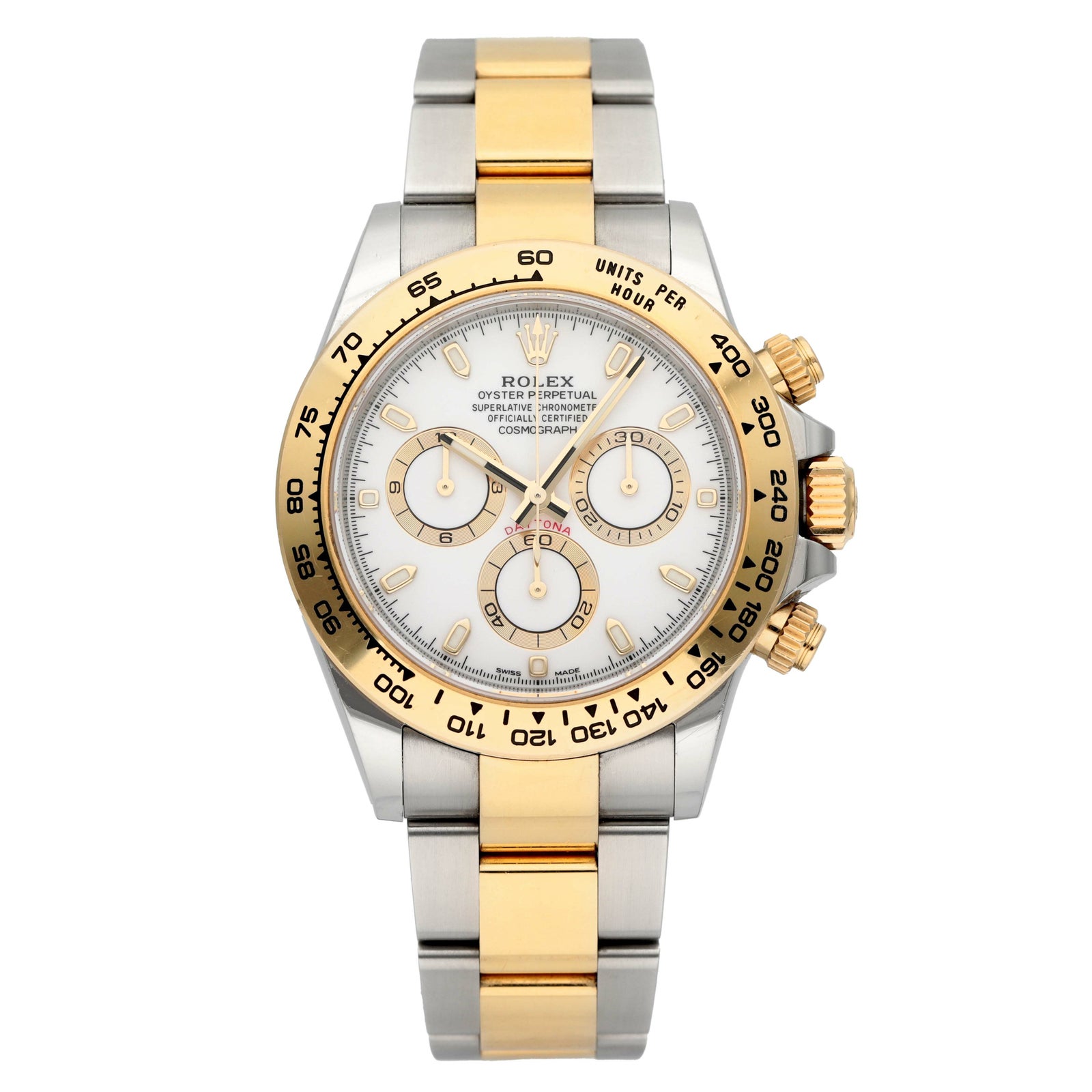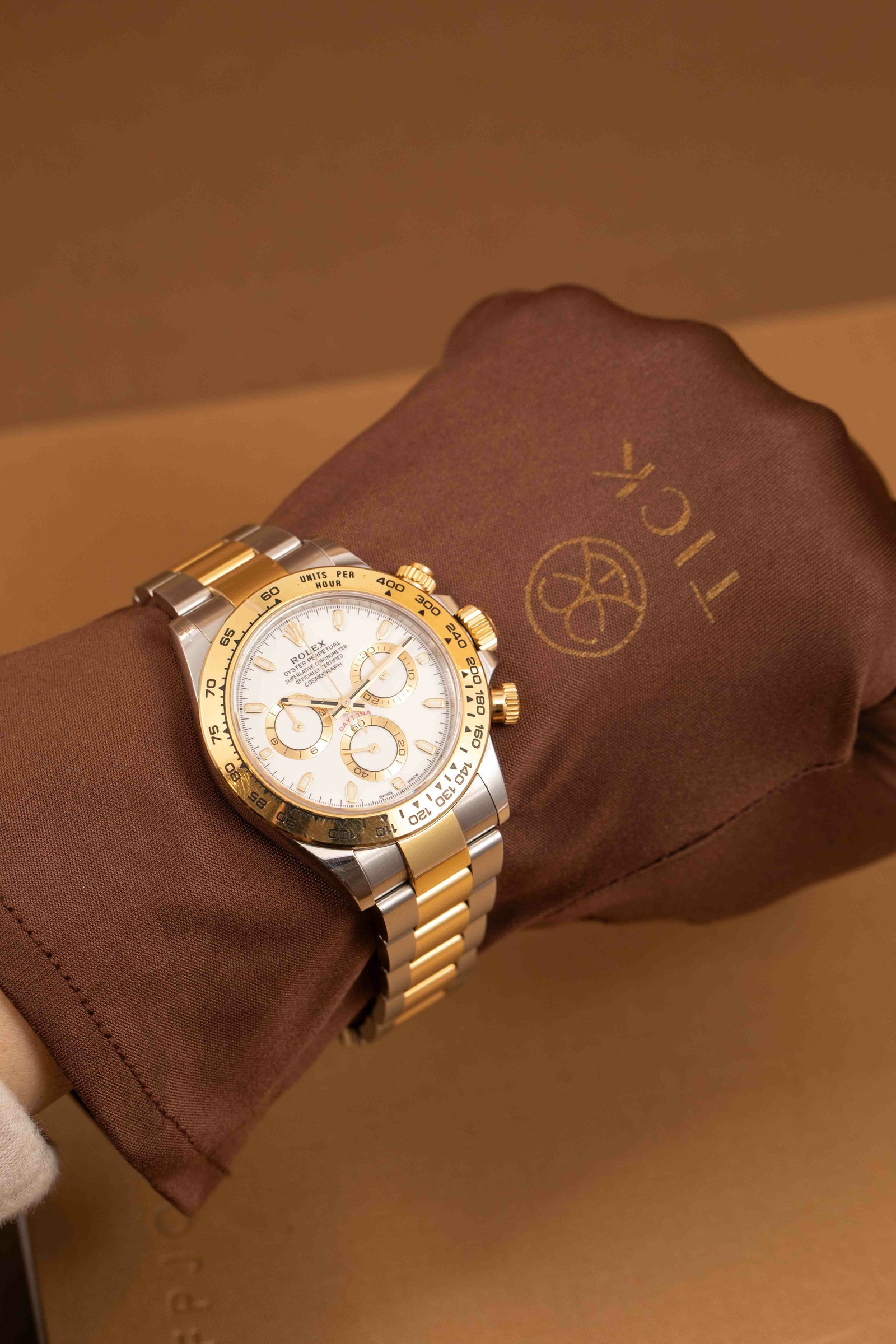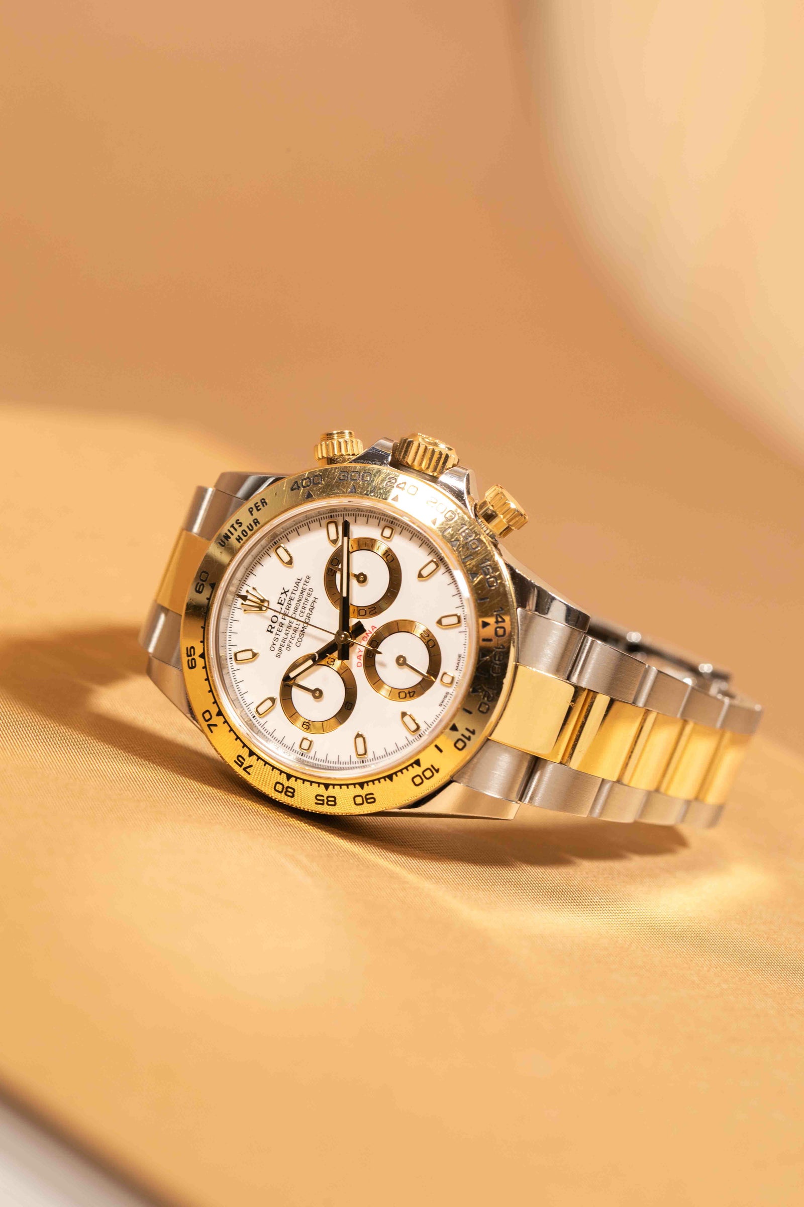 ロレックスを代表するクロノグラフ「コスモグラフ デイトナ」ステンレススチールと18ctイエローゴールドを組み合わせたコンビモデルは、スポーティさとラグジュアリーさを高次元で融合しています。 清潔感あふれる白文字盤にブラックインダイヤルのコントラストが映え、ダイヤなしならではの端正で飽きのこないデザインが魅力。 ビジネスからカジュアルまで幅広く活躍する、完成度の高い一本です。 ※全体的に線傷はありますが、あえてノンポリッシュの状態を保つことで、オリジナルの風合いと価値を大切にしています。