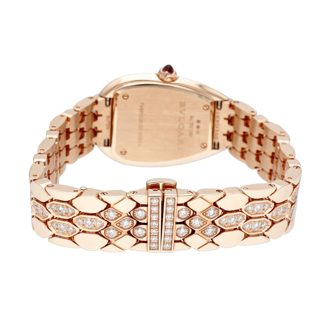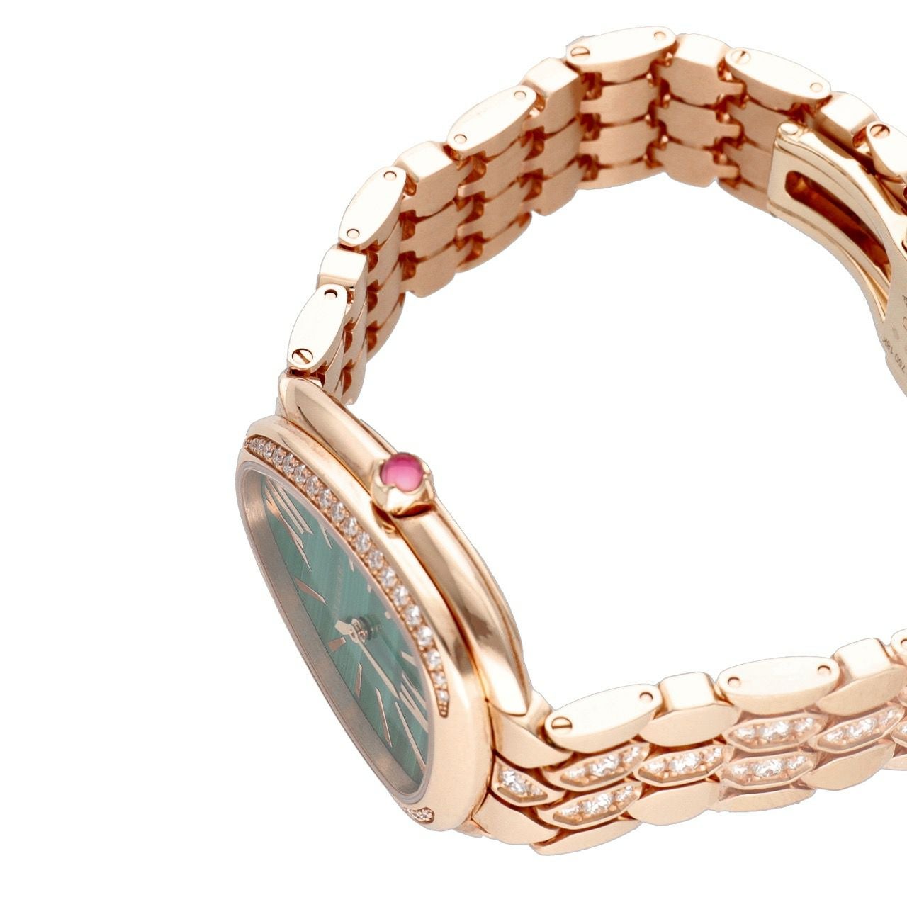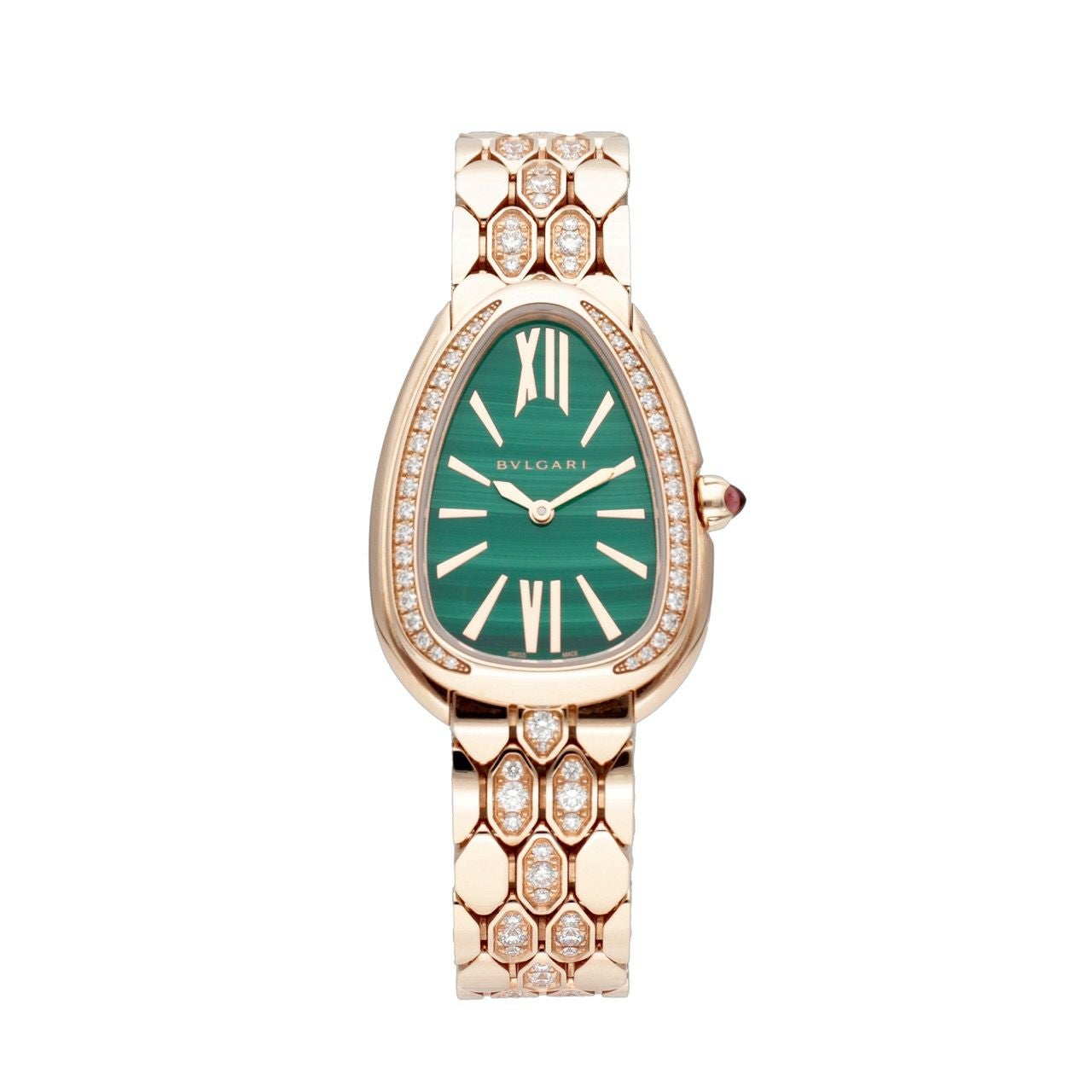蛇のしなやかさを“ジュエリーウォッチ”として完成させた、ひと目で華やぐハイエンドモデルです。33mmの18Kピンクゴールドケースに、ベゼルとブレスにはブリリアントカットダイヤを贅沢にセット。さらに文字盤は深いグリーンが美しいマラカイト(孔雀石)で、光の入り方で表情が変わり、上品なのにしっかり特別感が出ます。リューズにはピンクルベライトのカボションが入り、細部まで“ブルガリらしさ”が濃いのも魅力。ムーブメントはクオーツで扱いやすく、30m防水なので、会食やパーティーはもちろん普段の装いの格上げにも使いやすい一本です。