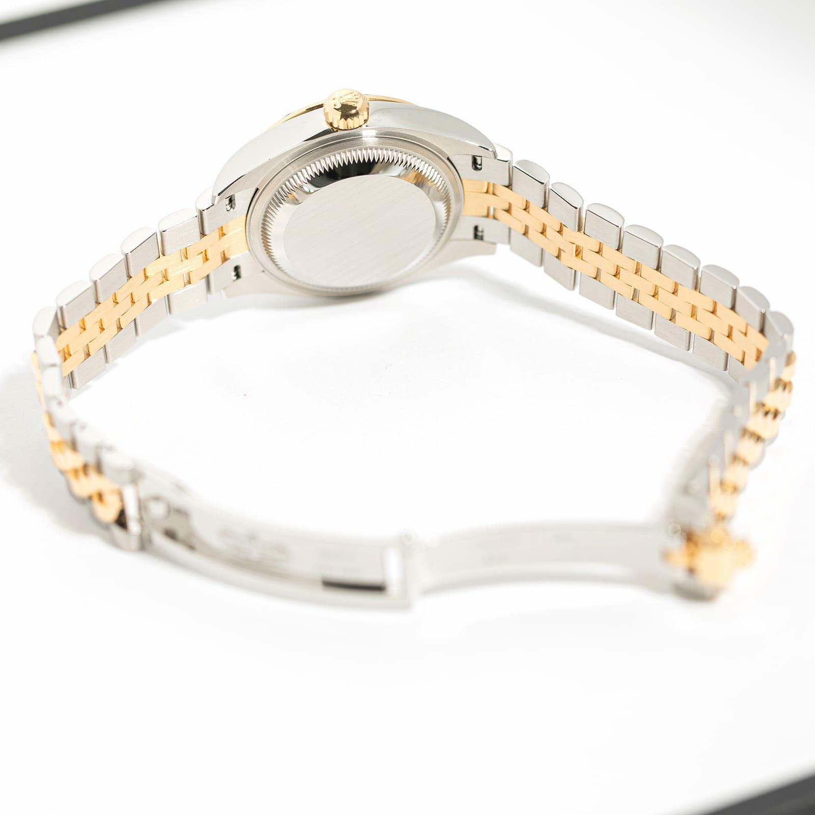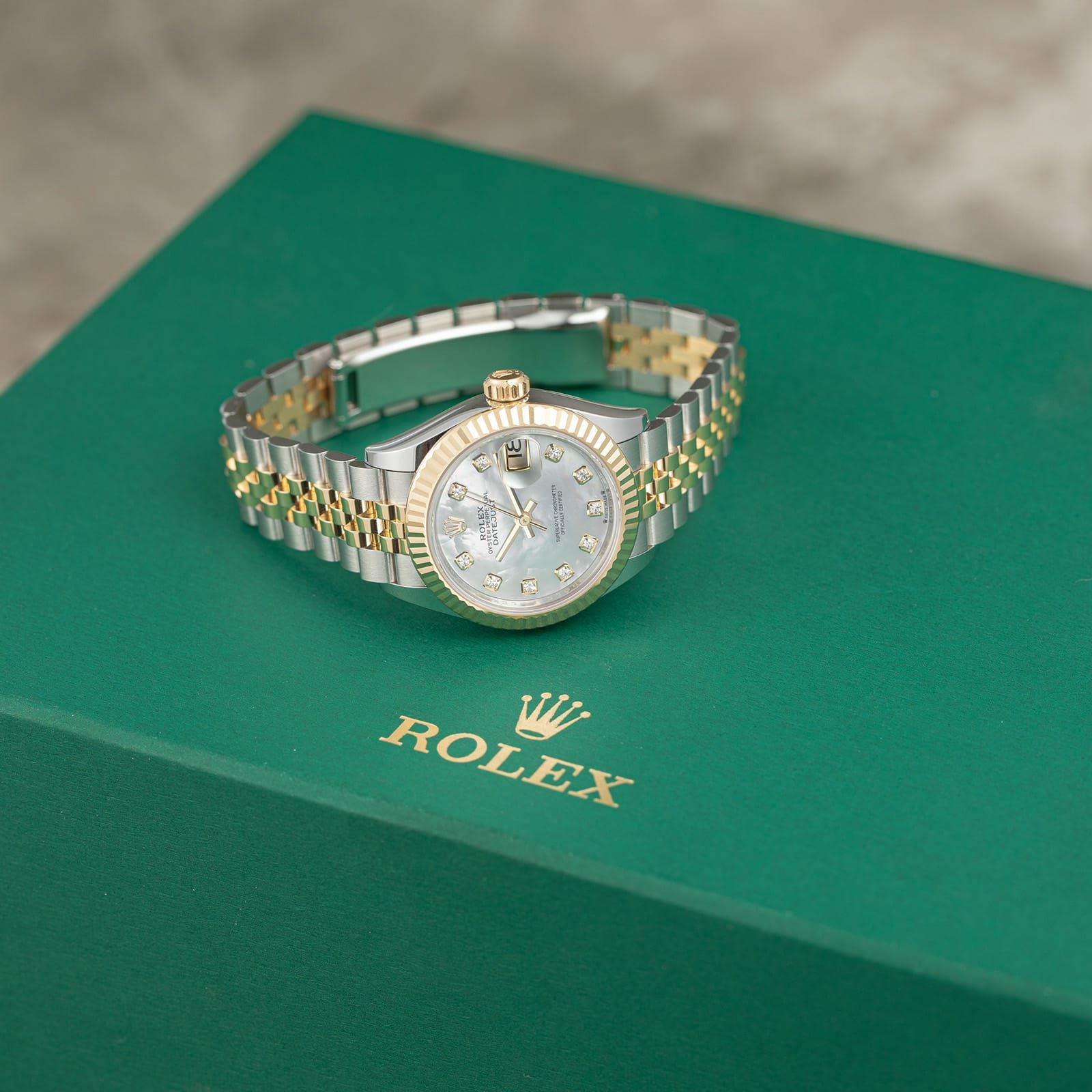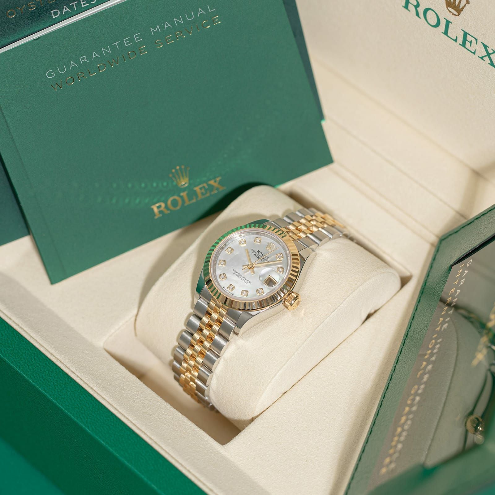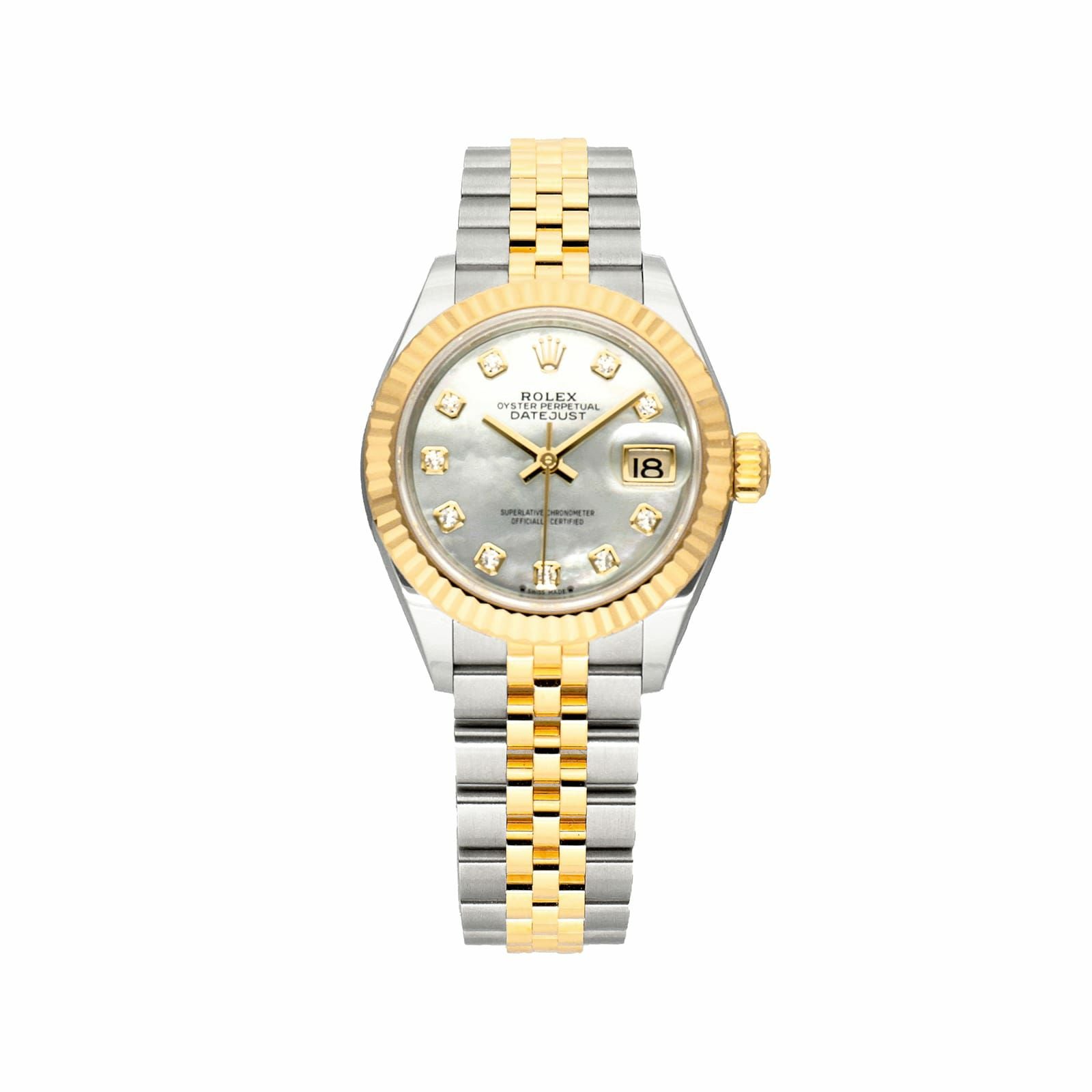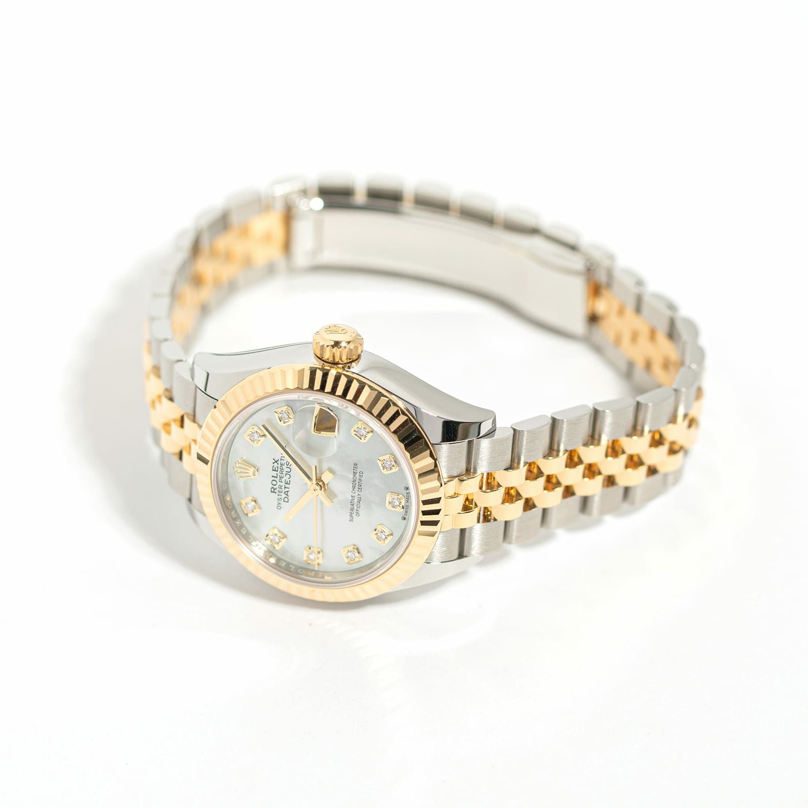 ステンレス×イエローゴールドの上品な華やかさに、フルーテッドベゼルのきらめきが映える“王道のレディスロレゾール”です。文字盤はホワイトのマザーオブパールで、角度によって光沢が変わるのが魅力。さらに10Pダイヤインデックスが入ることで、派手すぎずに手元がぱっと明るく見えます。ブレスはジュビリーブレスで肌なじみがよく、きれいめにも普段使いにも合わせやすい一本です。