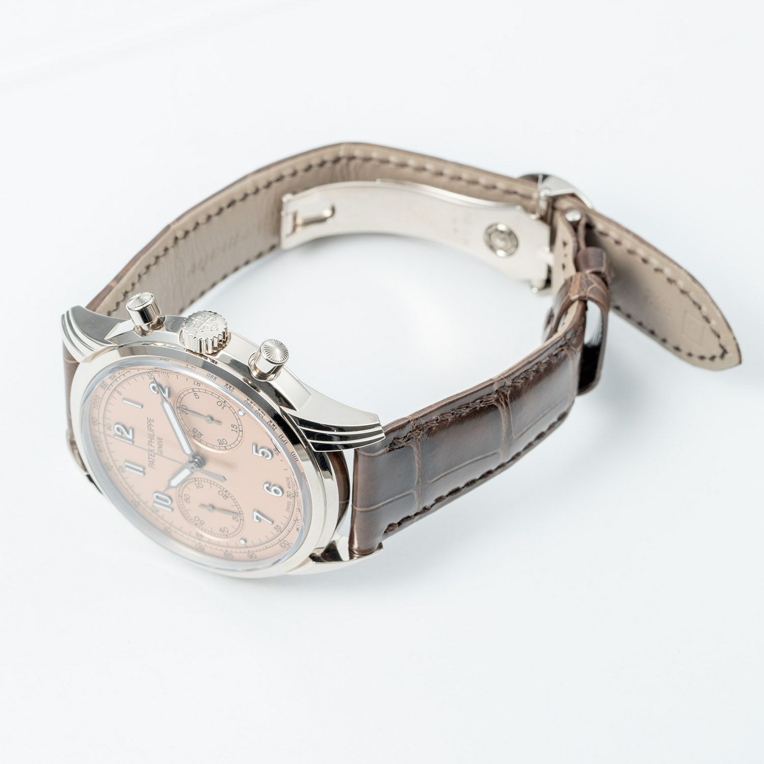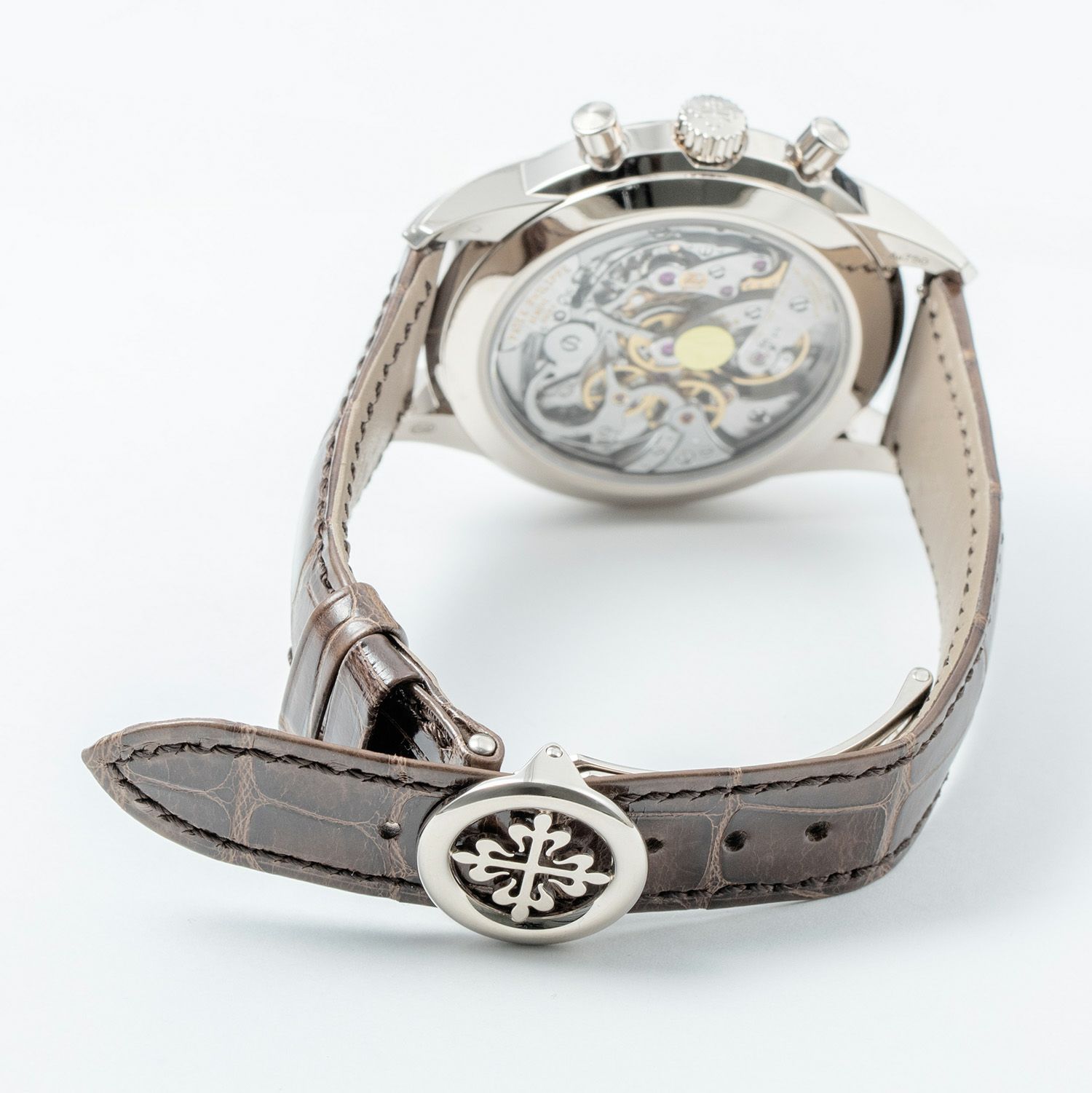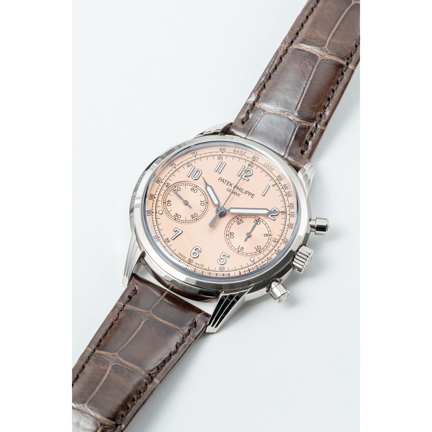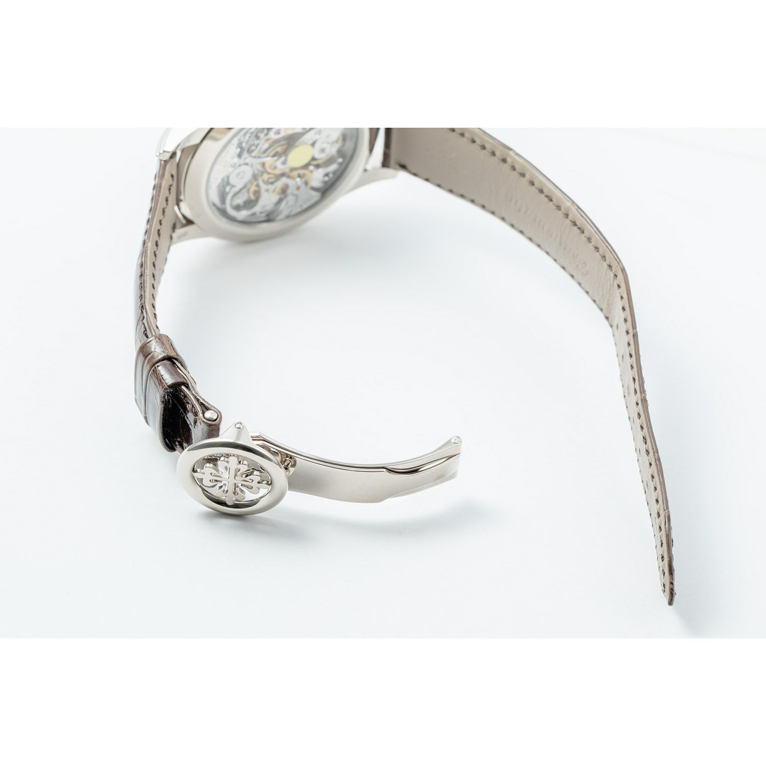 2022年に登場した「5172G-010」は、生産終了となった手巻式クロノグラフ「5170」の後継機です。 ケースサイズが41mmと2mm大きくなり、クロノグラフのプッシャーは角型から丸型へと洗練されたデザインに進化しました。 ローズゴールドメッキのオパーリン文字盤に、ホワイトゴールド製のアラビア数字インデックスが際立ち、高級感をさらに引き立てます。 裏蓋からは美しいムーブメントの動きを堪能でき、アリゲーターストラップとホワイトゴールド製のバックルが、腕元にさらなるエレガンスを加えます。 ※状態は新品ですが、保証書が無い為、未使用扱いとしています。