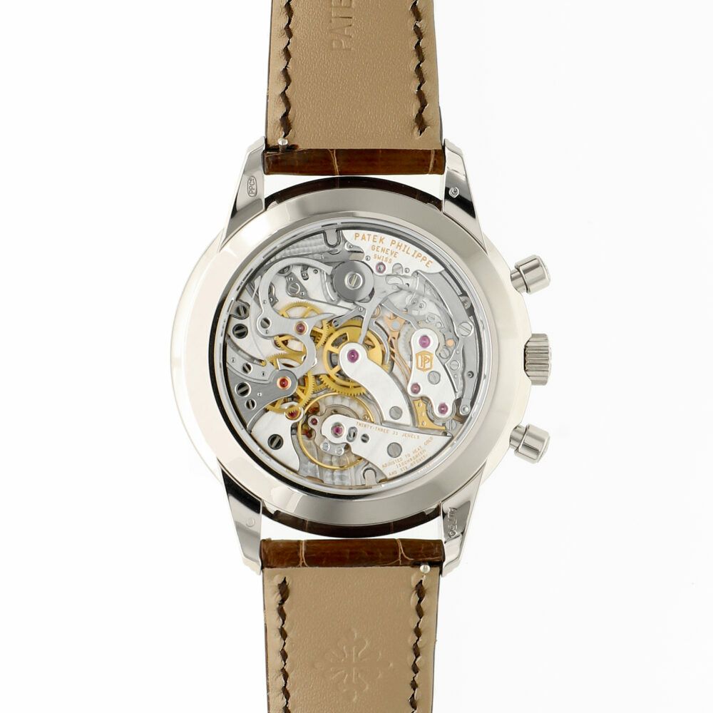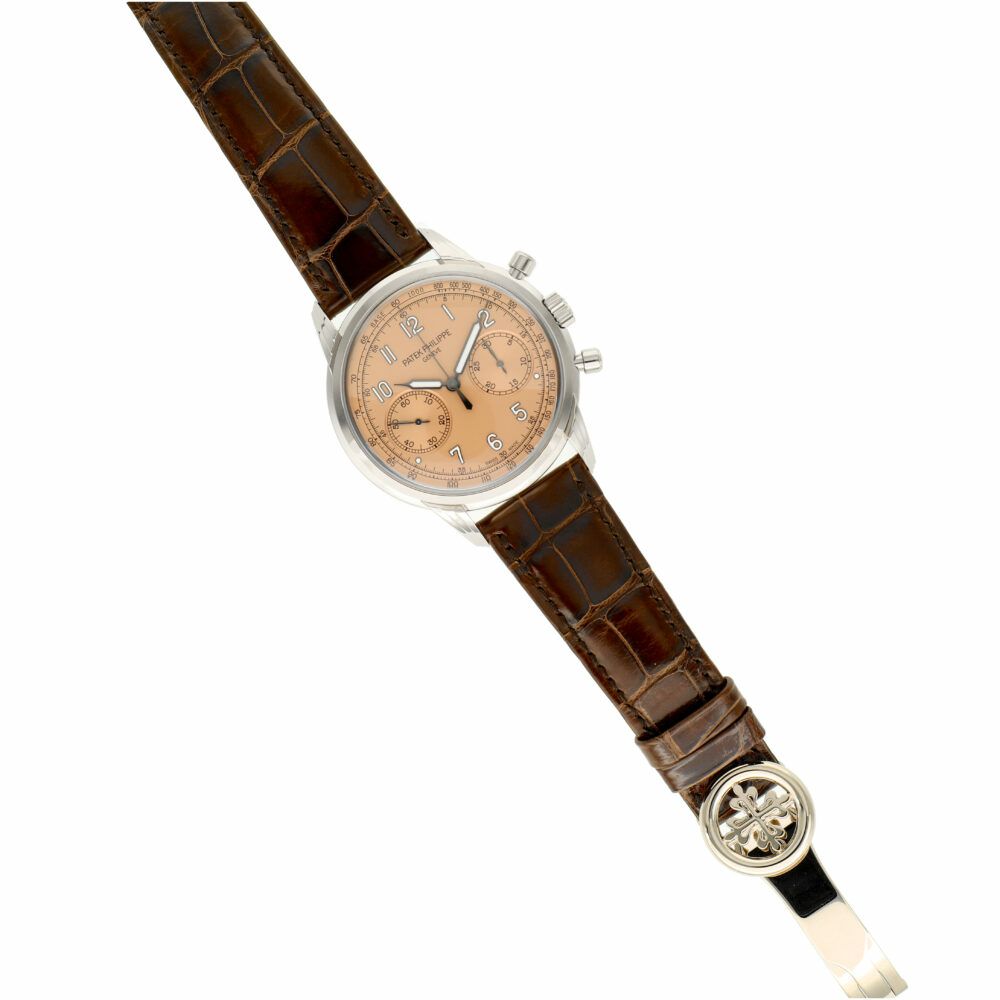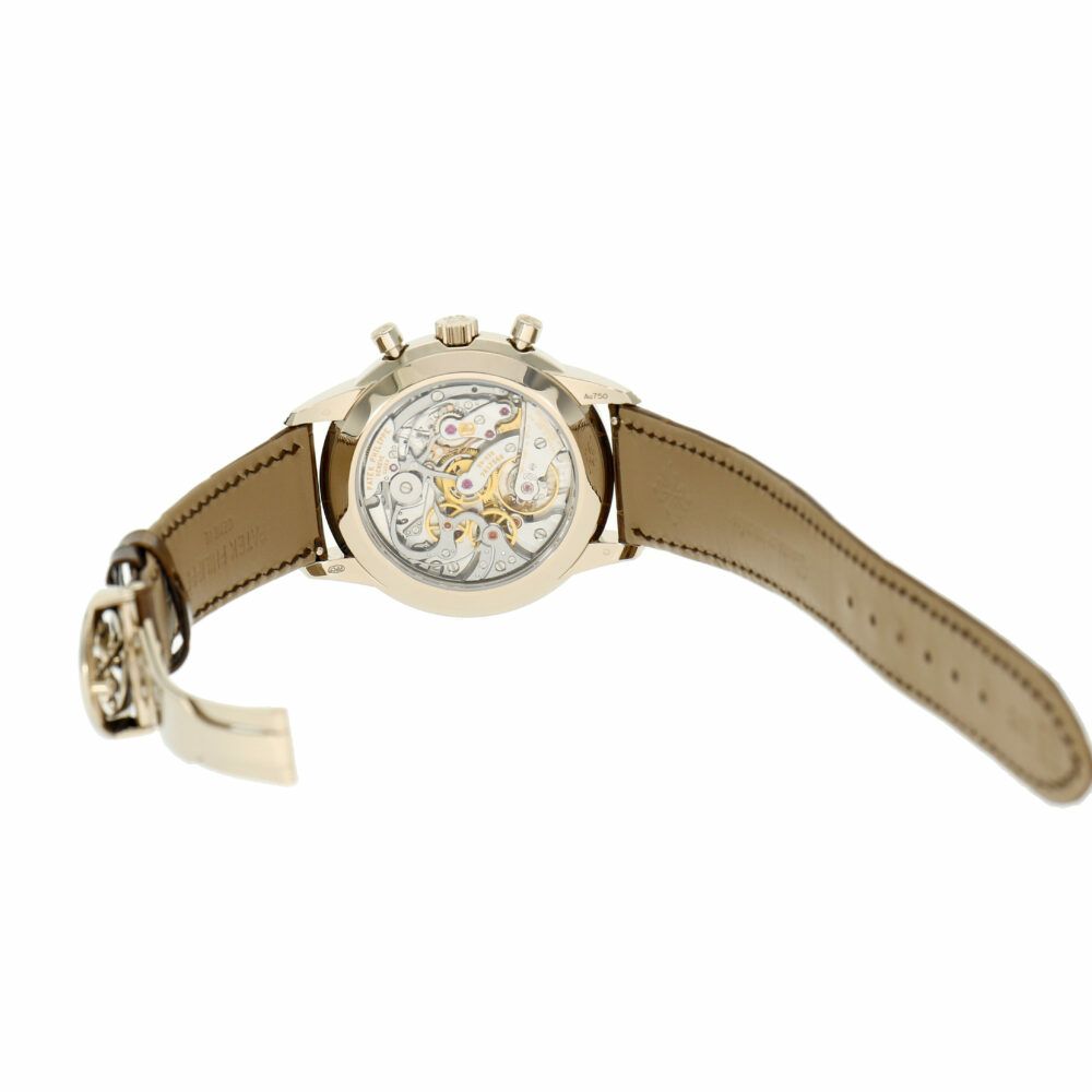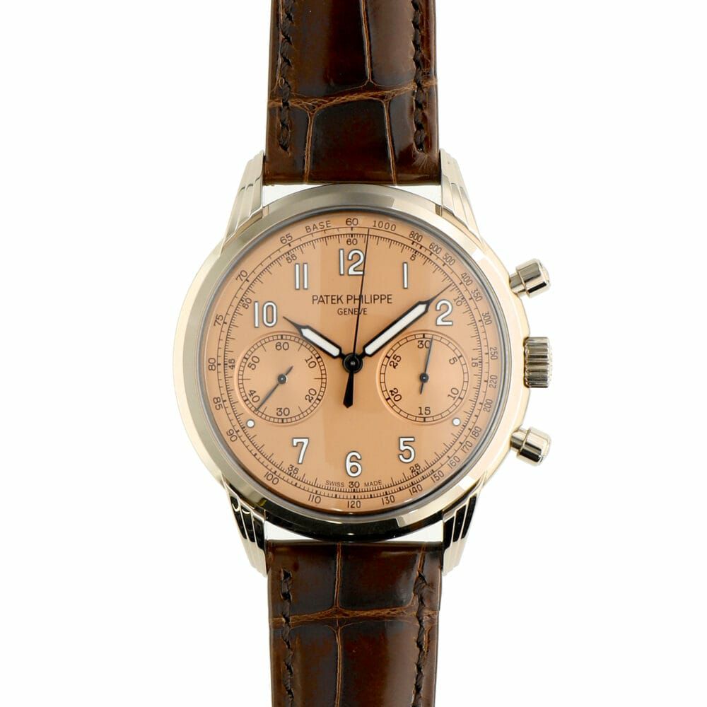 2022年に登場した「5172G-010」は、生産終了となった手巻式クロノグラフ「5170」の後継機です。 ケースサイズが41mmと2mm大きくなり、クロノグラフのプッシャーは角型から丸型へと洗練されたデザインに進化しました。 ローズゴールドメッキのオパーリン文字盤に、ホワイトゴールド製のアラビア数字インデックスが際立ち、高級感をさらに引き立てます。 裏蓋からは美しいムーブメントの動きを堪能でき、アリゲーターストラップとホワイトゴールド製のバックルが、腕元にさらなるエレガンスを加えます。 ※状態は新品ですが、保証書が無い為、未使用扱いとしています。
