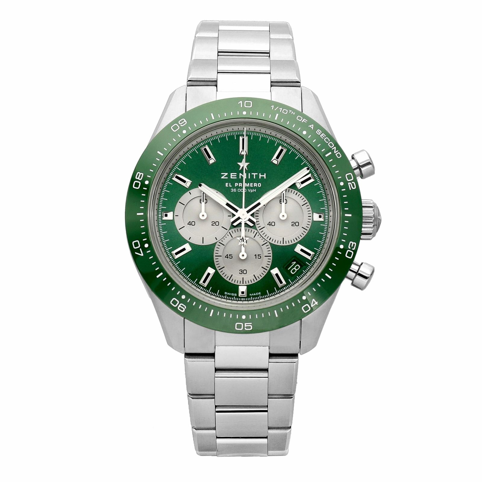 ゼニスの人気シリーズ、クロノマスター スポーツをベースとした正規代理店ヨシダ限定のモデルです。 グリーンラッカー文字盤にシルバーのインダイヤルと鮮やかな色合いが特徴的な文字盤です。 ブレスはセンター部分が鏡面になった高級感に溢れたデザインとなっています。 シースルーになった裏蓋からはゼニスを代表するエルプリメロムーブメントを楽しむことができます。 パワーリザーブは約60時間です。 日常の装いから特別な場面まで幅広く対応し、時を超えた魅力を放つ時計です。